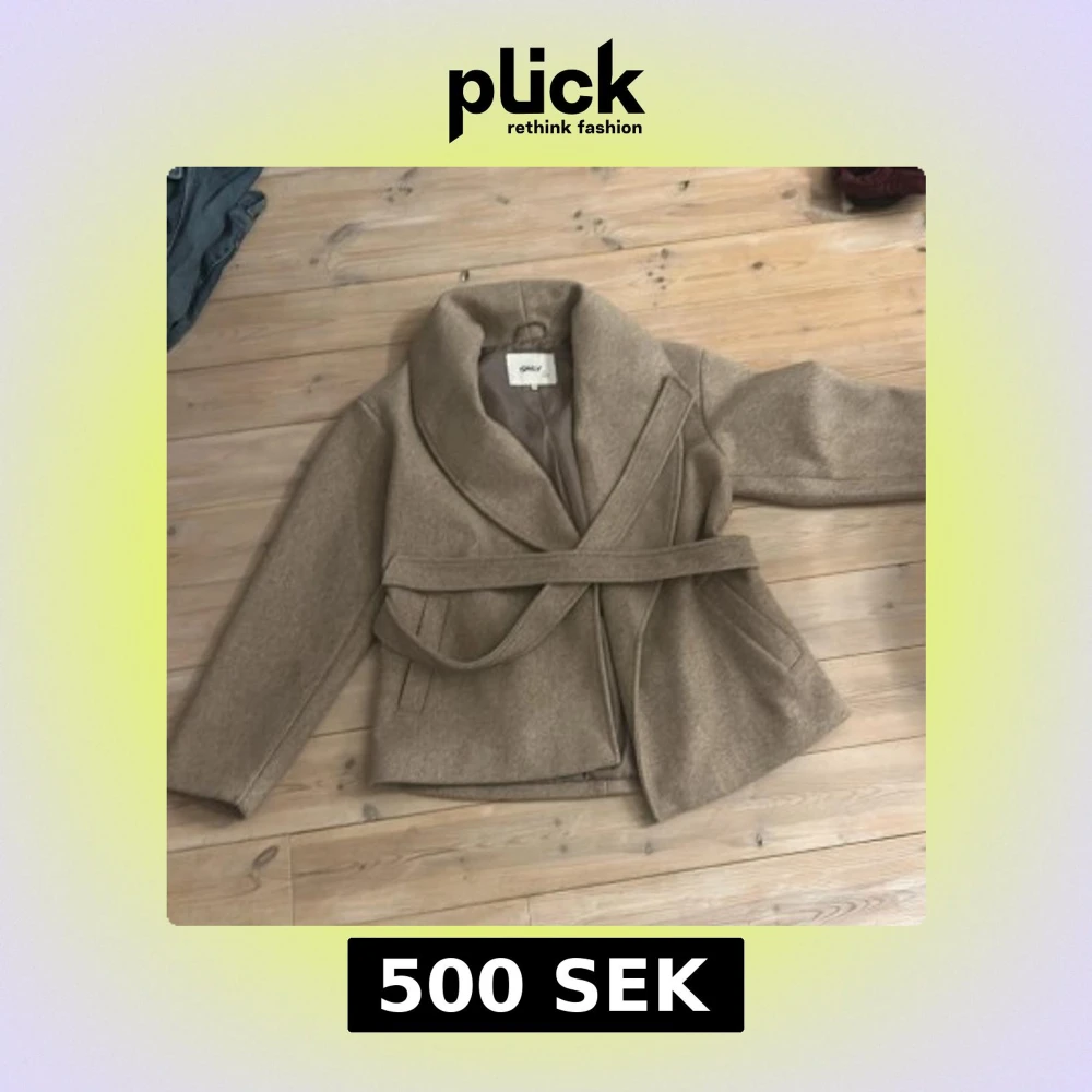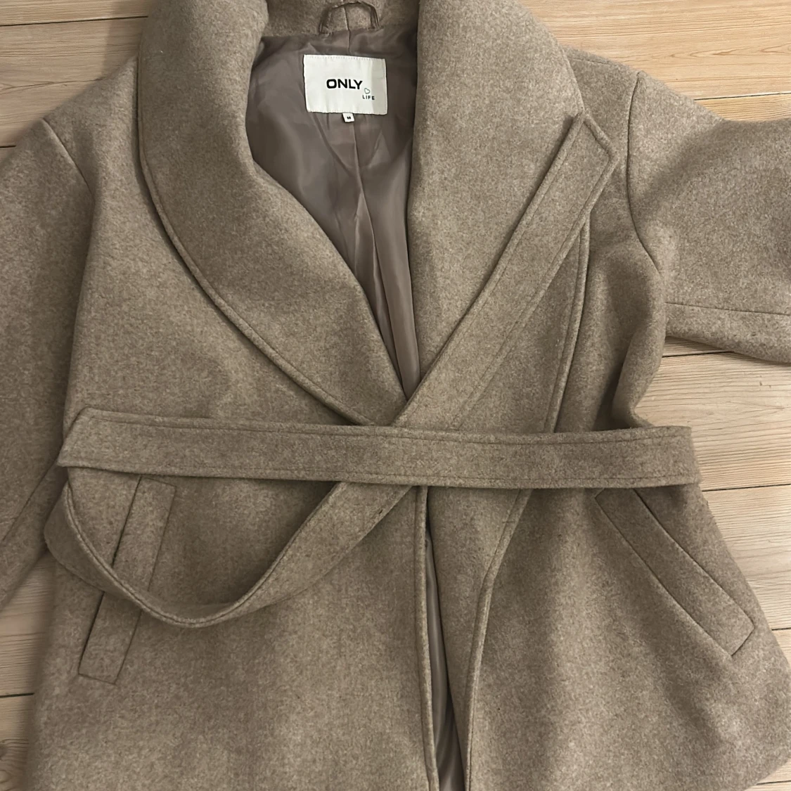 Snygg beige kappa från ONLY med bred krage och knytskärp i midjan. Jackan har två fickor framtill och är fodrad på insidan. Perfekt för dig som vill ha en stilren och trendig look under kyligare dagar.