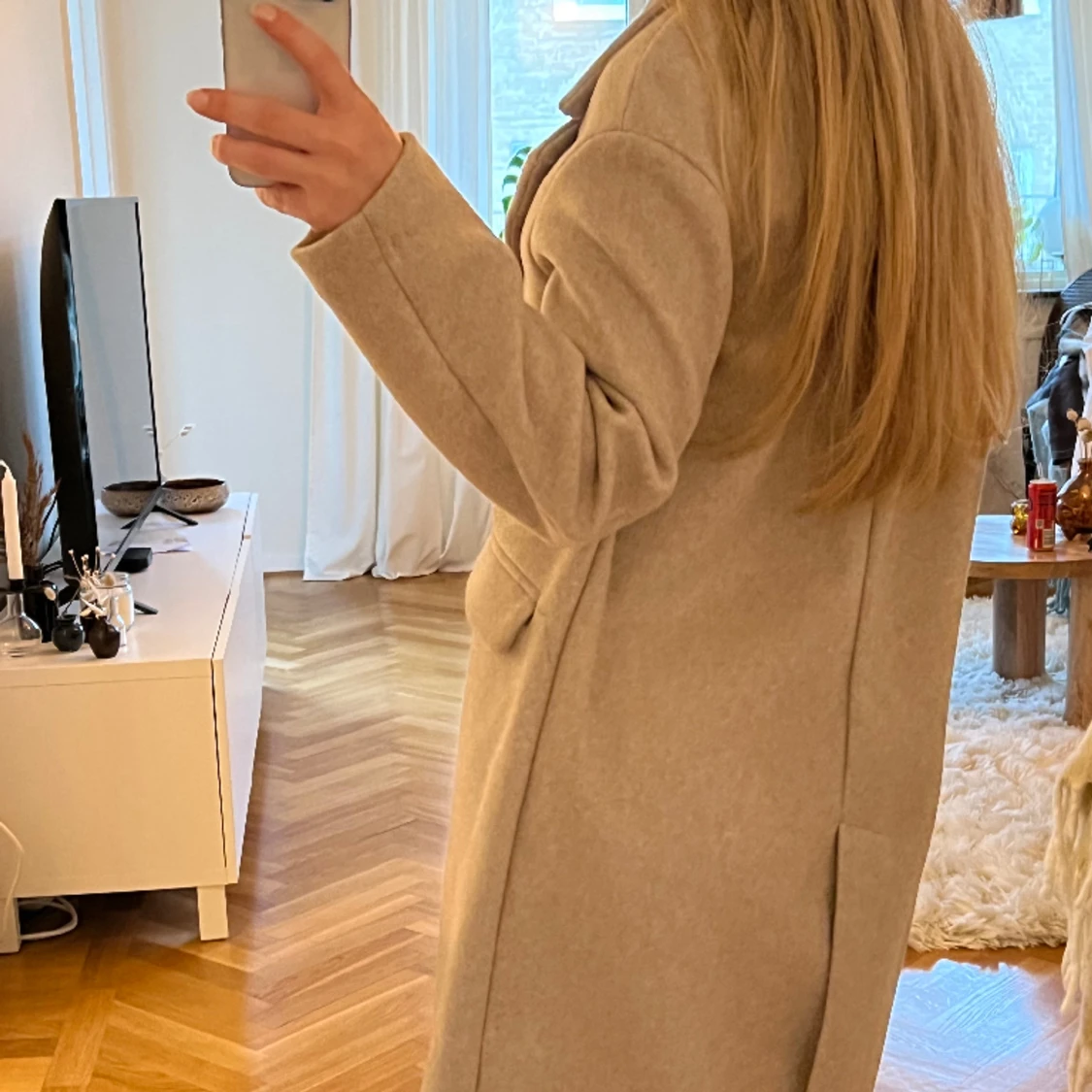 Lång beige kappa från BERSHKA. Aldrig använd, fickor fortfrande osprättade. Storlek XS. 300:- ex frakt.