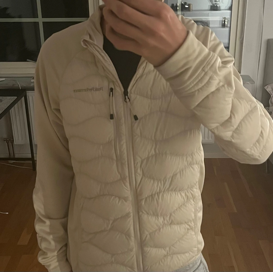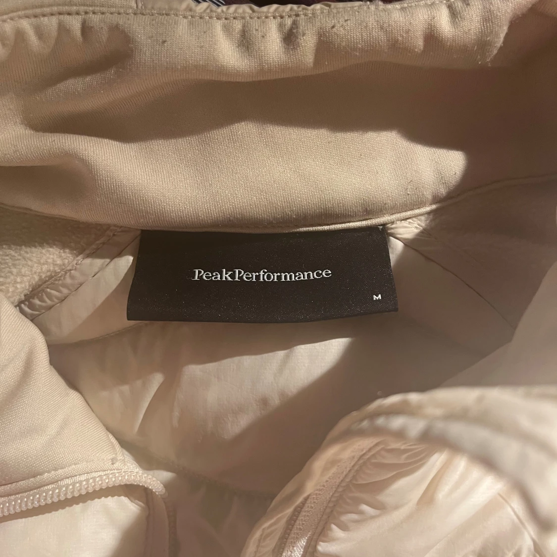Snygg beige pufferjacka från Peak Performance i storlek M. Jackan har quiltad framsida, dragkedja och hög krage. Materialet är syntet och polyester, perfekt för kyliga dagar. Stilren design med diskret logga på bröstet och långärmade ärmar.