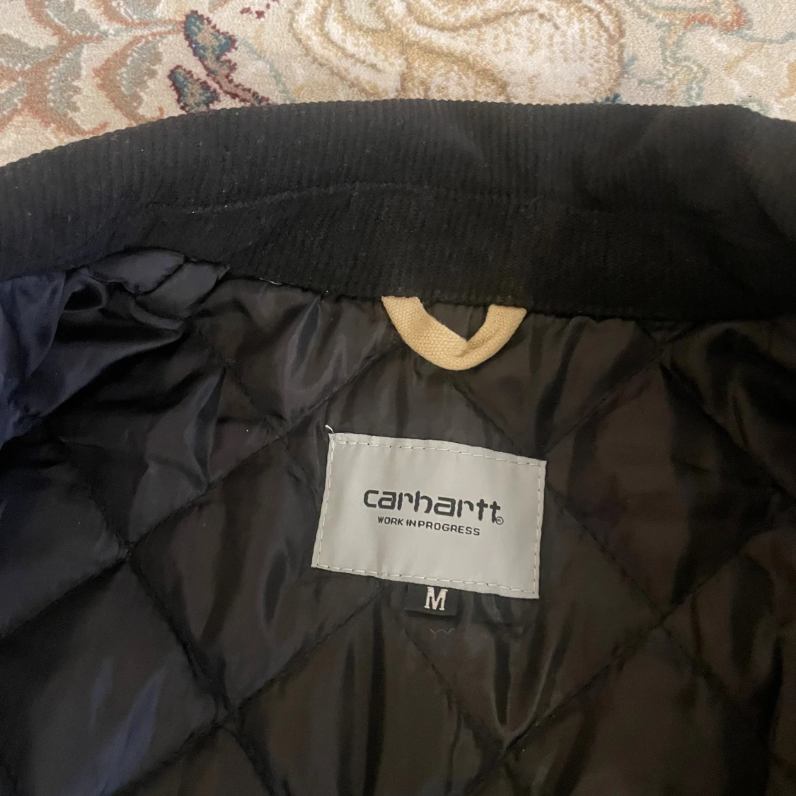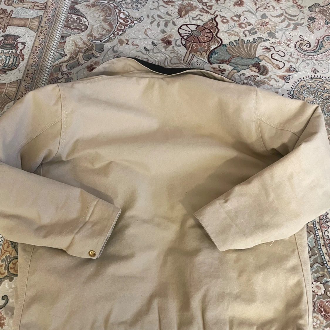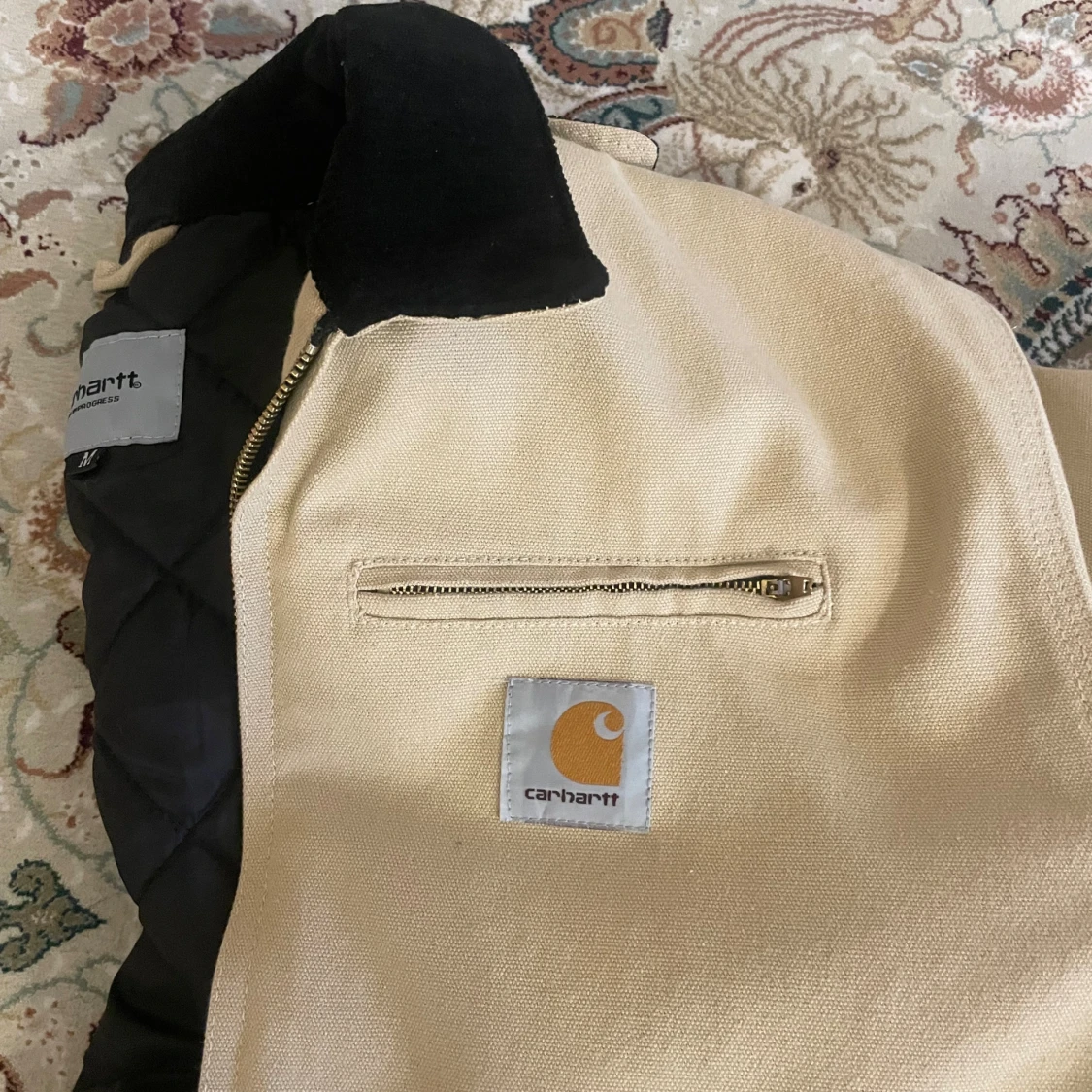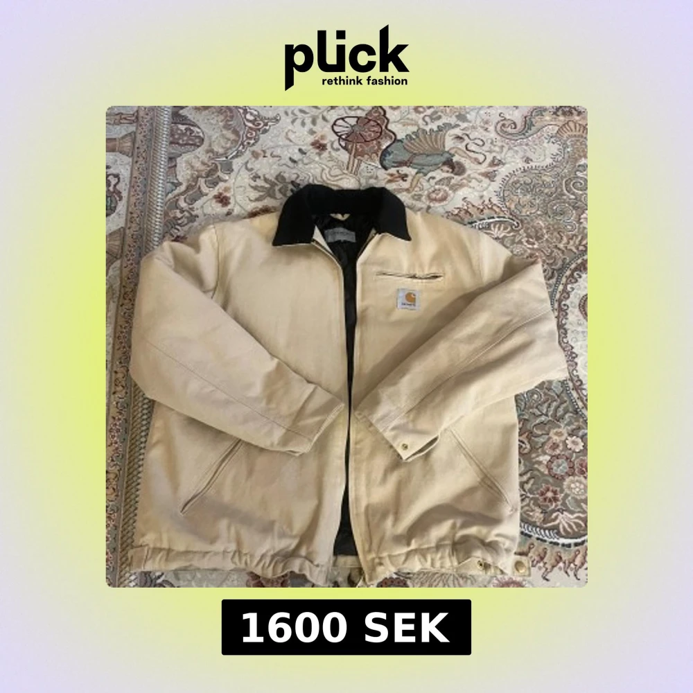Säljer en beige Carhartt Detroit Jacket i storlek M. Jackan har svart krage i manchester och klassisk Carhartt-logga på bröstet. Yttertyget är slitstarkt och jackan har dragkedja framtill samt flera fickor.