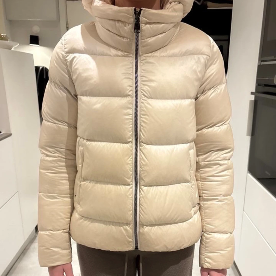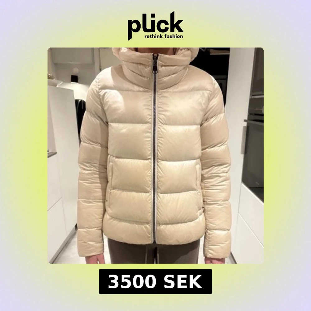 Säljer en beige pufferjacka från Colmar Originals med huva och raka, quiltade paneler. Jackan har dragkedja framtill, två sidofickor med dragkedja och Colmar-logga på ärmen. Perfekt för kalla dagar och har en clean, modern look.