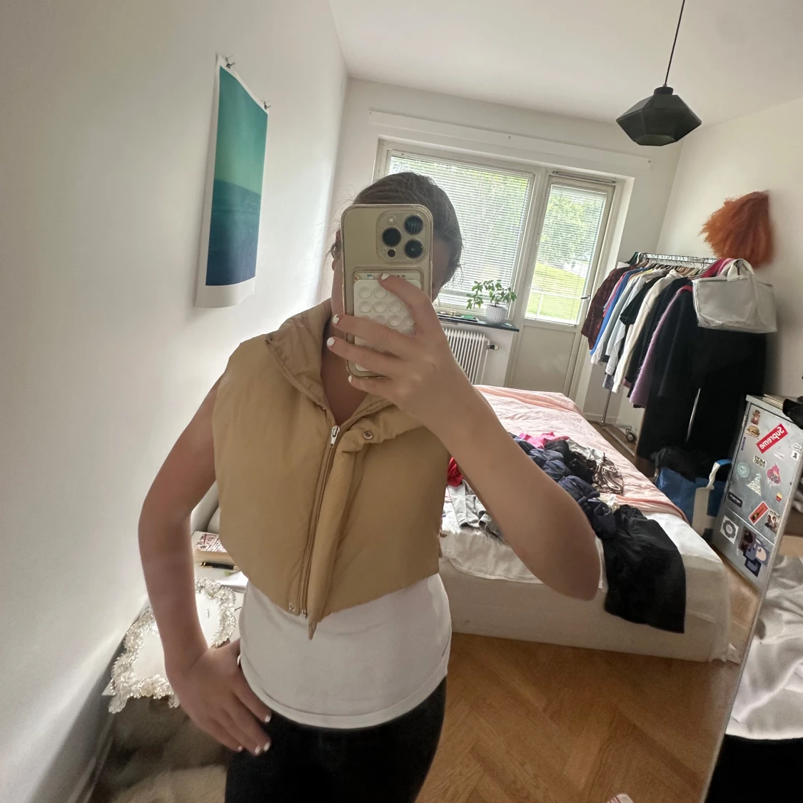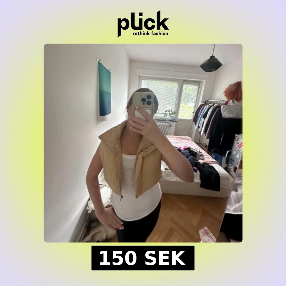 Säljer en beige croppad dunväst med hög krage och dragkedja framtill. Västen har en enkel och clean look, perfekt att slänga över en hoodie eller t-shirt. Den är lätt vadderad och har en snygg, boxig passform.