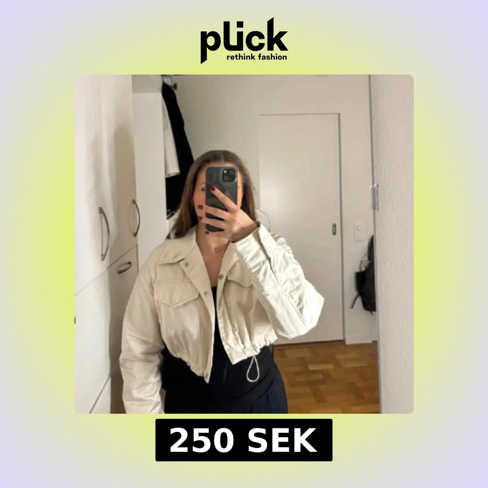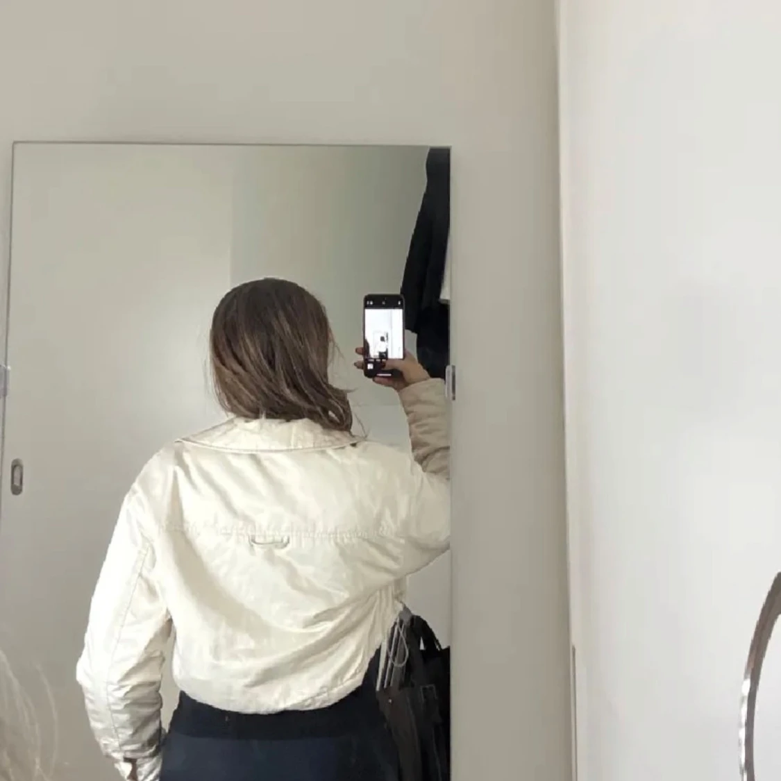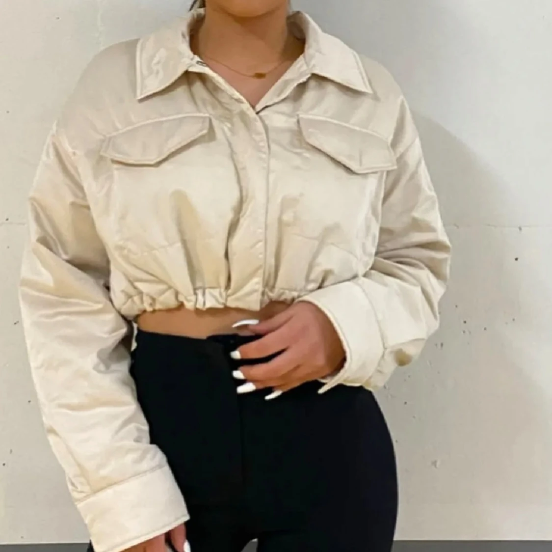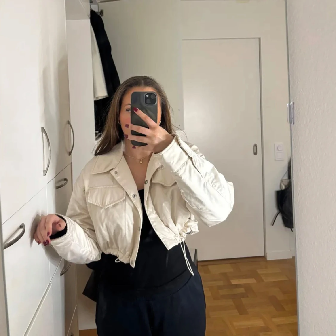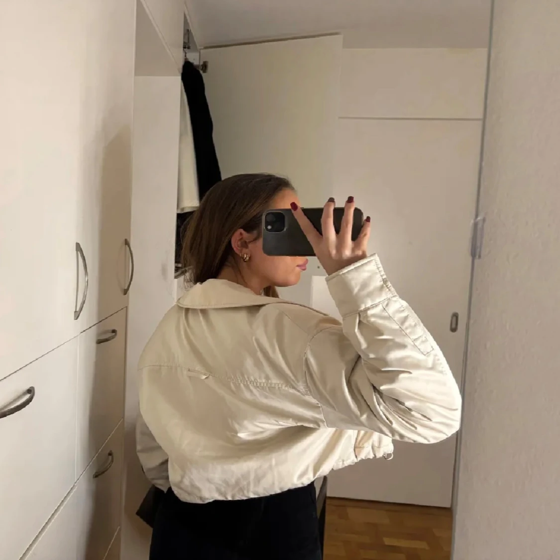 Snygg beige croppad jacka med långa ärmar och knappar samt två fickor framtill. Jackan är från Zara och är beige/cremefärgad. Den går att spänna till längst ner beroende på hur tajt/puffig du vill att den ska sitta. Använd fåtal gånger!