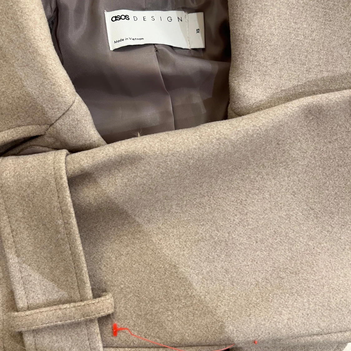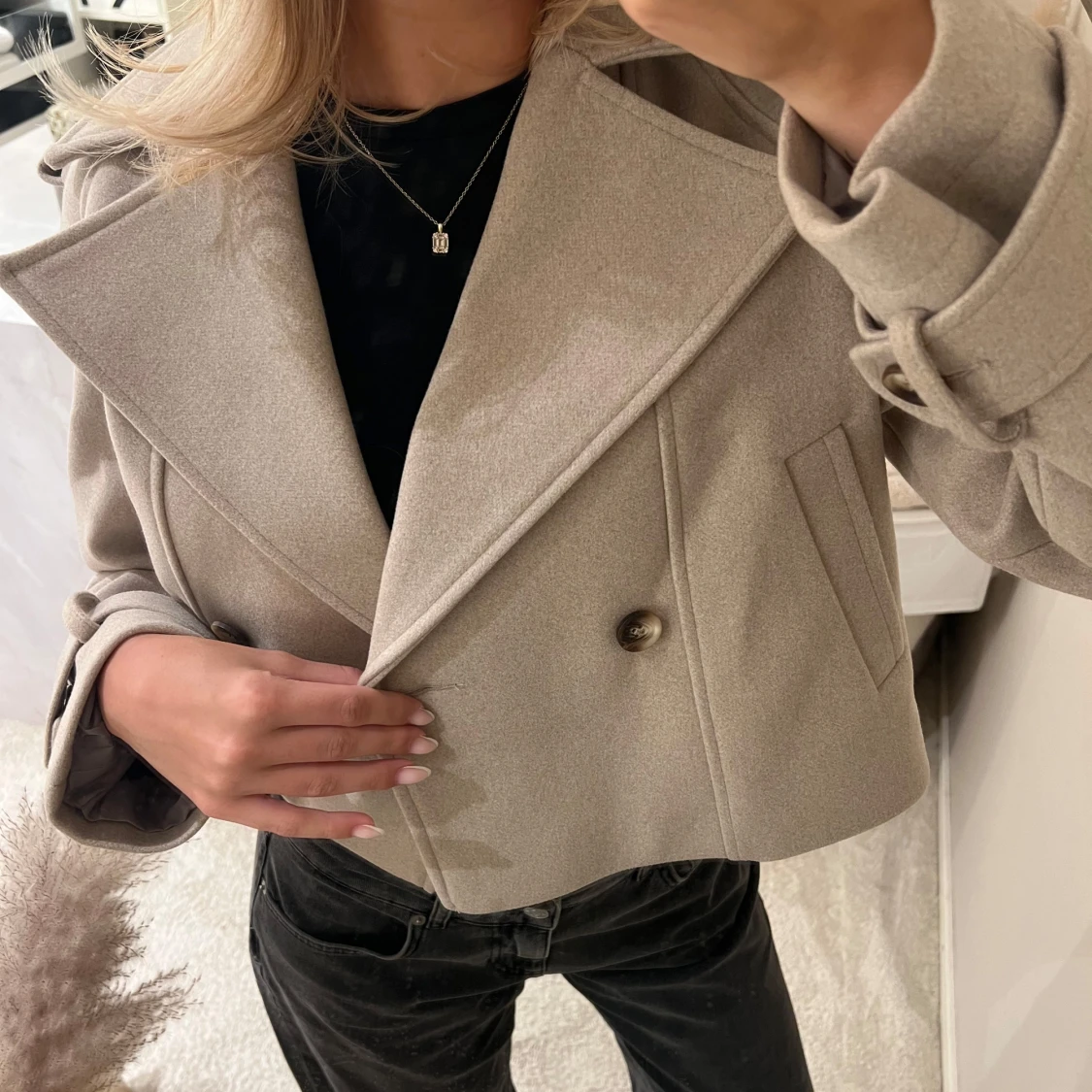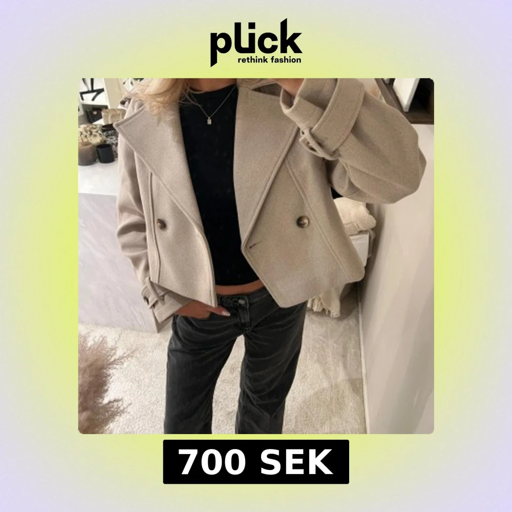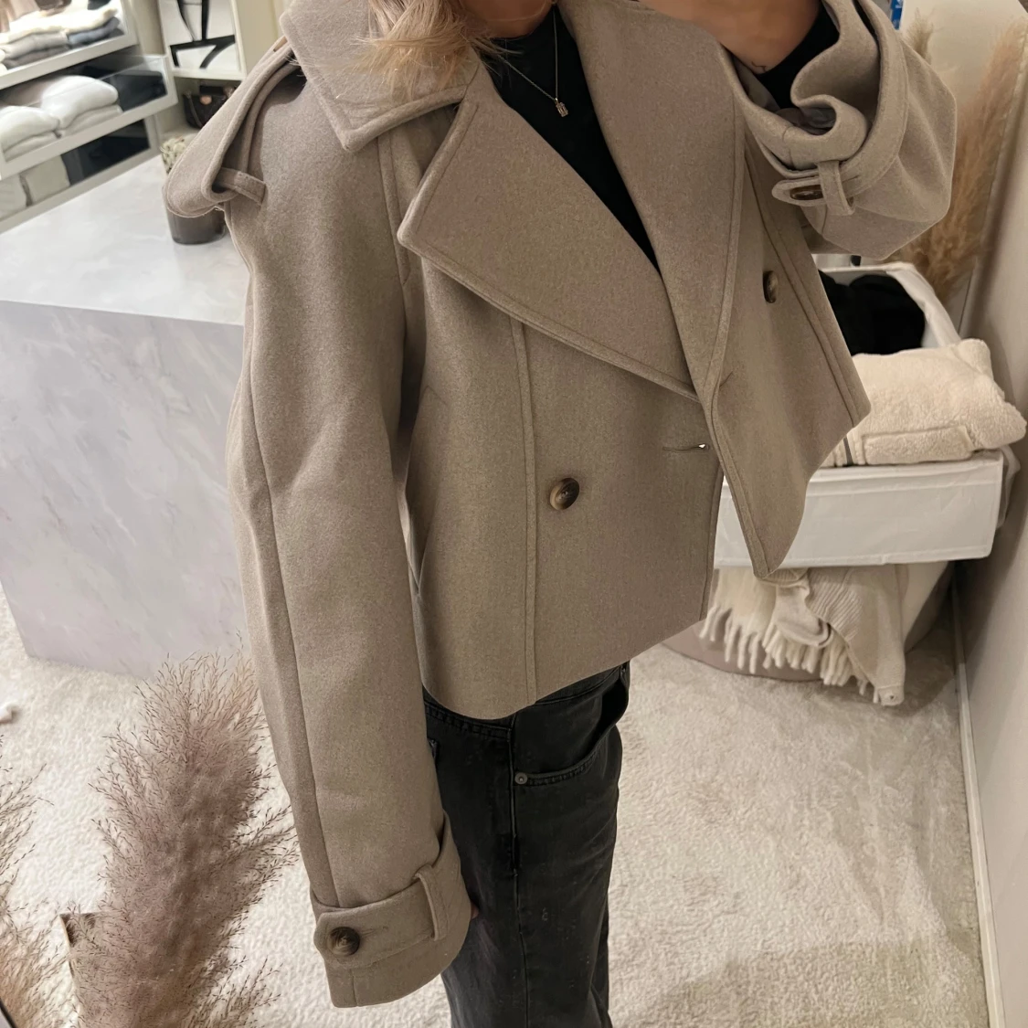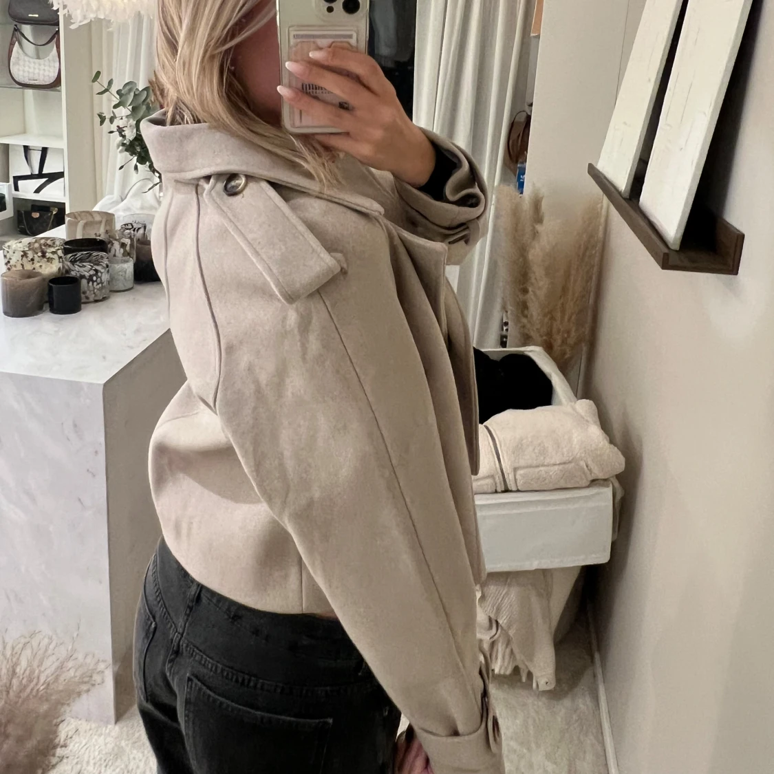 Snygg croppad trenchcoat kappa i beige med breda slag, dubbelknäppning och knappar vid ärmslut. Jackan har axelklaffar och är tillverkad i ett ull-liknande material som ger en exklusiv känsla. Perfekt för dig som vill ha en stilren och trendig look. Nypris 799kr och aldrig använd!!🤎🤎
