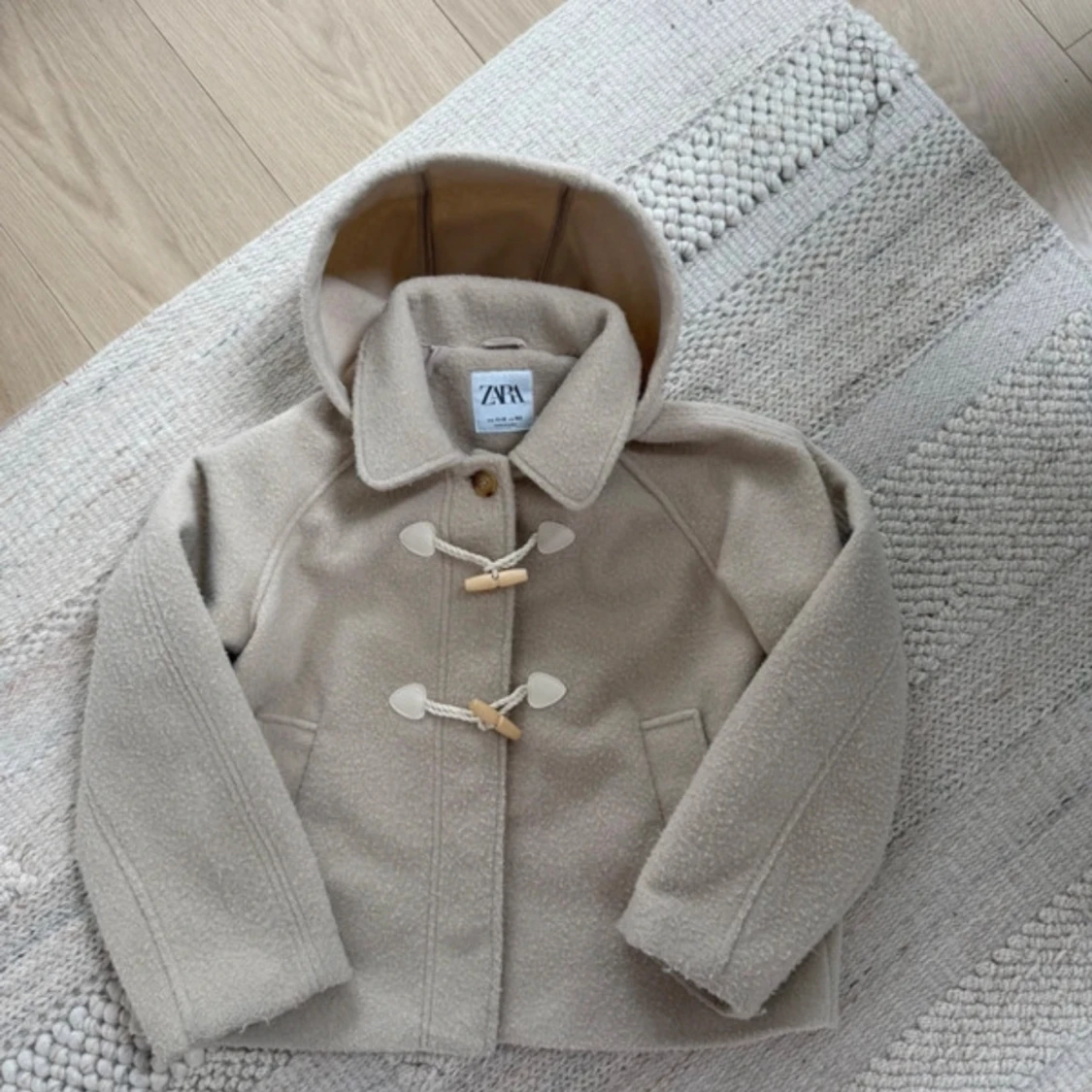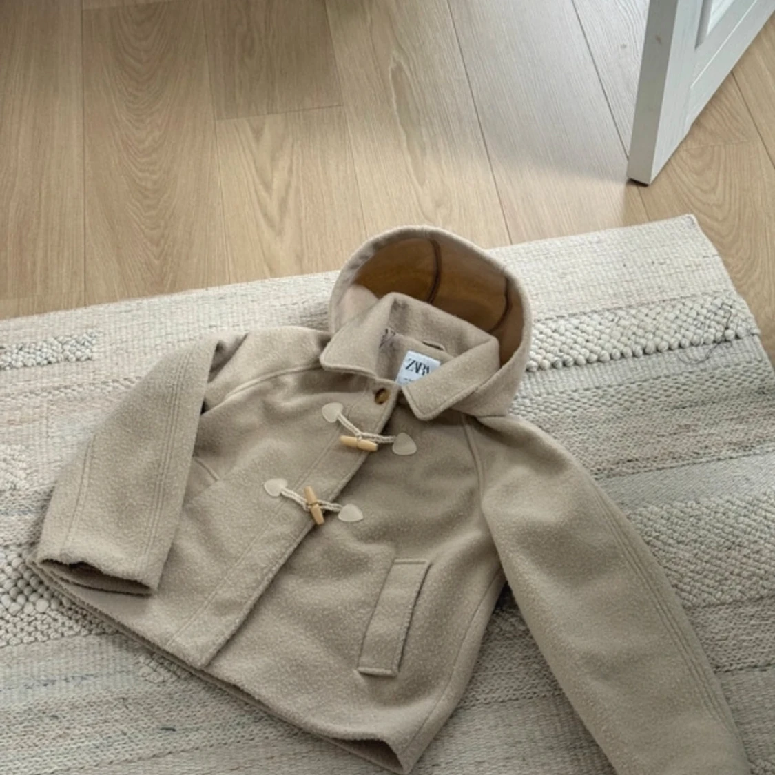 Beige duffeljacka från Zara med huva och snygga träknappar med snörning. Jackan har två fickor fram, klassisk krage och är tillverkad i mjukt ullblandat material. Perfekt för kyliga dagar och ger en clean och stilren look.