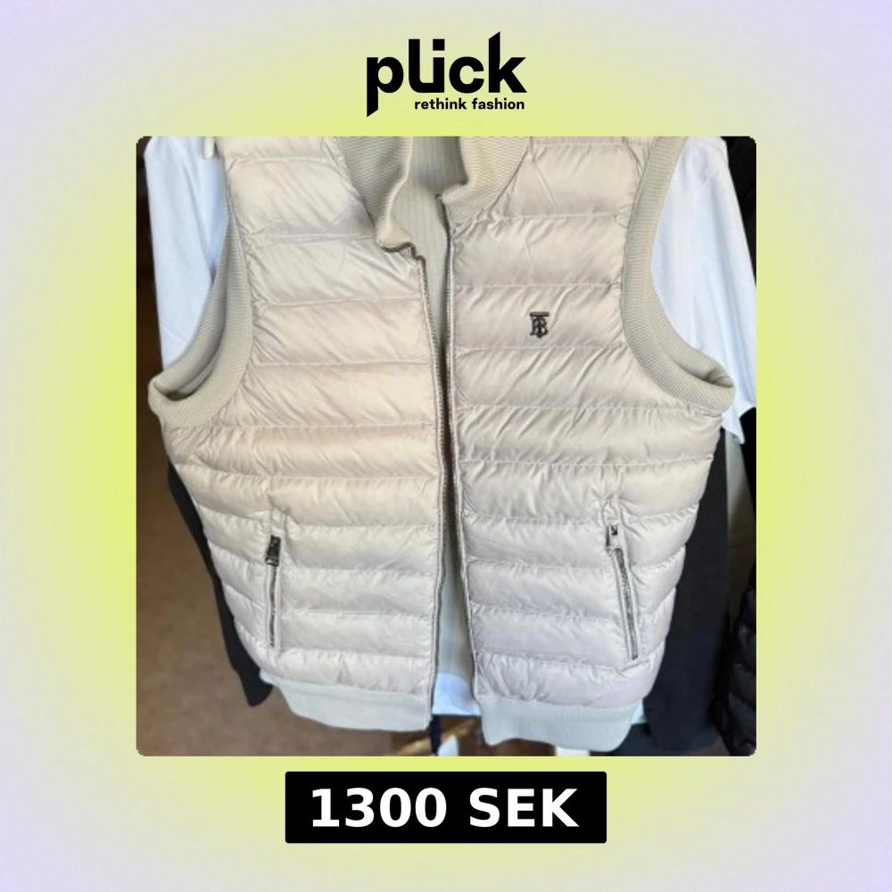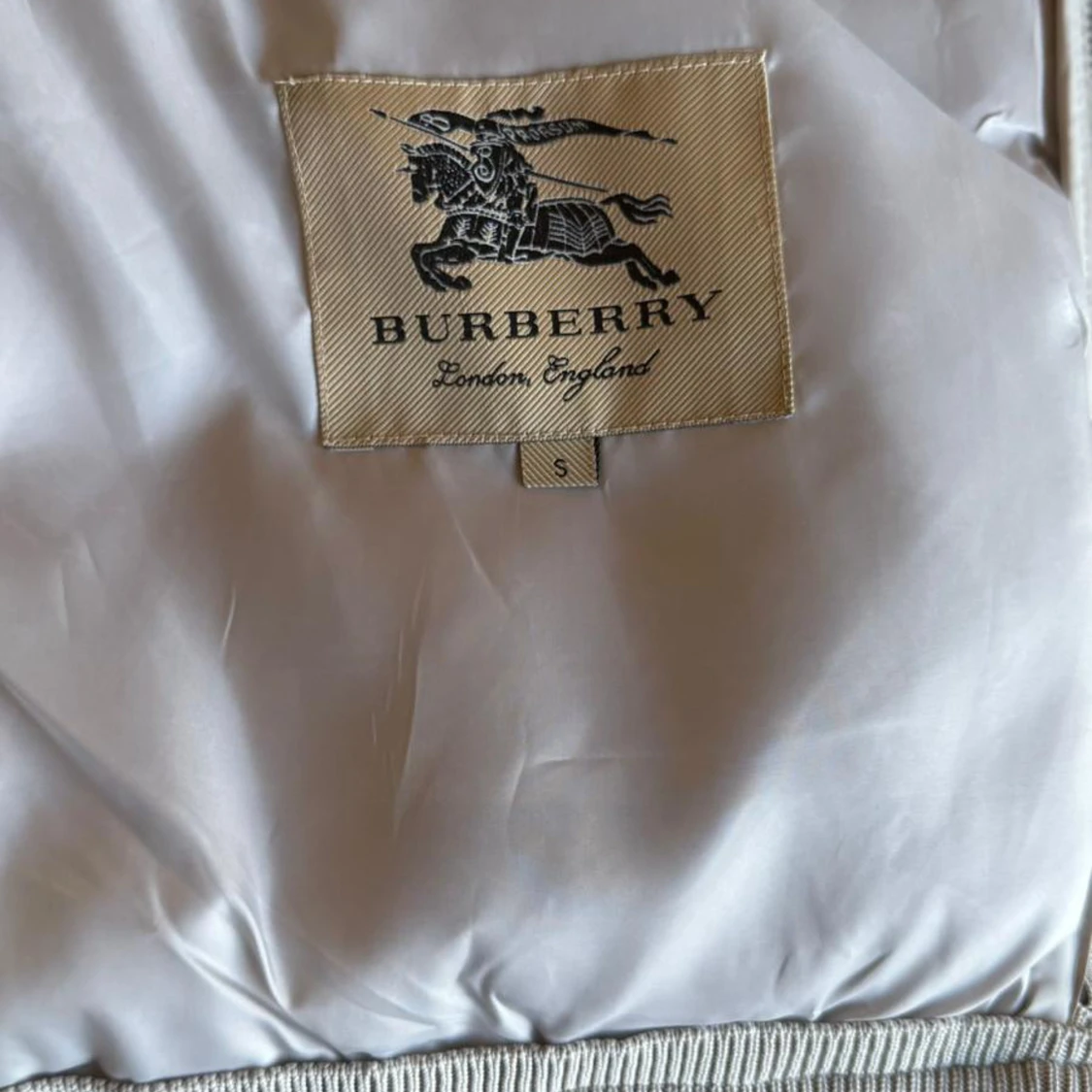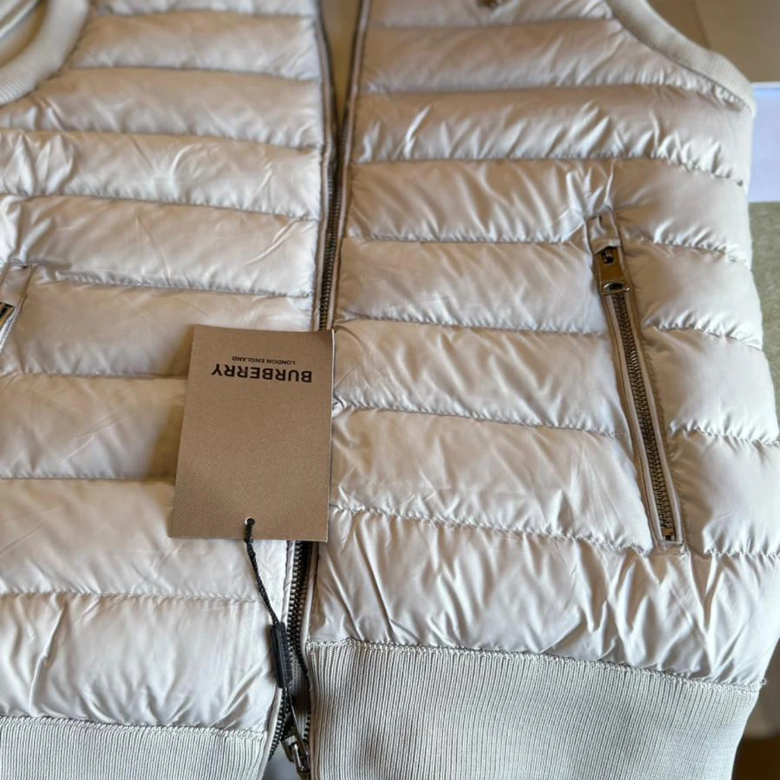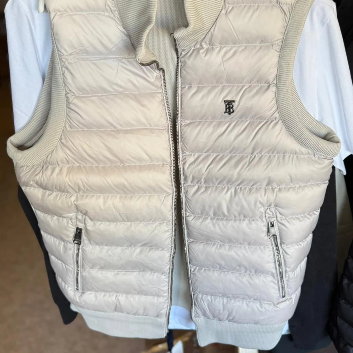 Snygg beige dunväst från Burberry med quiltad design och ribbade kanter. Västen har två dragkedjefickor framtill, diskret Burberry-logga på bröstet och stängs med dragkedja. Perfekt för lager-på-lager och stilren look.
