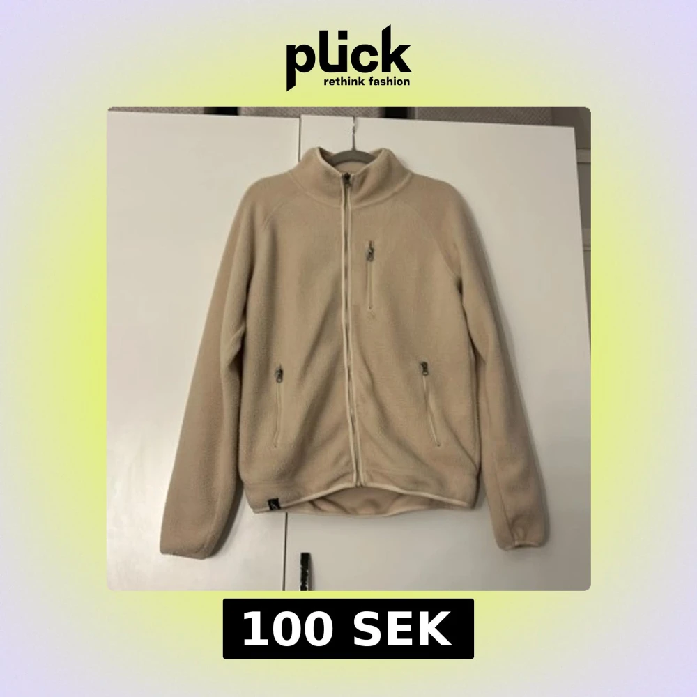 Mysig beige fleecejacka med dragkedja och hög krage. Jackan har två sidofickor och en bröstficka, alla med dragkedjor. Perfekt för kyliga dagar.
