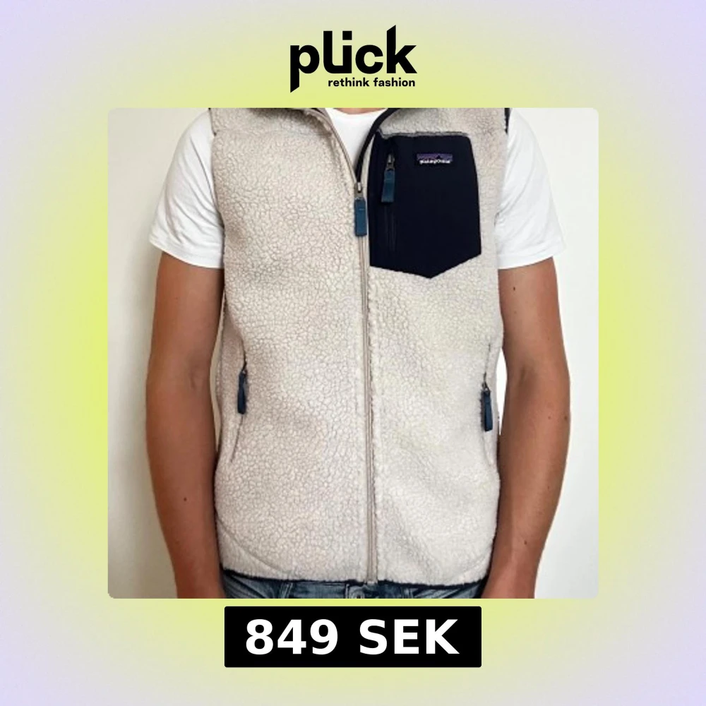 Mysig beige fleeceväst från Patagonia med marinblå bröstficka och dragkedjor. Västen har hög krage och två sidofickor med dragkedja. Perfekt för lager-på-lager och chill stil.