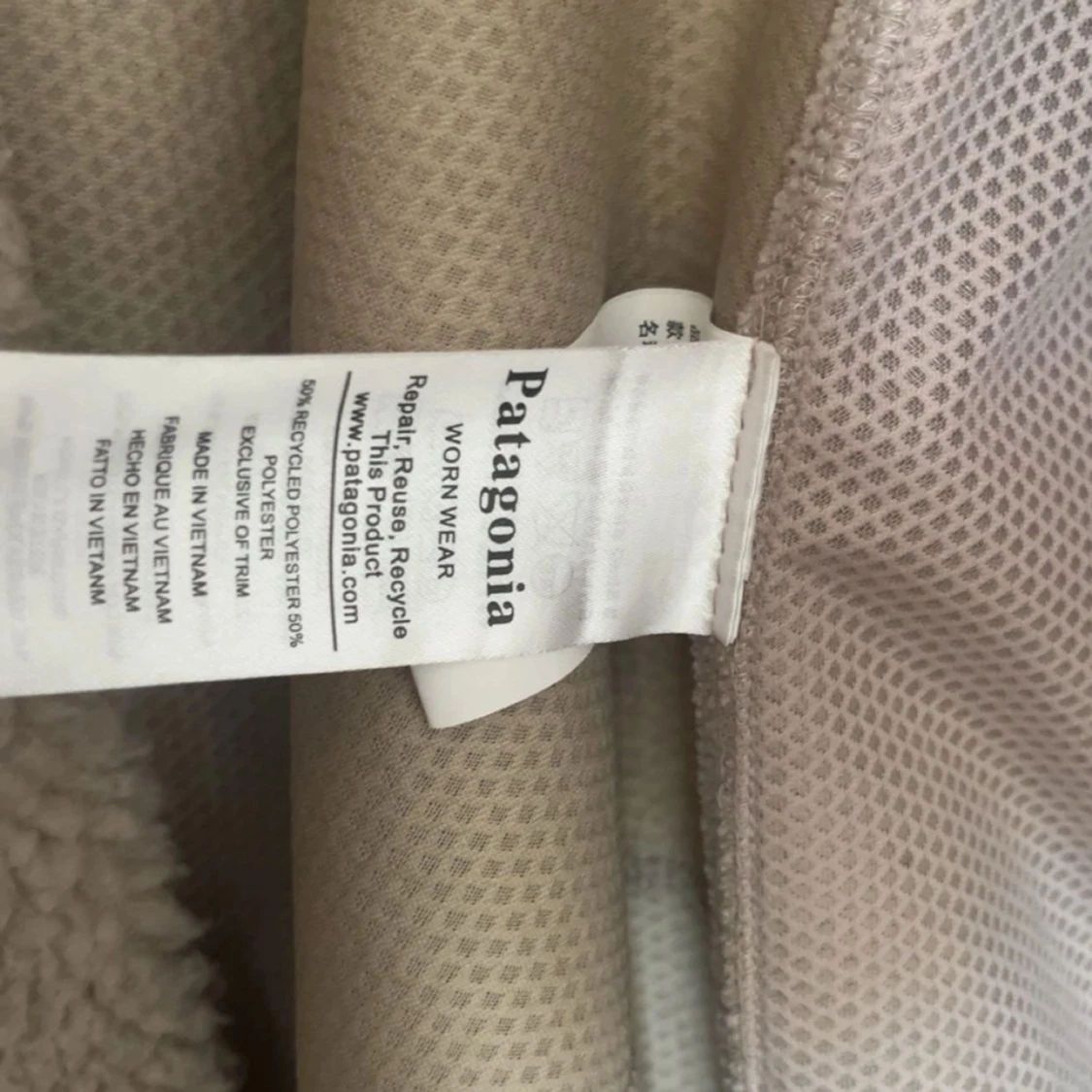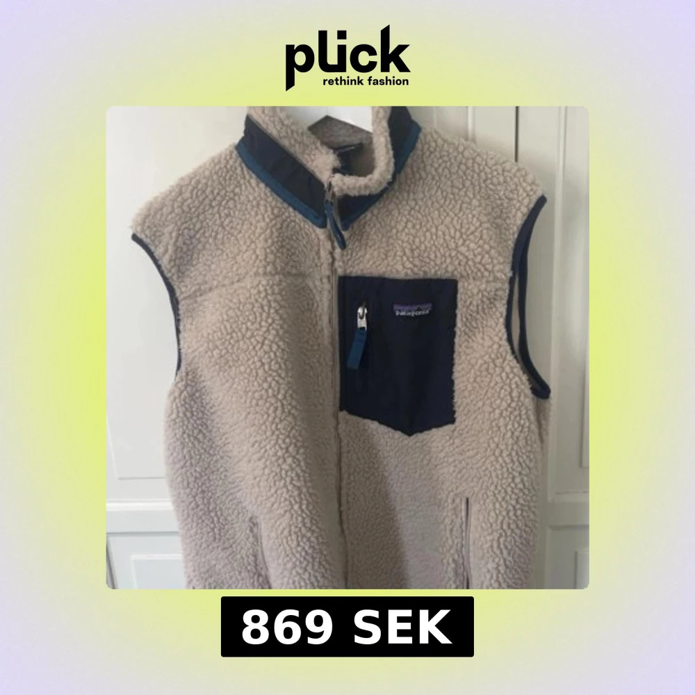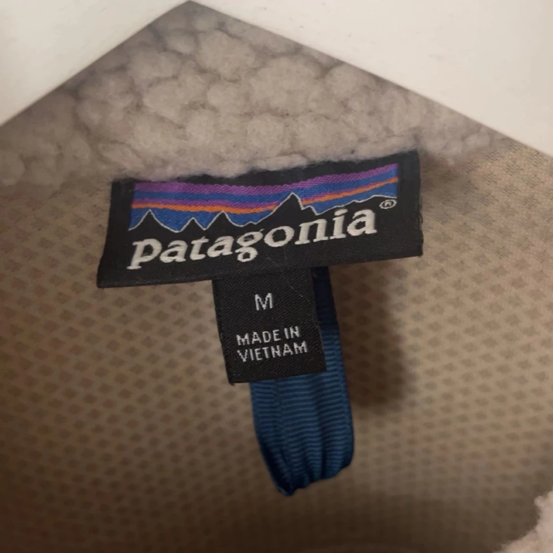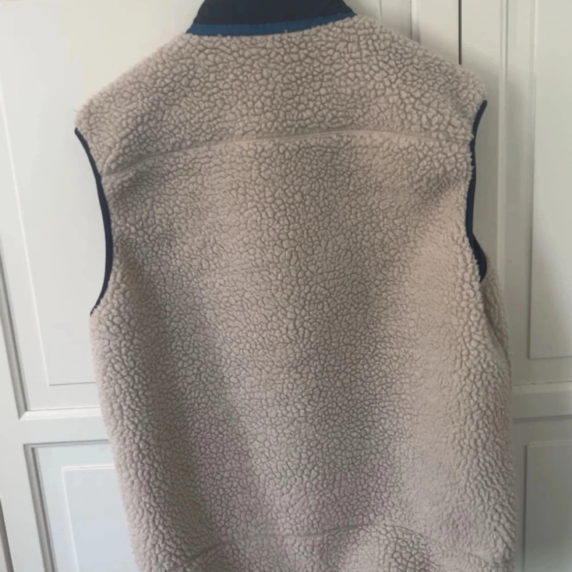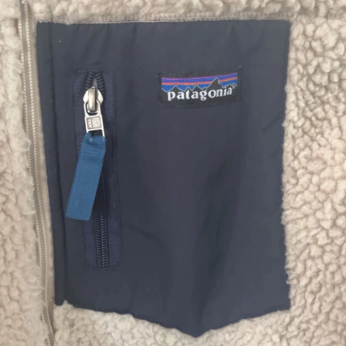 Säljer en beige fleeceväst från Patagonia med marinblå detaljer och hög krage. Västen har en bröstficka med dragkedja och klassisk Patagonia-logga. Perfekt för lager-på-lager och outdoor-vibe. Stängs med dragkedja framtill och har mjukt, teddy-liknande material.