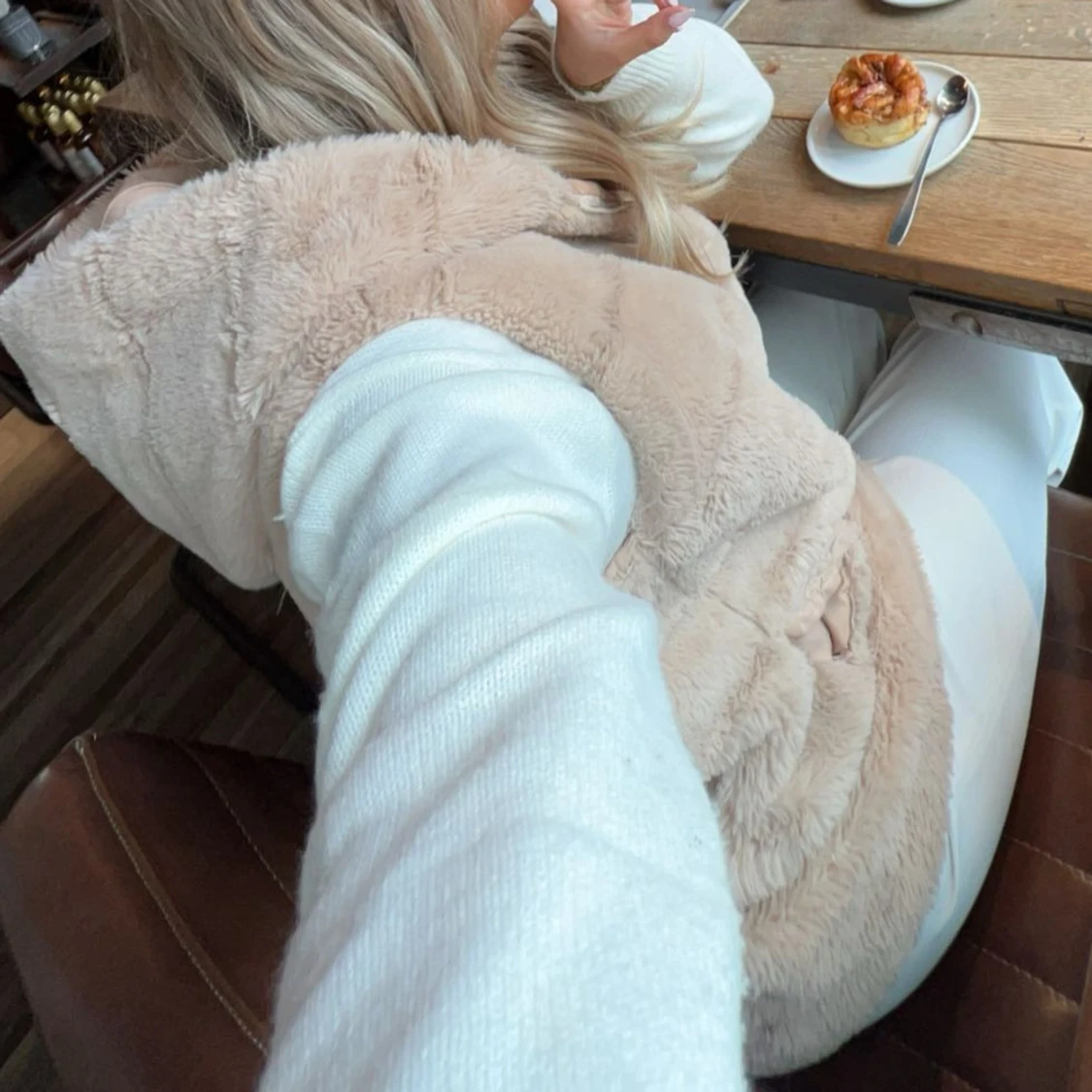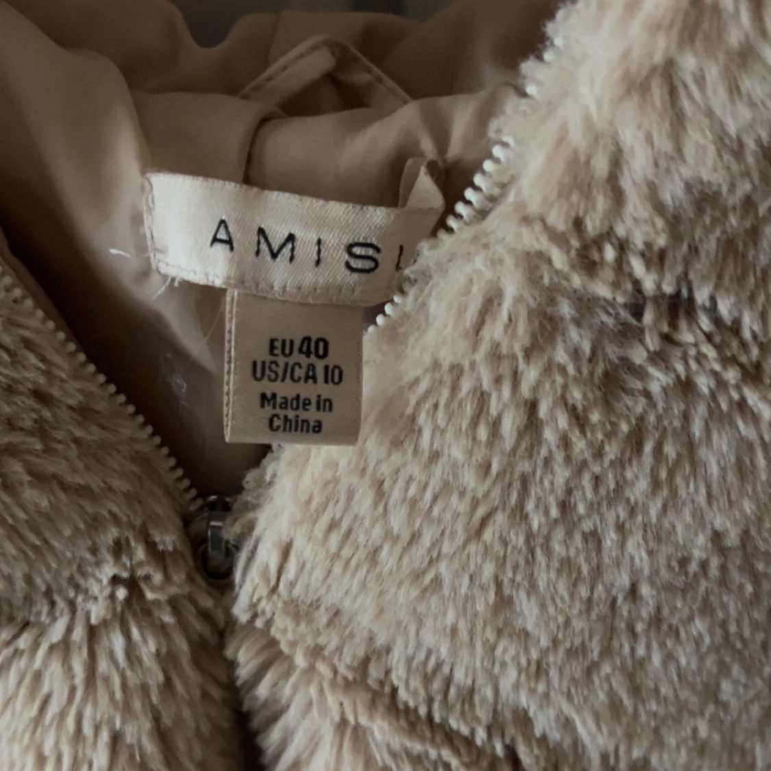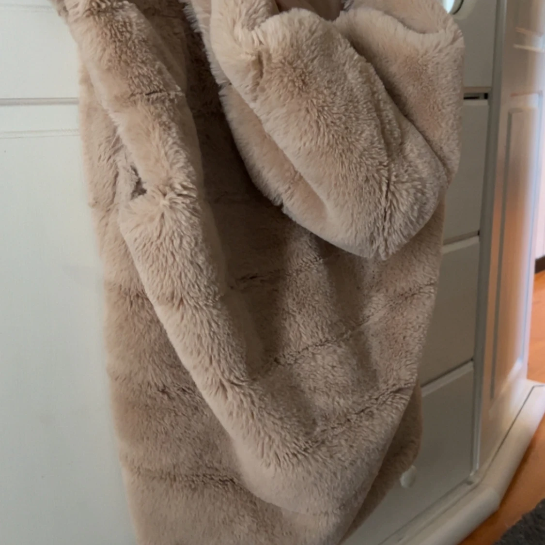 Säljer en supermjuk och fluffig beige pälsväst med stor huva och två fickor framtill. Perfekt för att ge din outfit extra cozy vibes och värme. Västen har en enkel, rak passform och är helfärgad utan mönster. Den är i storlek 40 men passar mig som har s/xs, skulle säga att den är i storlek M
