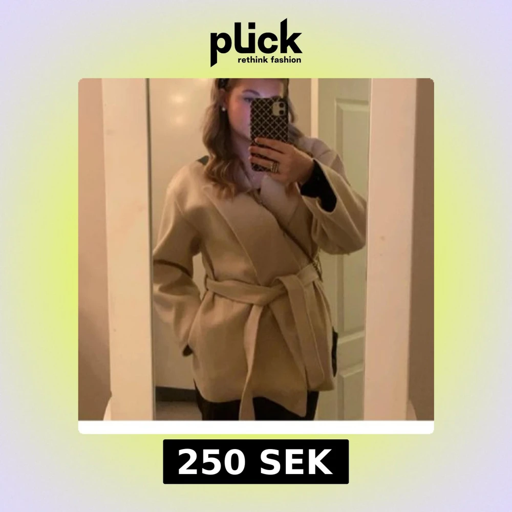 Säljer en beige kappa med omlott-design och bälte i midjan. Jackan har en stilren look med breda slag och långärmade ärmar. Perfekt för dig som gillar minimalistisk och clean stil. Materialet känns mjukt och har en snygg fall.