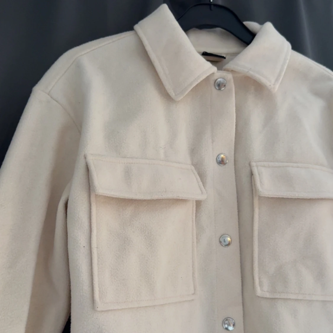 Stilren beige jacka med klassisk krage och stora bröstfickor med lock. Jackan har raka linjer, knäppning med silvriga knappar och är tillverkad i ett mjukt material som känns lite fleeceaktigt. Perfekt för lager-på-lager och enkel att matcha.