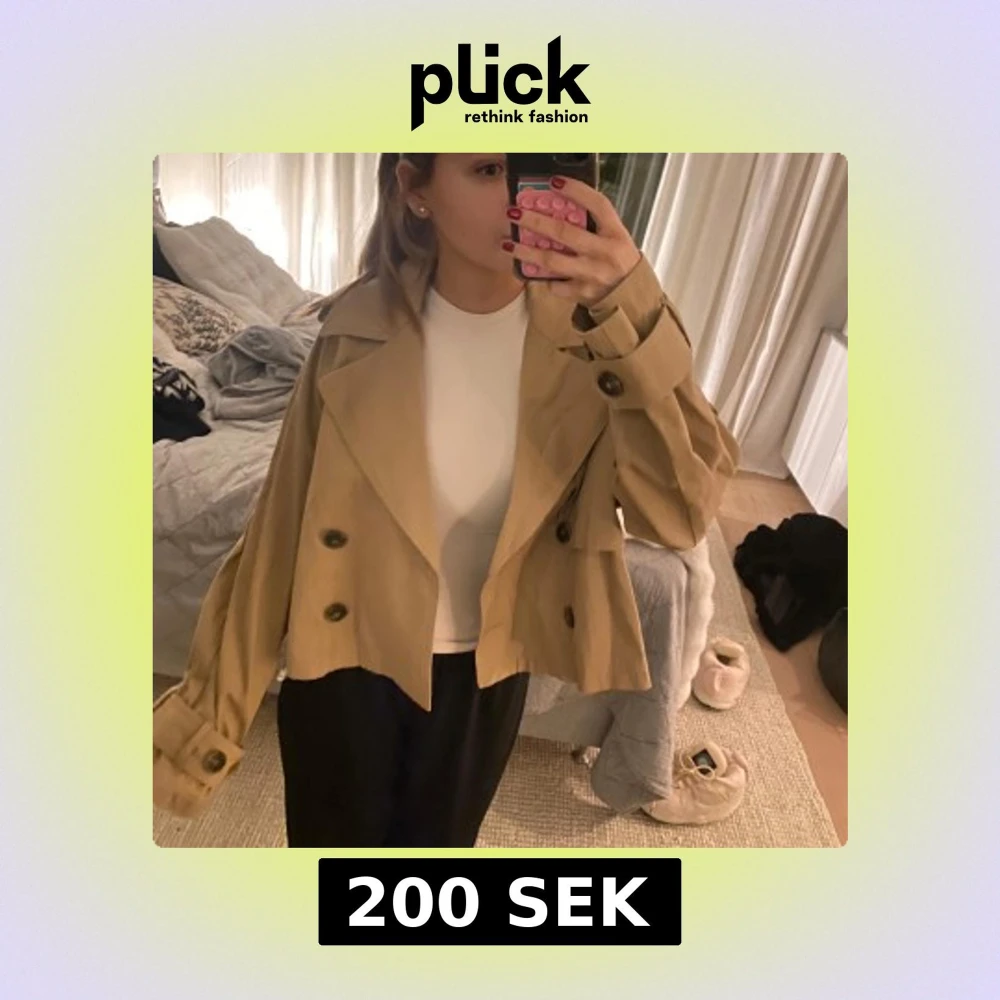 Snygg beige trenchcoat från Gina med knappar och klassisk krage. Jackan är croppad och har långa ärmar med dekorativa knappar vid ärmsluten. Helt oanvänd med ett värde på 599kr
