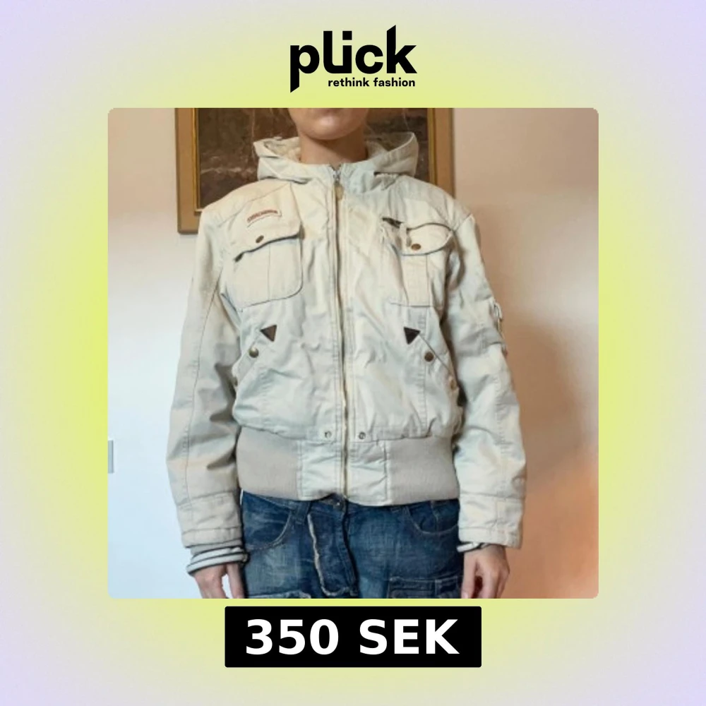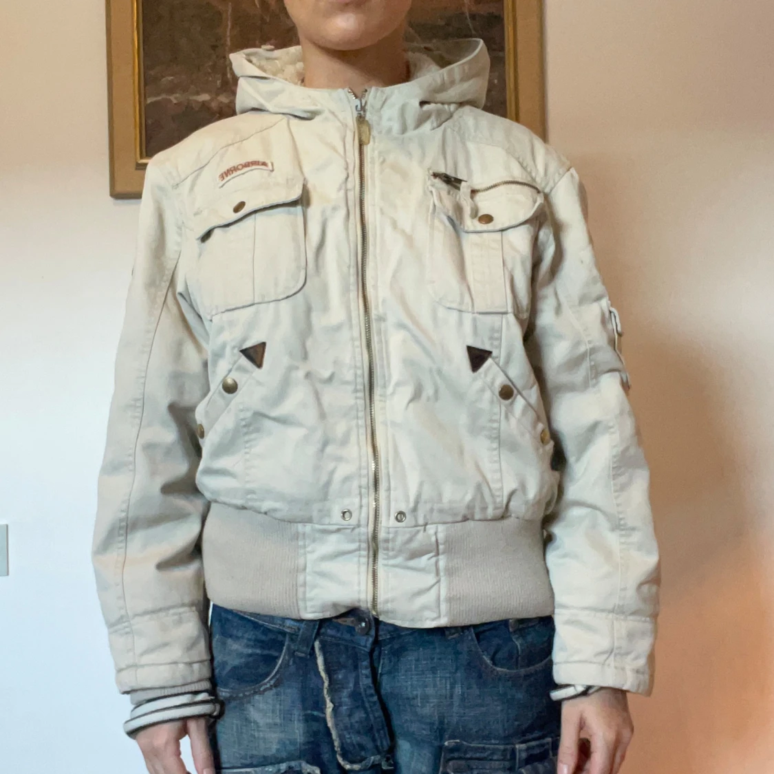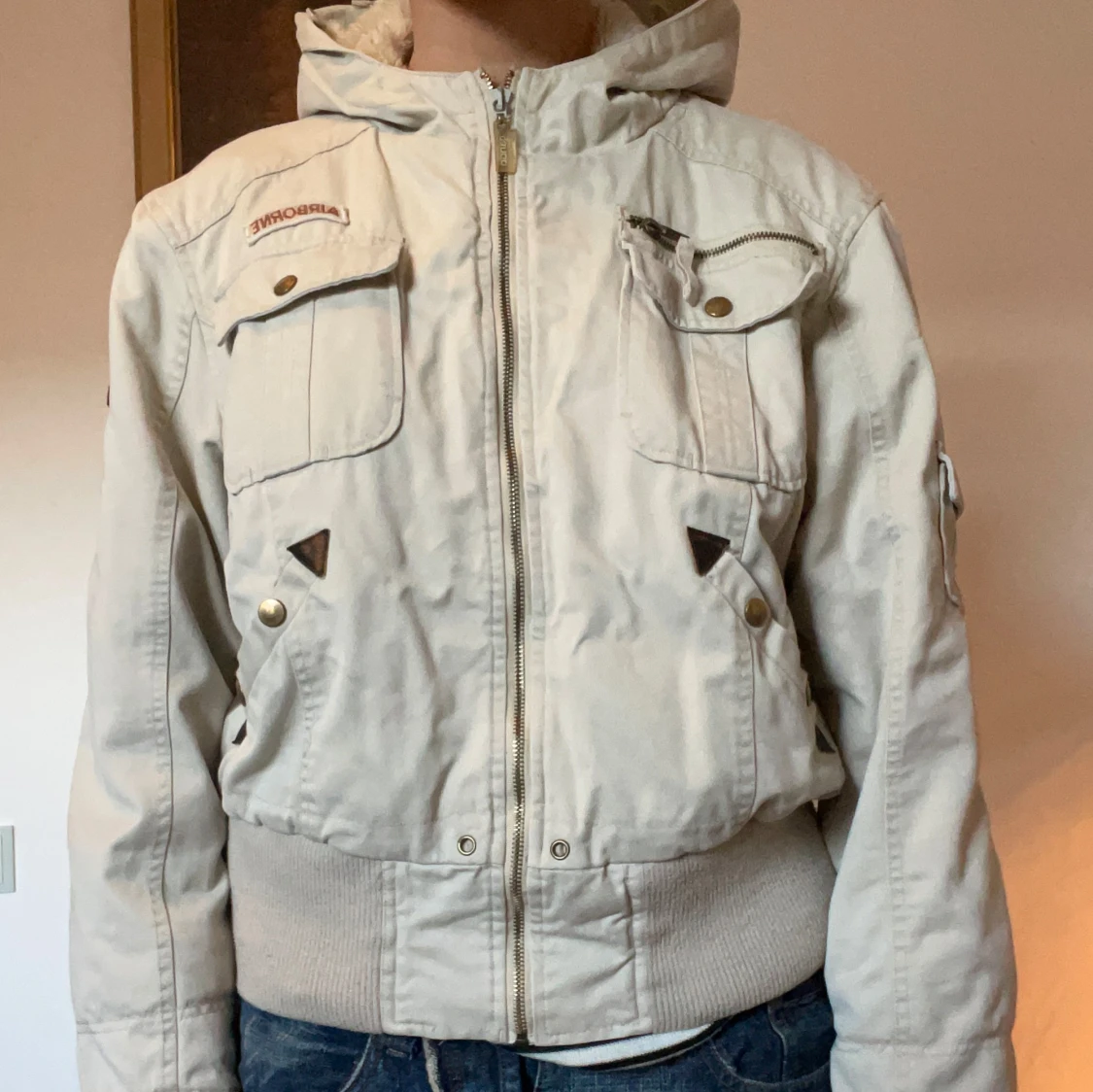 Snygg beige jacka från Airborne med dragkedja och flera fickor med knappar. Jackan har en hög krage och ribbade muddar vid ärmslut och nederkant. Rätt så varm.
