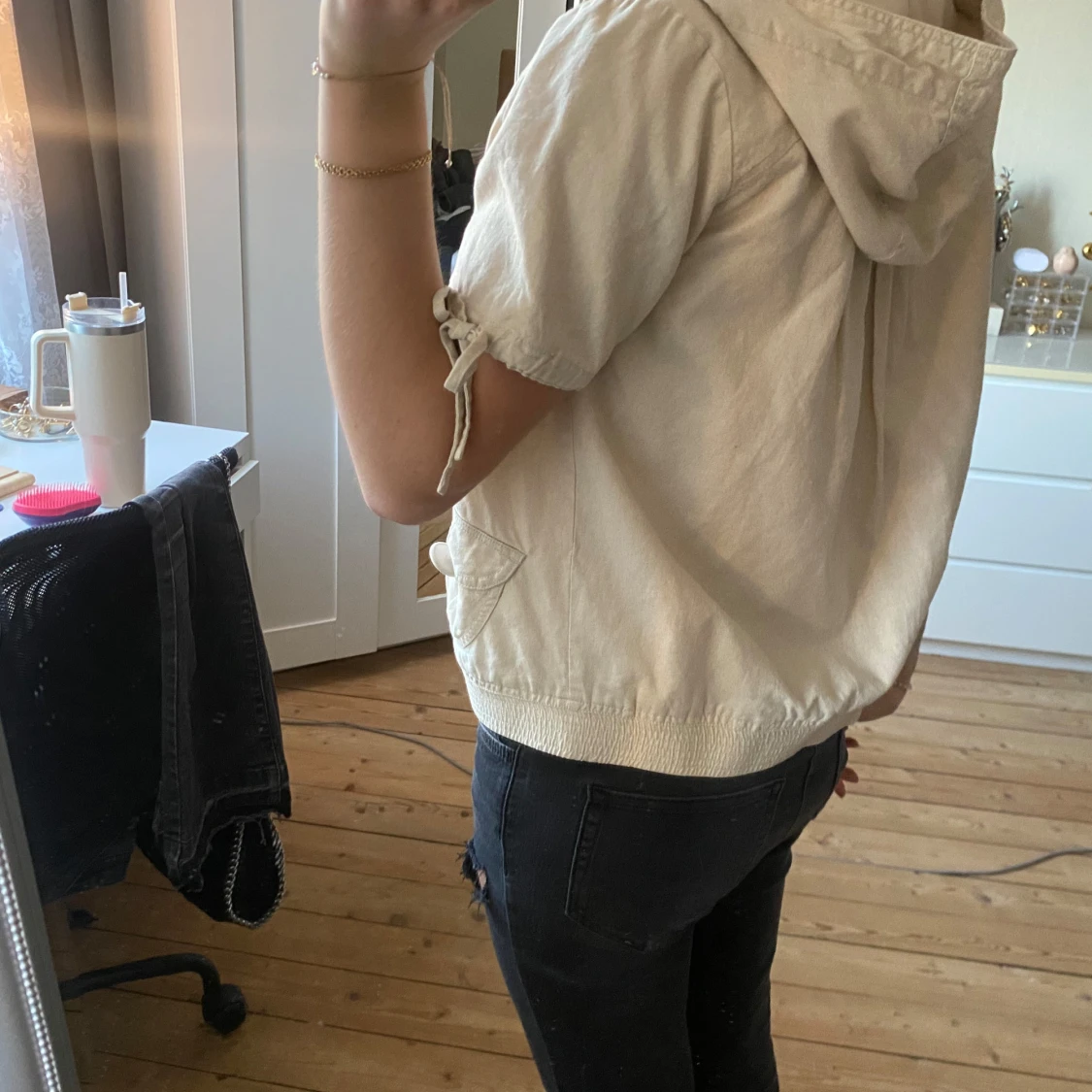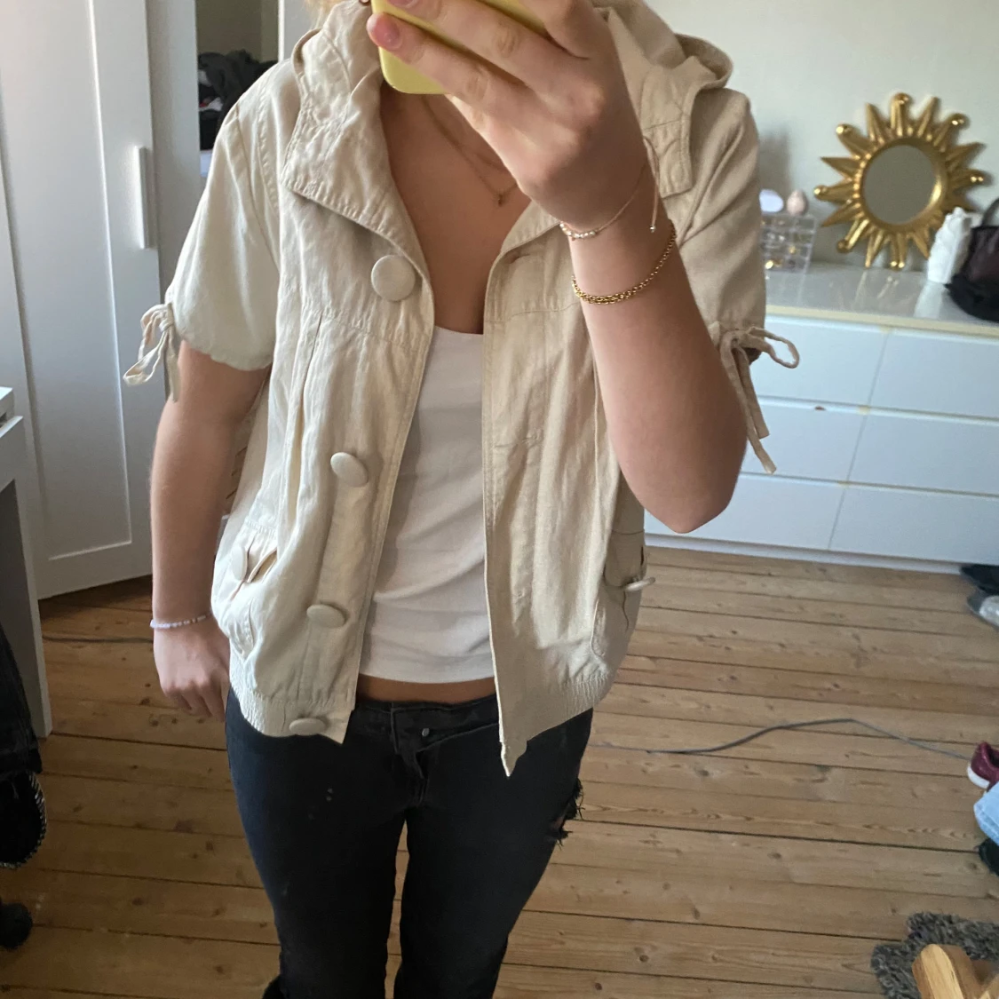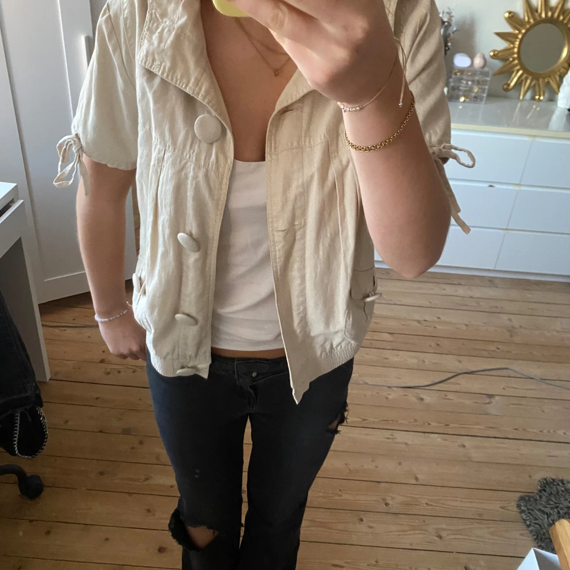 Säljer en söt beige jacka från Fairy in the City. Den har korta ärmar med knytband och stora knappar framtill. Perfekt för vår, höst och sommar! 🧥✨
