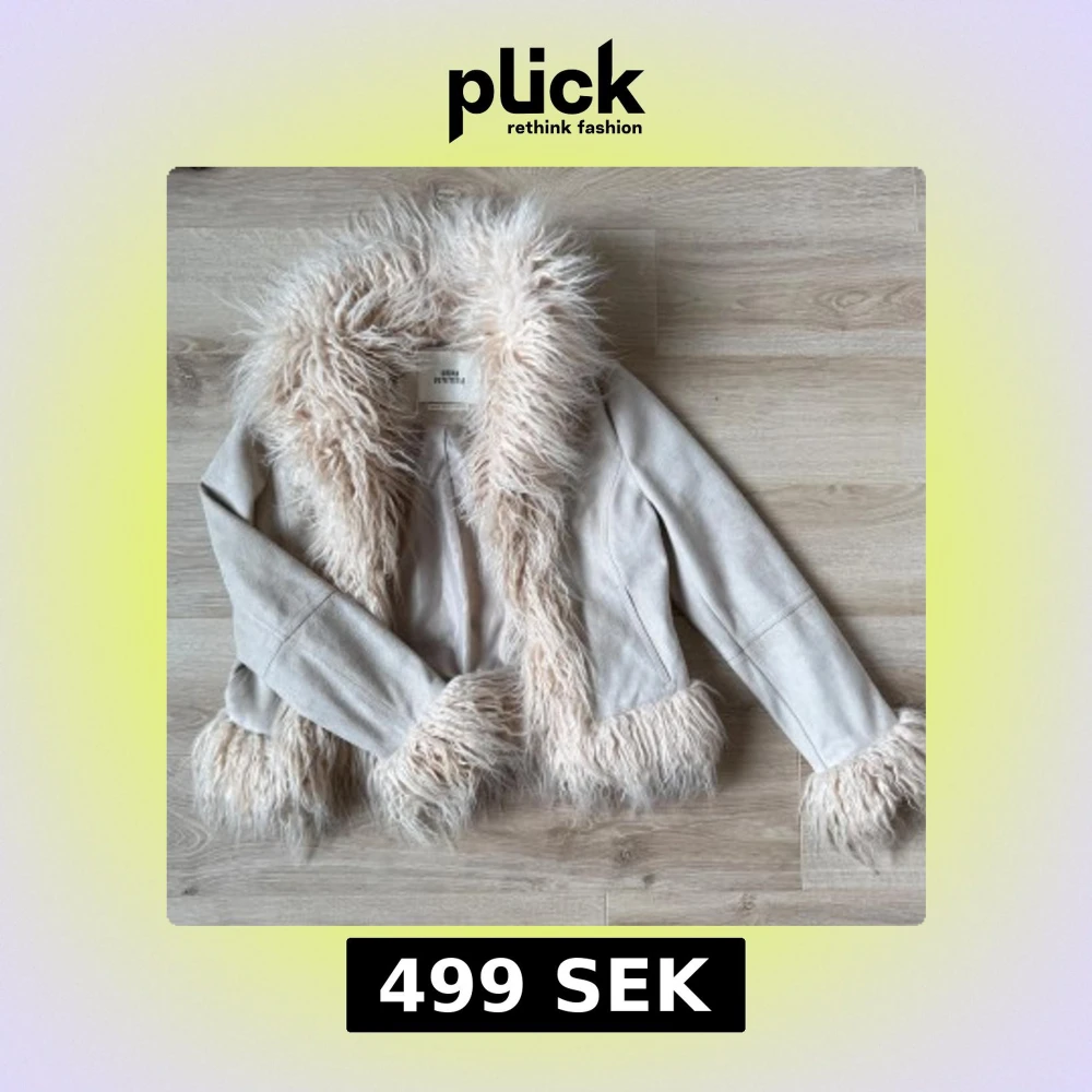 Säljer en snygg beige jacka från Urban Outfitters med fluffig fuskpäls på kragen och ärmsluten. Jackan har en croppad passform och är perfekt för att ge en trendig look. Den är långärmad och har en mjuk insida för extra komfort.