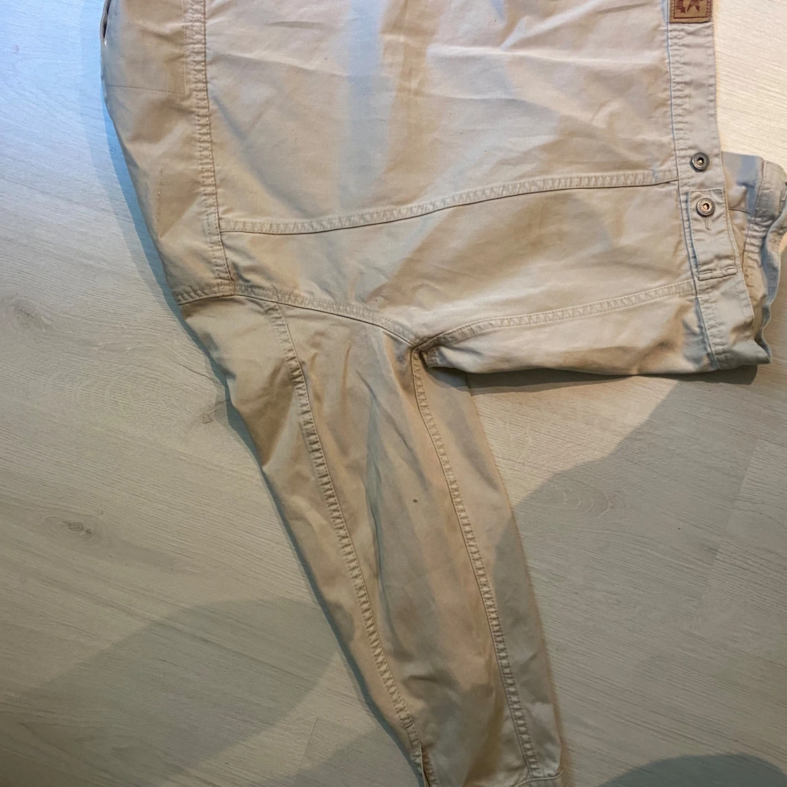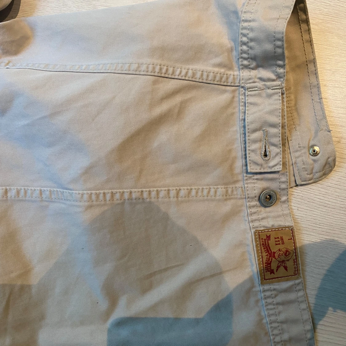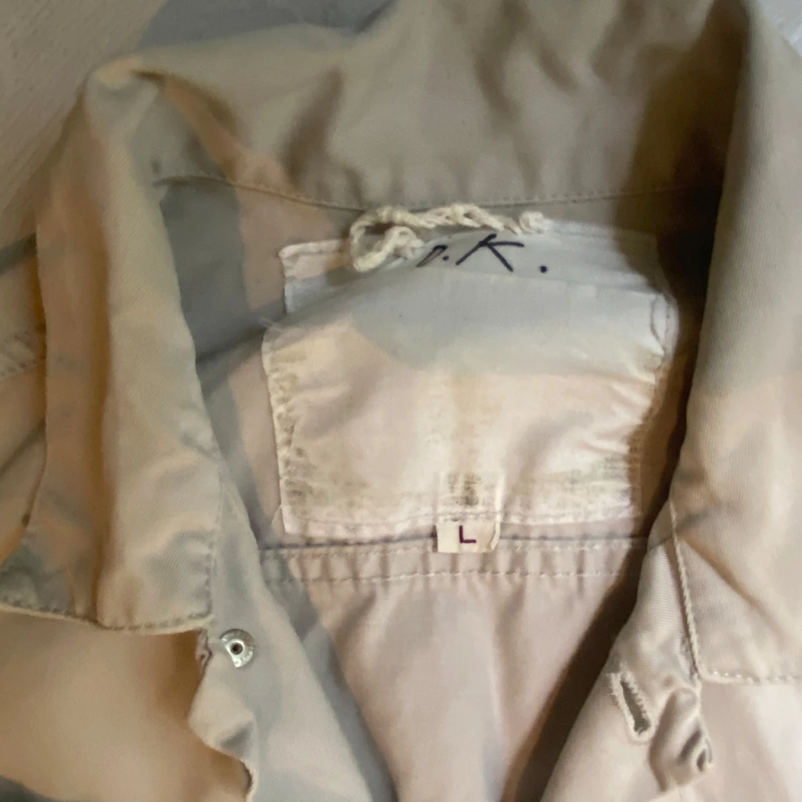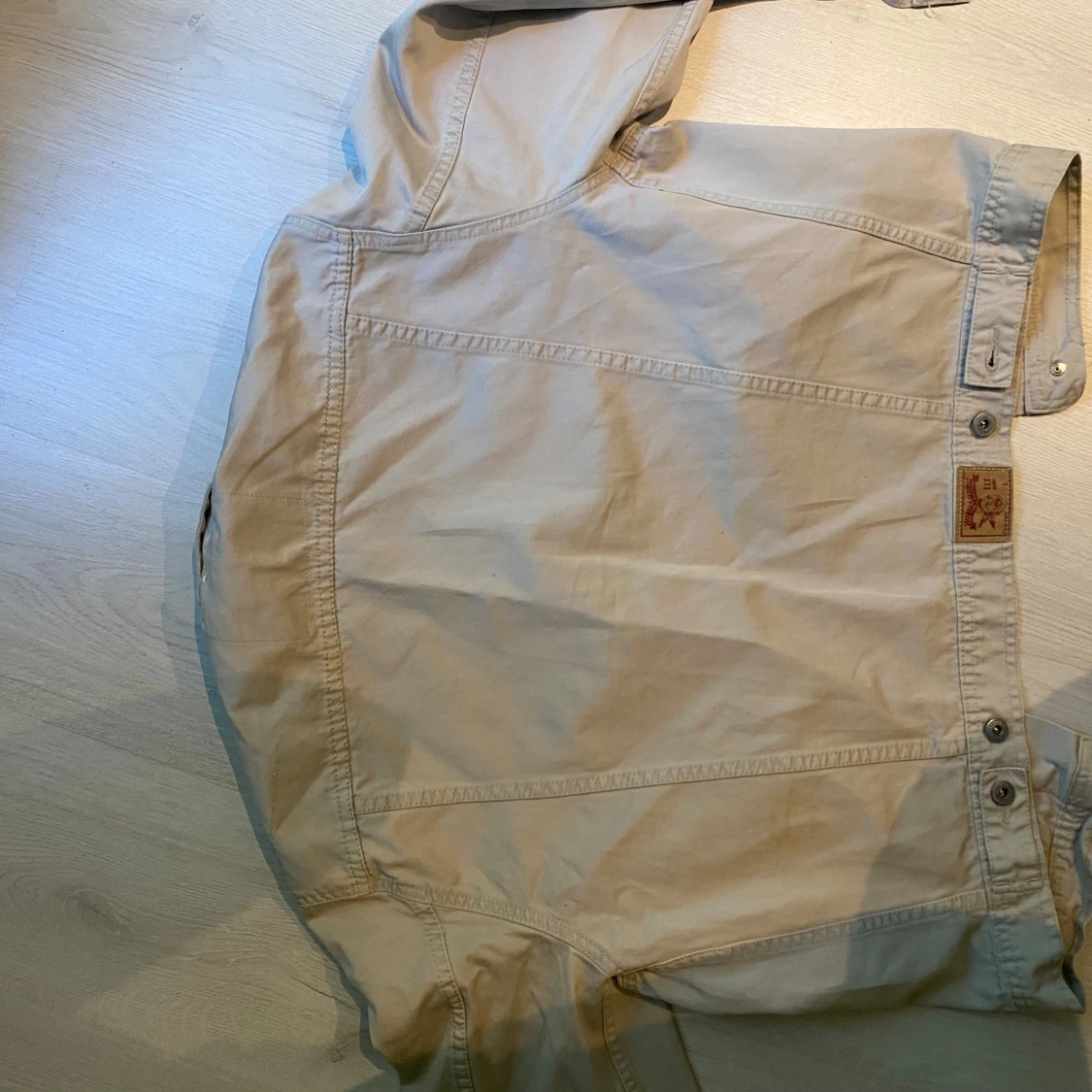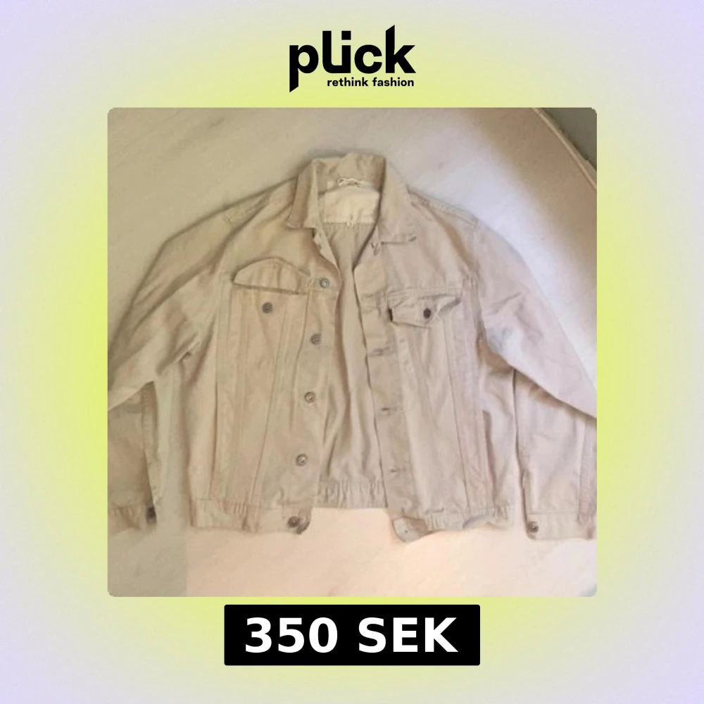 Snygg beige jeansjacka med klassisk krage, knappar framtill och två bröstfickor med lock. Jackan har långa ärmar och detaljerade sömmar som ger en cool look. Perfekt att slänga på sig när du vill ha en stilren men vintage look. Storlek L men passar som M/S. Pris kan diskuteras.