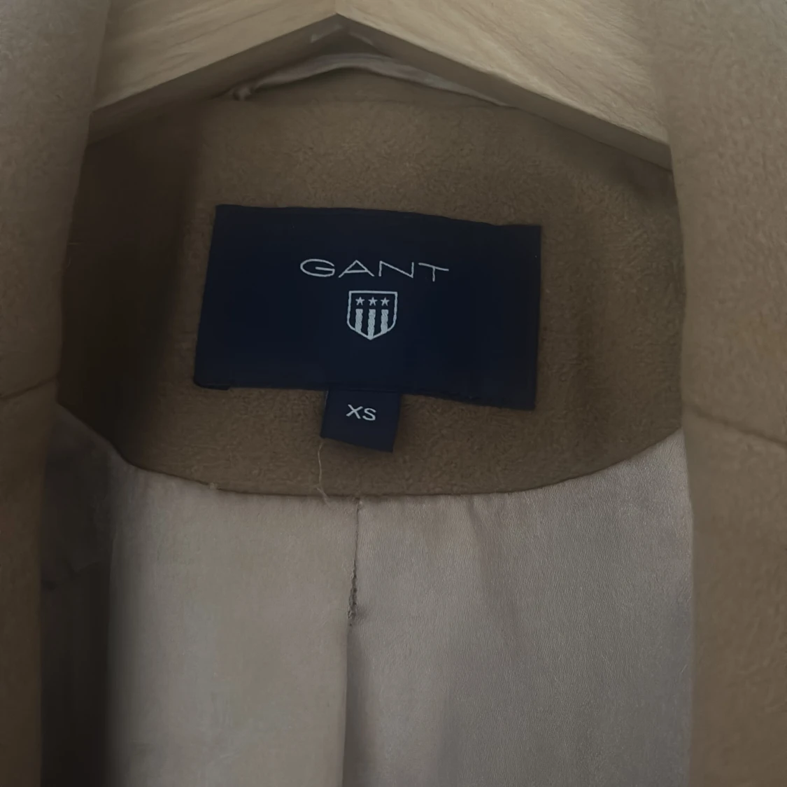 Snygg beige kappa från GANT i storlek XS. Klassisk rak modell med krage, två fickor och knäppning framtill. Materialet är 75% ull, 19% polyamid och 6% kashmir, vilket gör den både mjuk och varm. Perfekt för dig som gillar stilrena och tidlösa plagg.