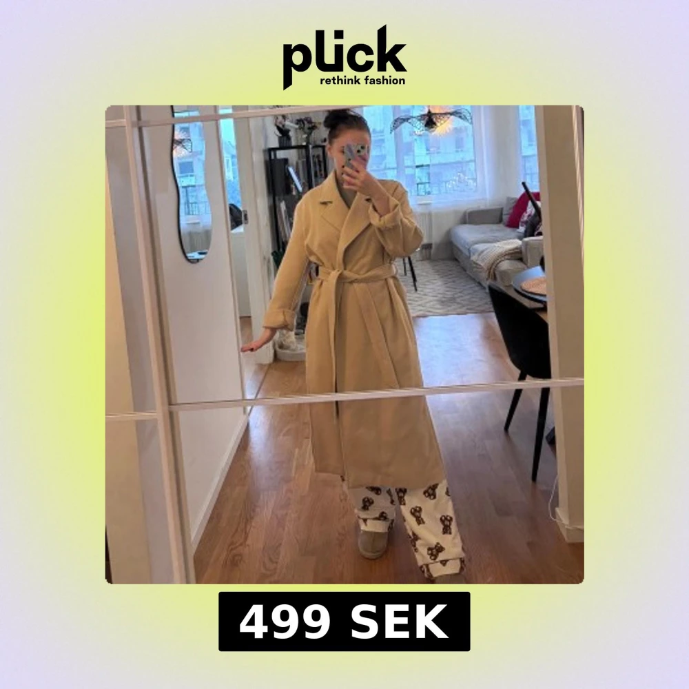Snygg beige kappa från H&M med knytskärp i midjan. Perfekt för höst och vår, med en klassisk design och långa ärmar. Kappan har en stilren look som passar till många olika outfits.
