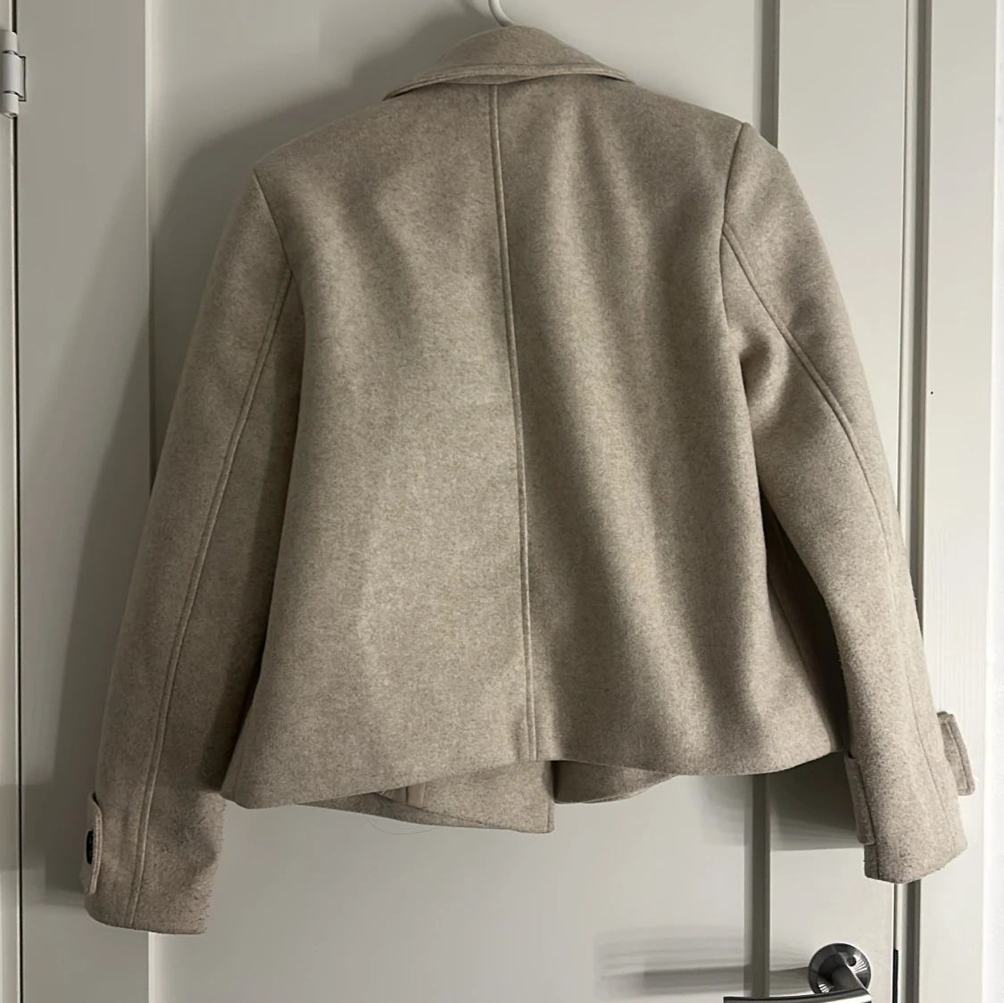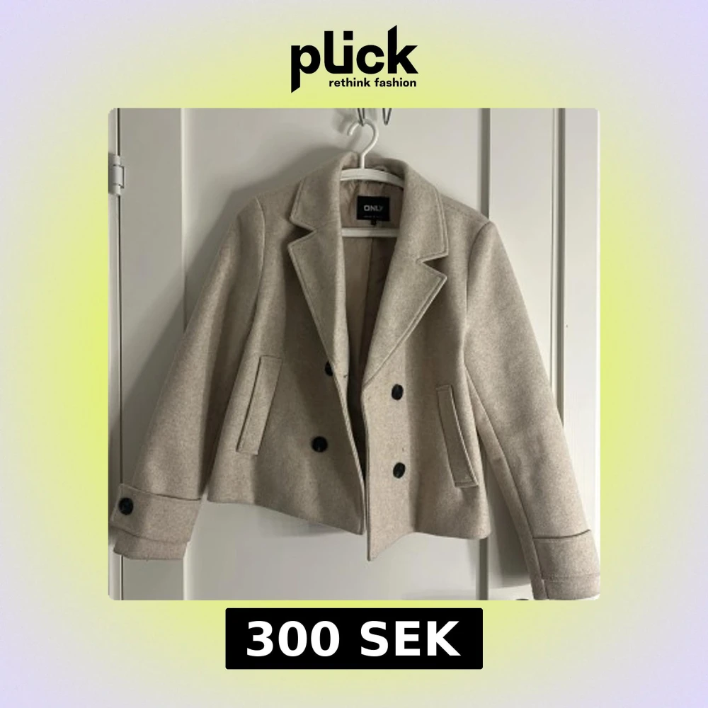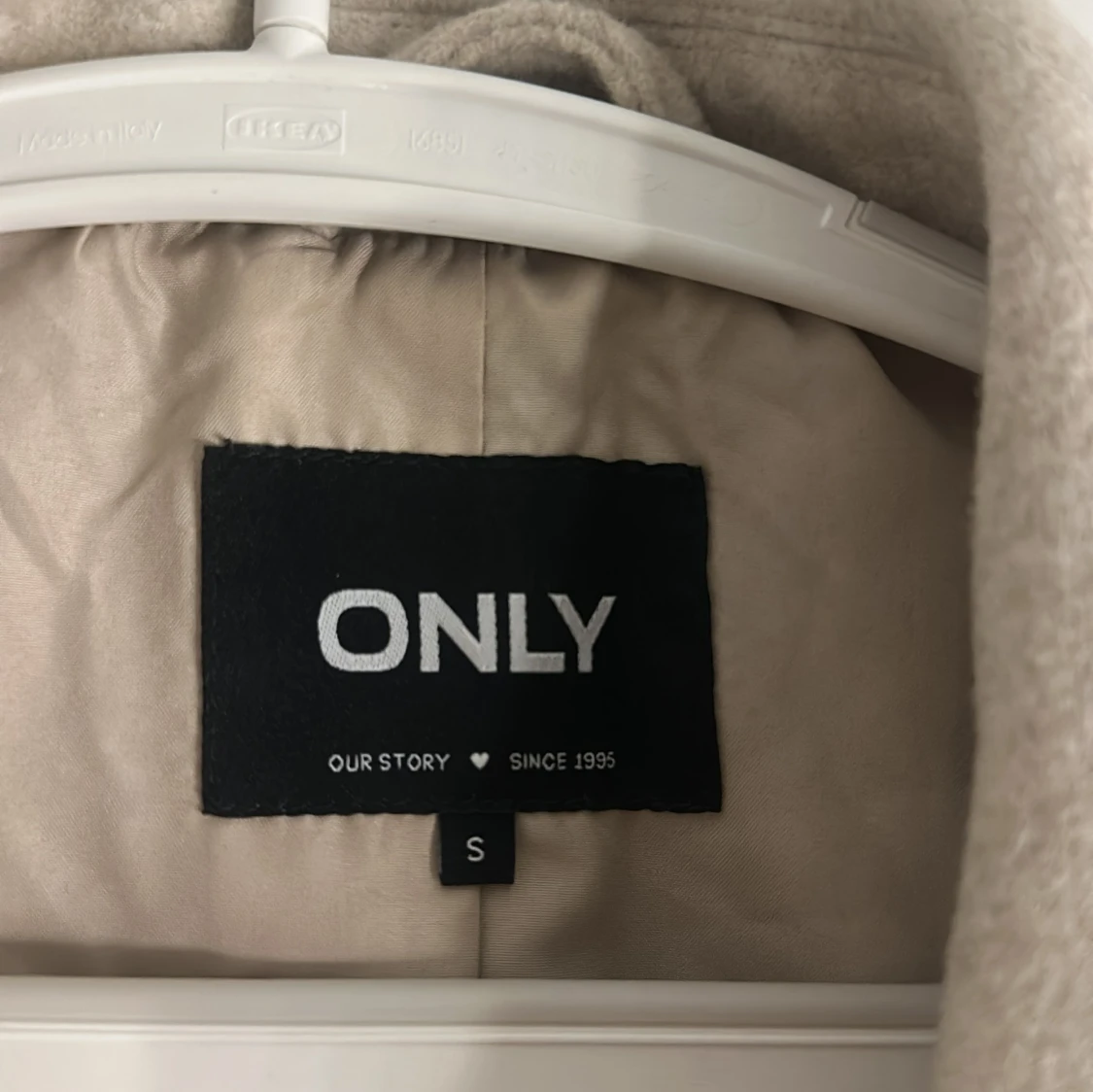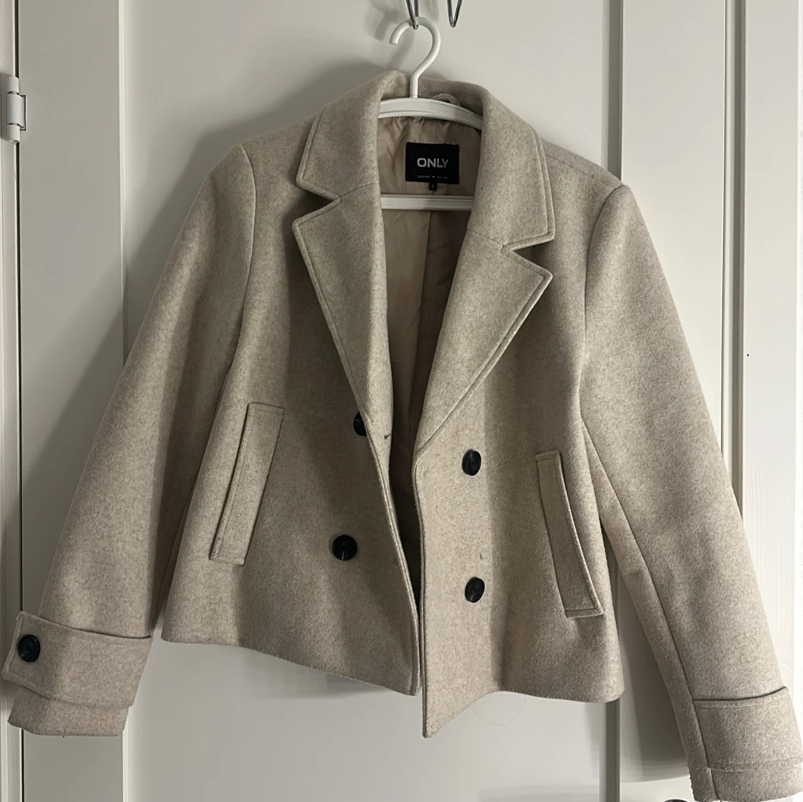 Snygg beige kappa från ONLY med klassisk krage, dubbelknäppning och svarta knappar. Jackan har två fickor fram och är lite croppad i modellen.