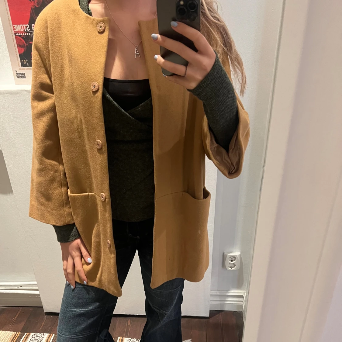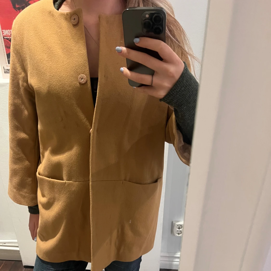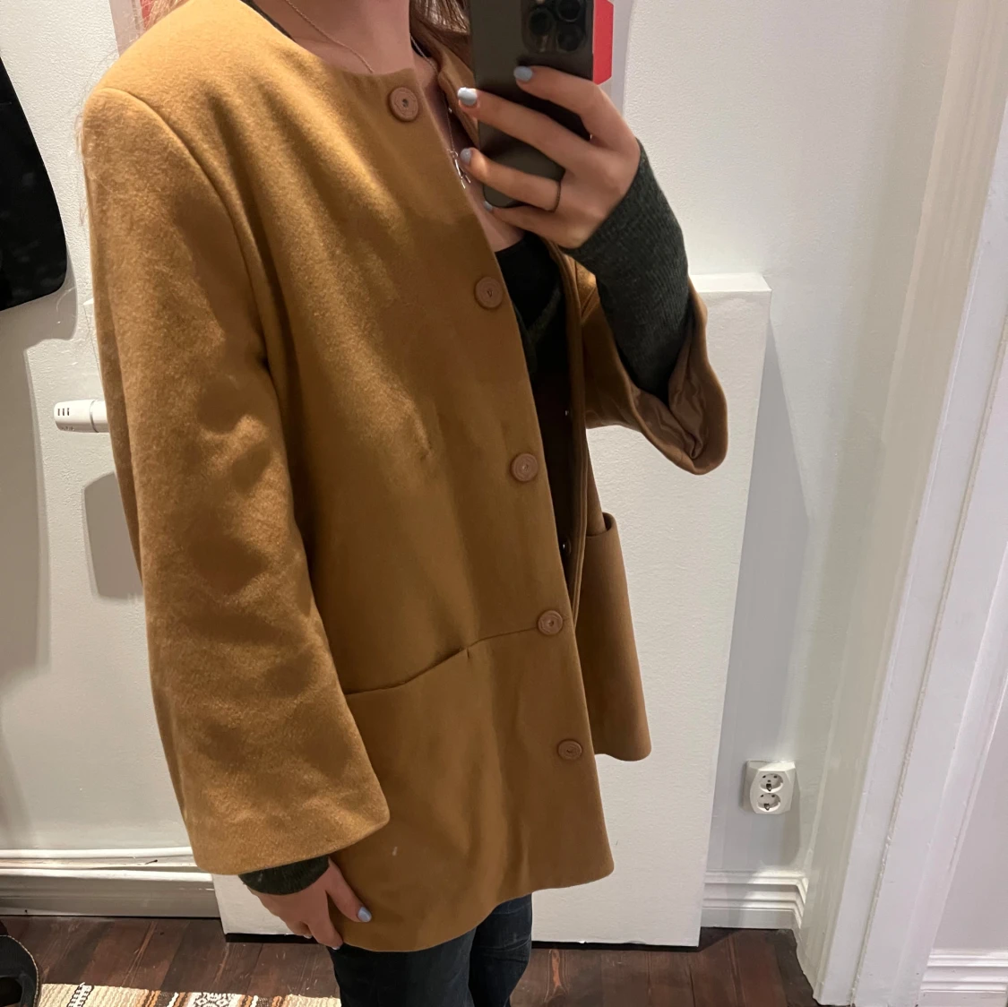 Säljer en beige kappa från Stylein i storlek S. Jackan har rund hals, stora fickor framtill och stängs med knappar. Den är tillverkad i mjuk ull och har en clean, rak passform med långa ärmar. Perfekt för dig som gillar minimalistisk och stilren vibe.