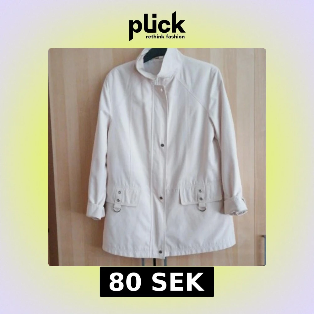 Säljer en stilren beige kappa med knappar framtill och justerbara ärmslut. Jackan har praktiska fickor med dekorativa spännen och en hög krage för extra stil. Perfekt för vår och höst!