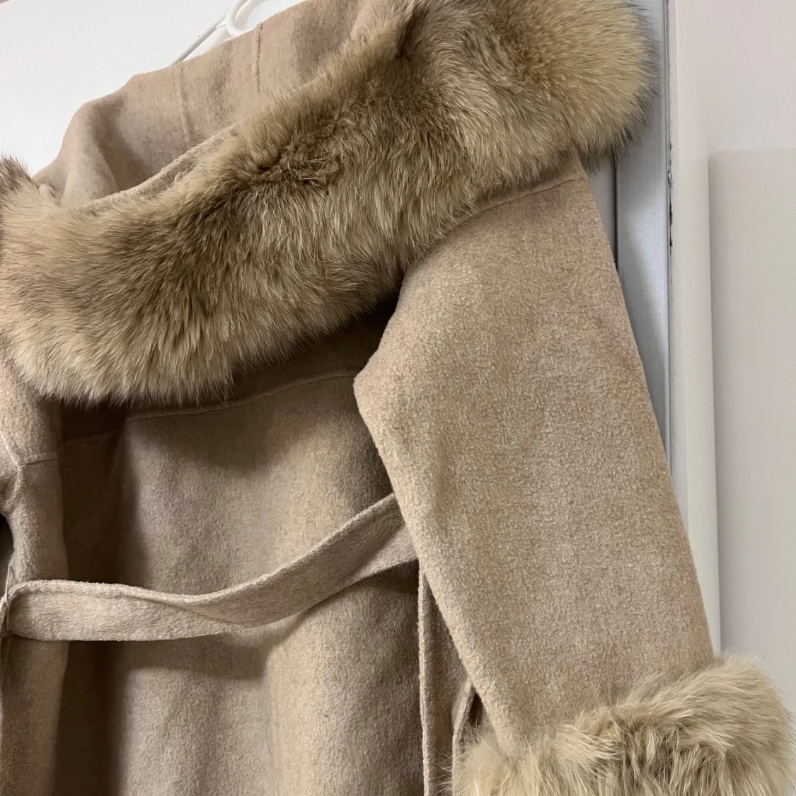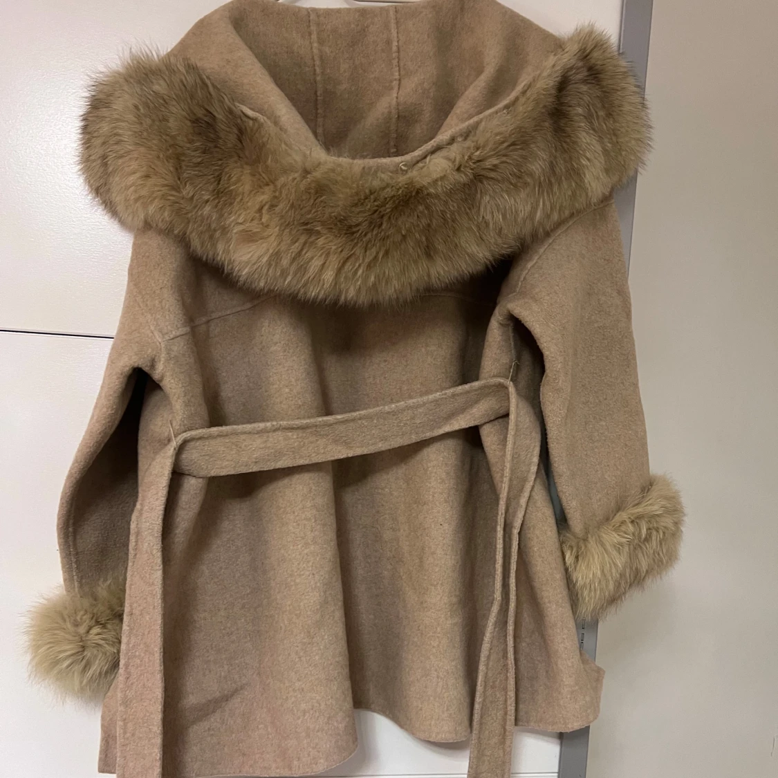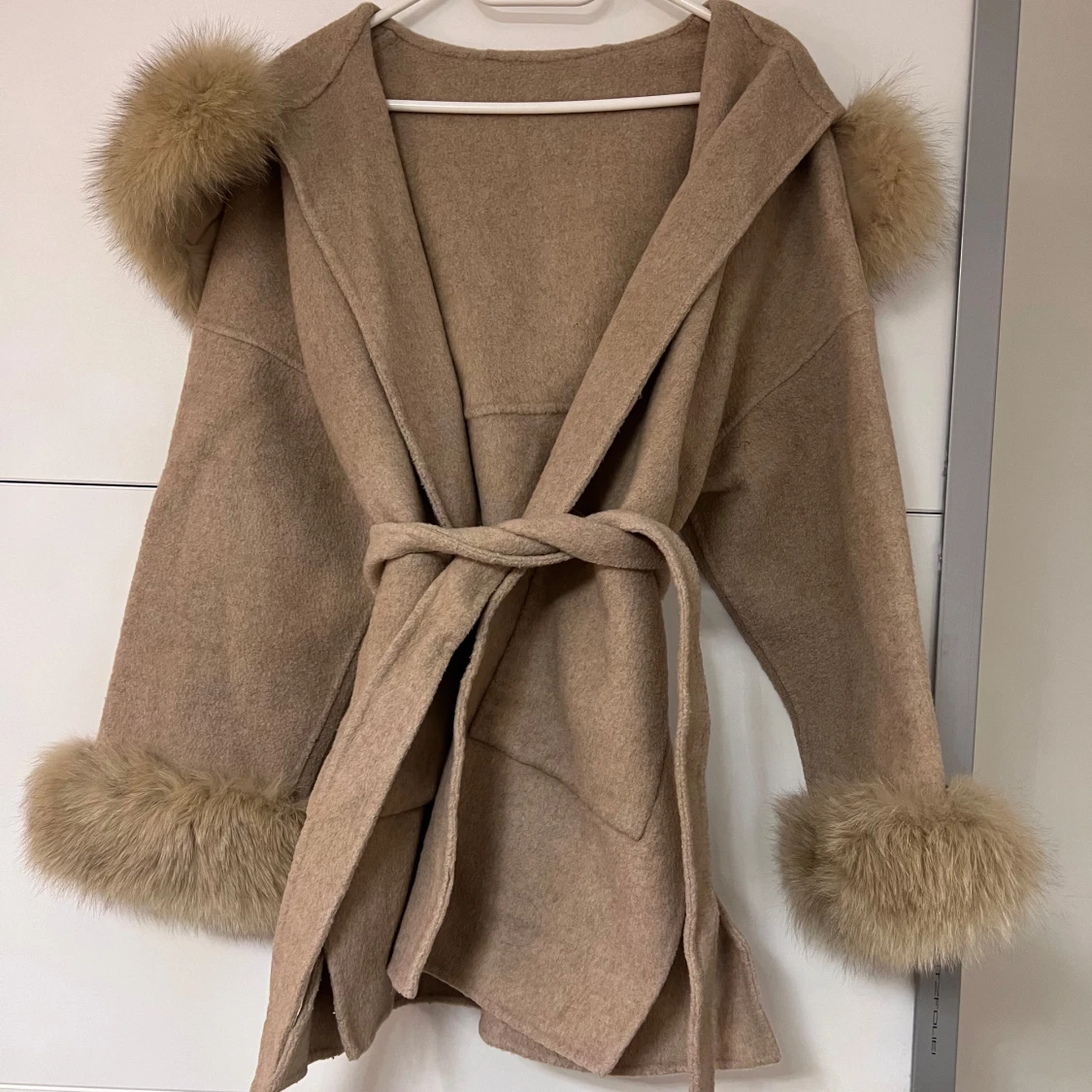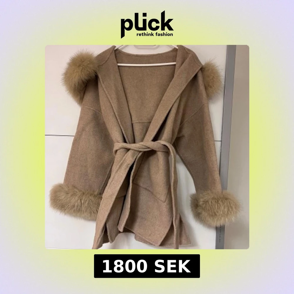 Snygg brun/beige kappa med pälsdetaljer på huva och ärmslut. Kappan har en knytning i midjan för en elegant look. Perfekt för kyliga dagar när du vill hålla stilen.