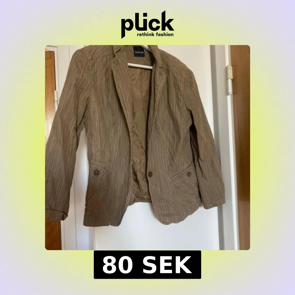 Säljer en beige kavaj från Taifun Collection med randigt mönster. Kavajen har två framfickor med knappar och klassisk krage. Materialet känns lätt och passar perfekt till vår och höst.