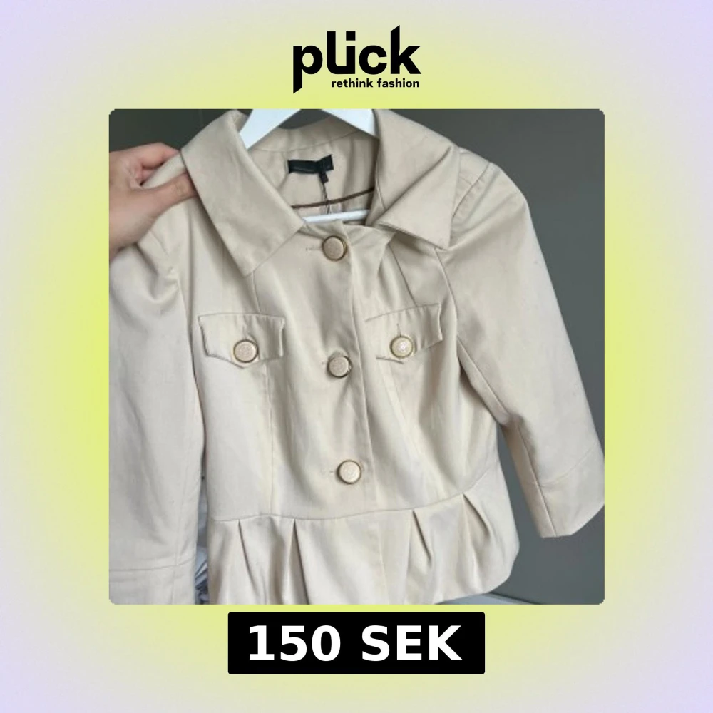 Stilren beige kavajjacka från Vero Moda med markerad krage, dekorativa ficklock och stora guldiga knappar framtill. Jackan har veckad nederkant och trekvartsärmar för en trendig look.