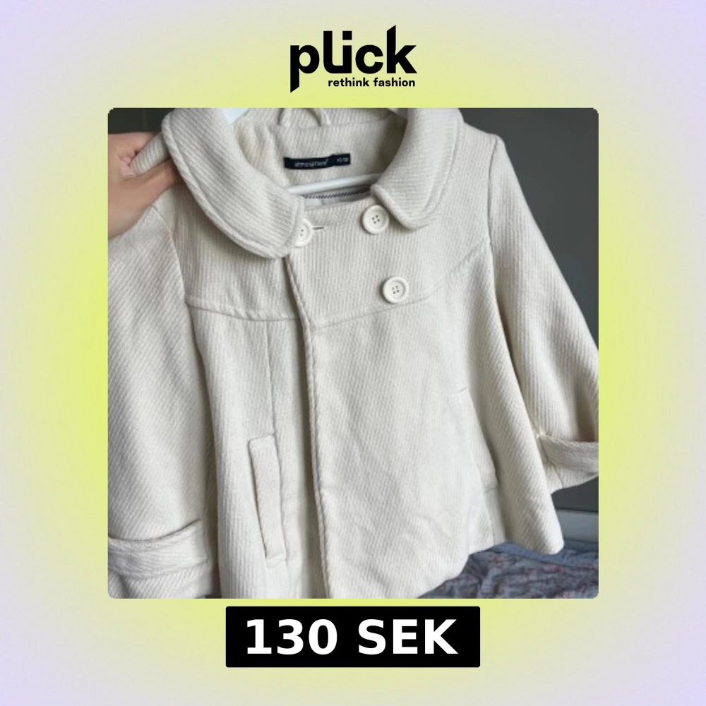 Säljer en beige kort kappa från Atmosphere med stora knappar framtill och bred krage. Jackan har fickor på sidorna och dekorativ detalj bak. Perfekt för vår och höst.