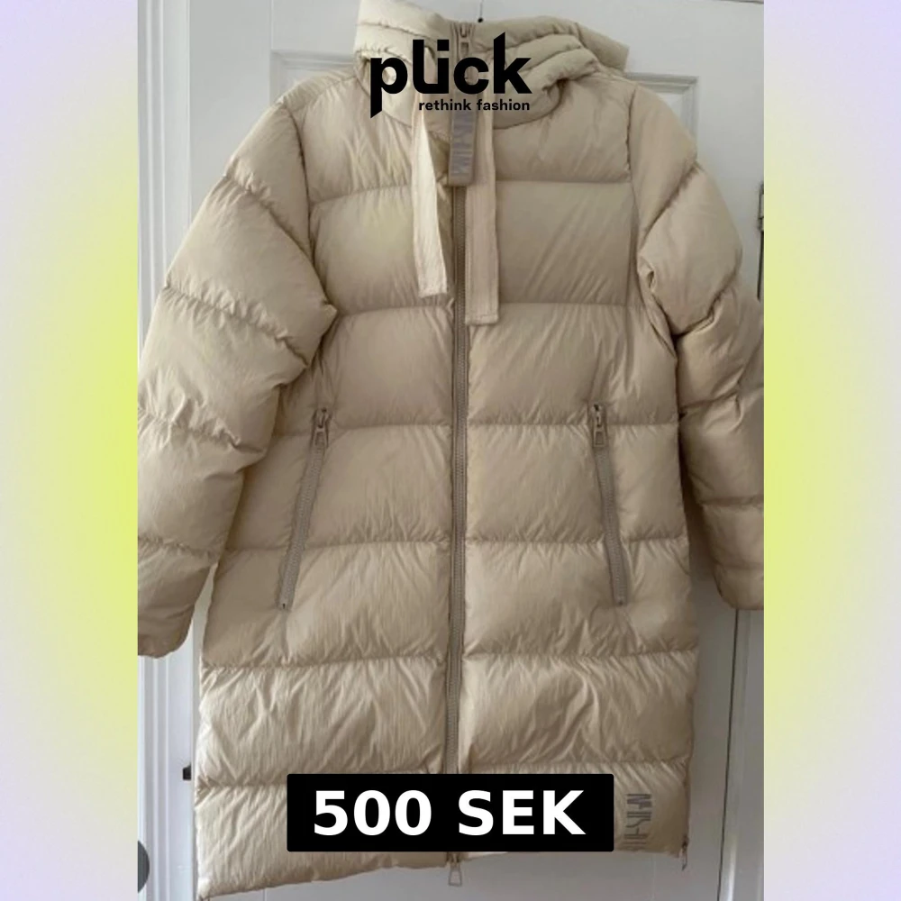 Lång beige dunjacka från Pernilla Wahlgren med huva och breda kanaler. Jackan har dragkedja framtill, två snedställda fickor med dragkedja och ribbade snören i huvan. Perfekt för kalla dagar och ger en riktigt chill vibe.