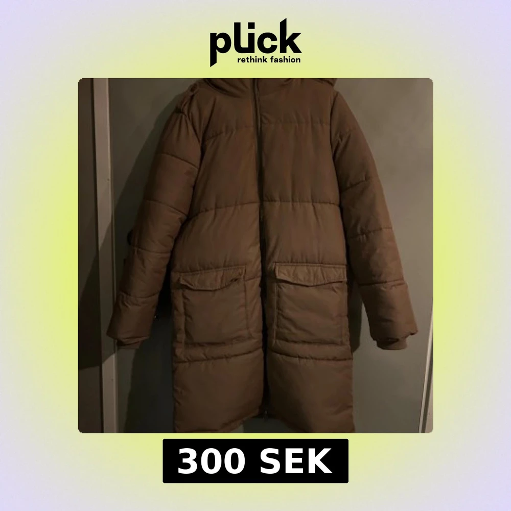 Säljer en brun pufferjacka med huva och stora fickor framtill. Strl M. Från Object.