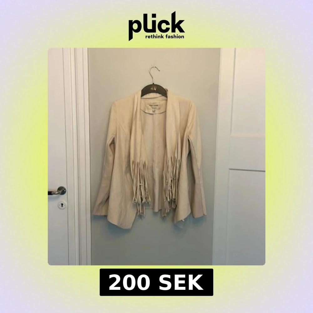 Säljer en beige jacka från River Island i mjuk mockaimitation med långa fransar framtill. Jackan har lång ärm, dragkedjor vid ärmslut och en snygg, lite figursydd passform. Perfekt för dig som vill ha en cool och trendig look.