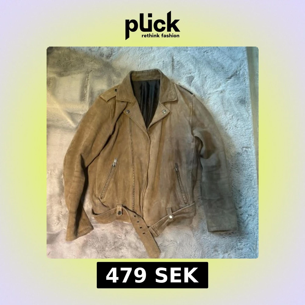 Snygg beige mockajacka med dragkedja och bälte i midjan. Jackan har långa ärmar och en klassisk bikerstil med snedställd dragkedja och två fickor med dragkedjor framtill.