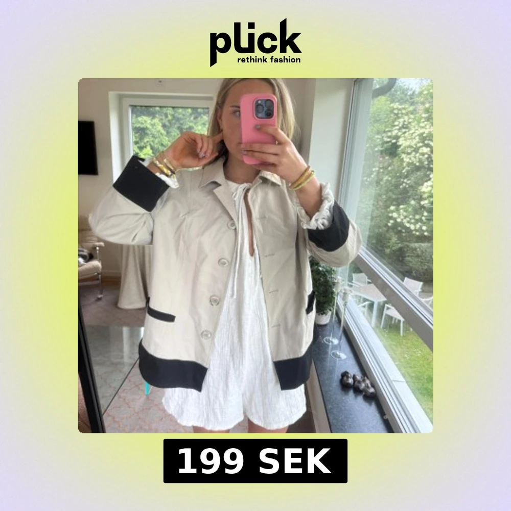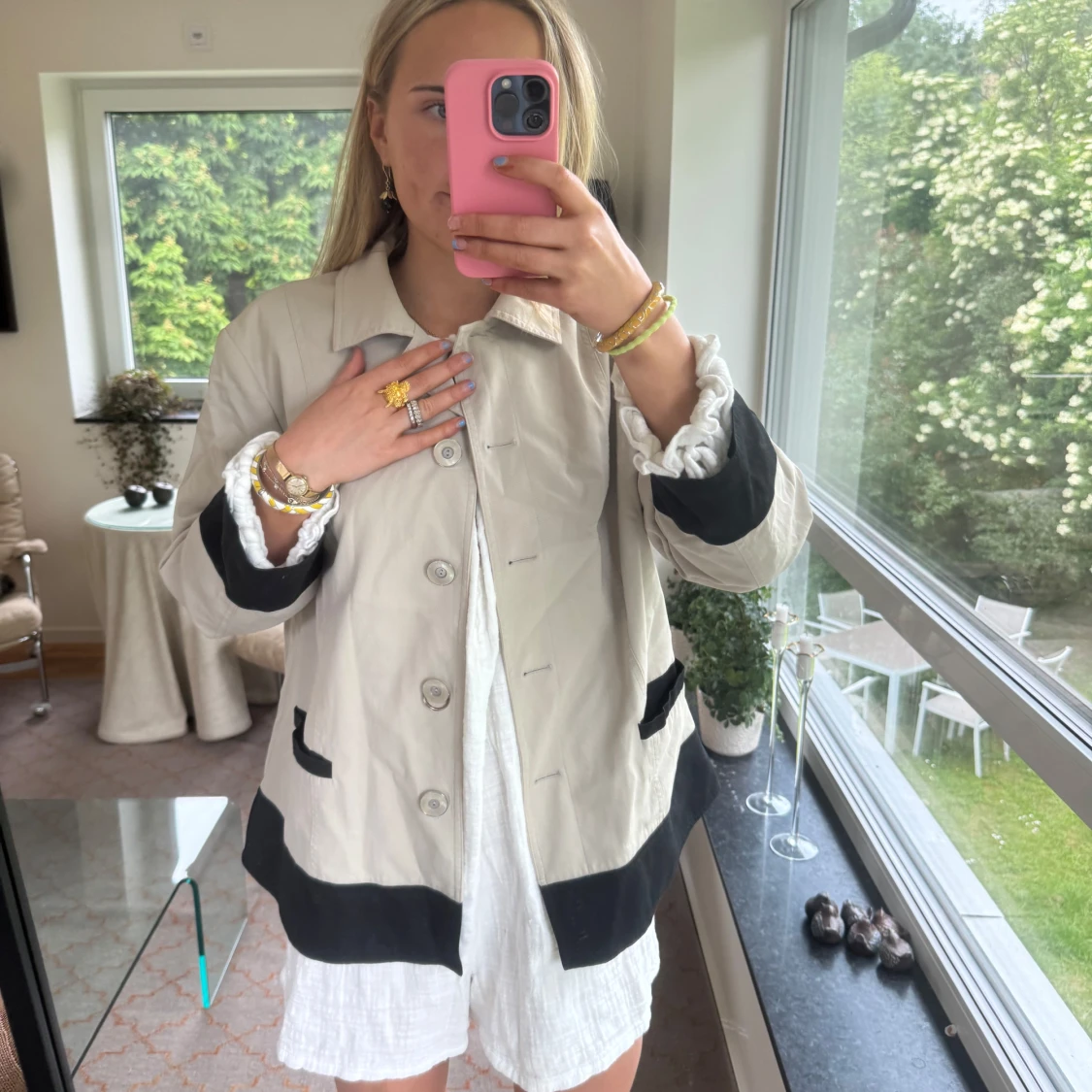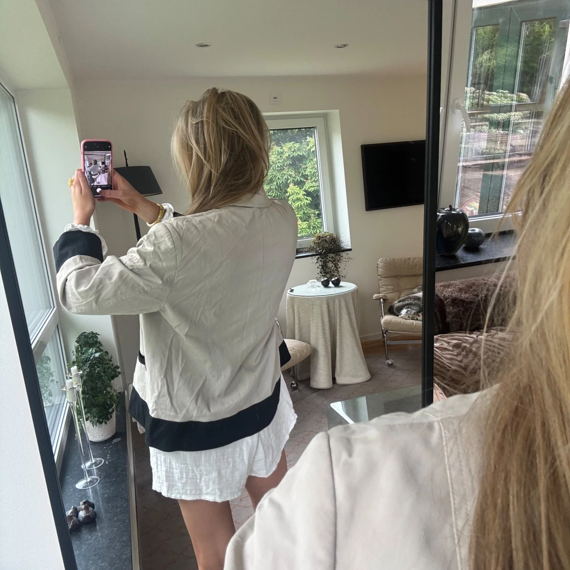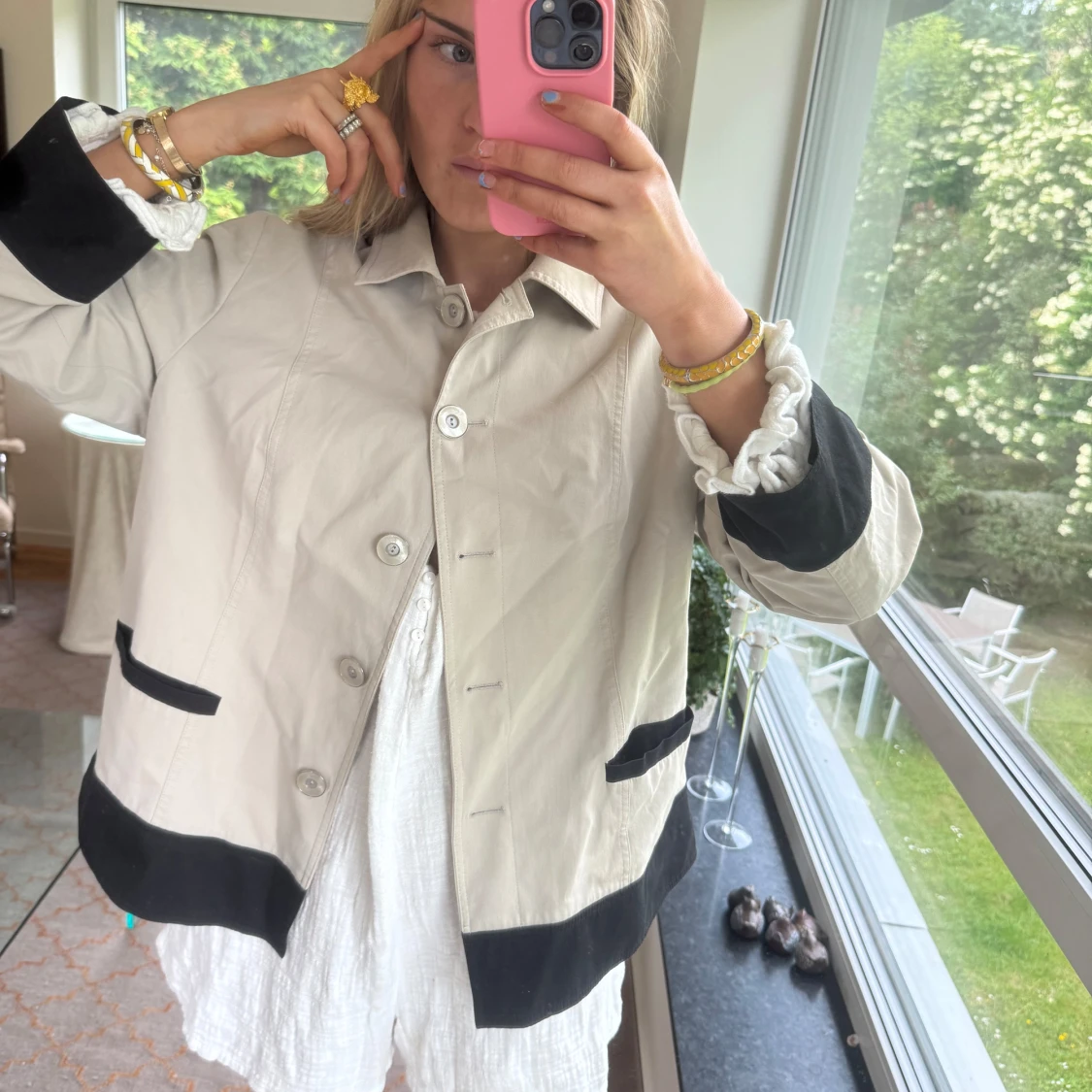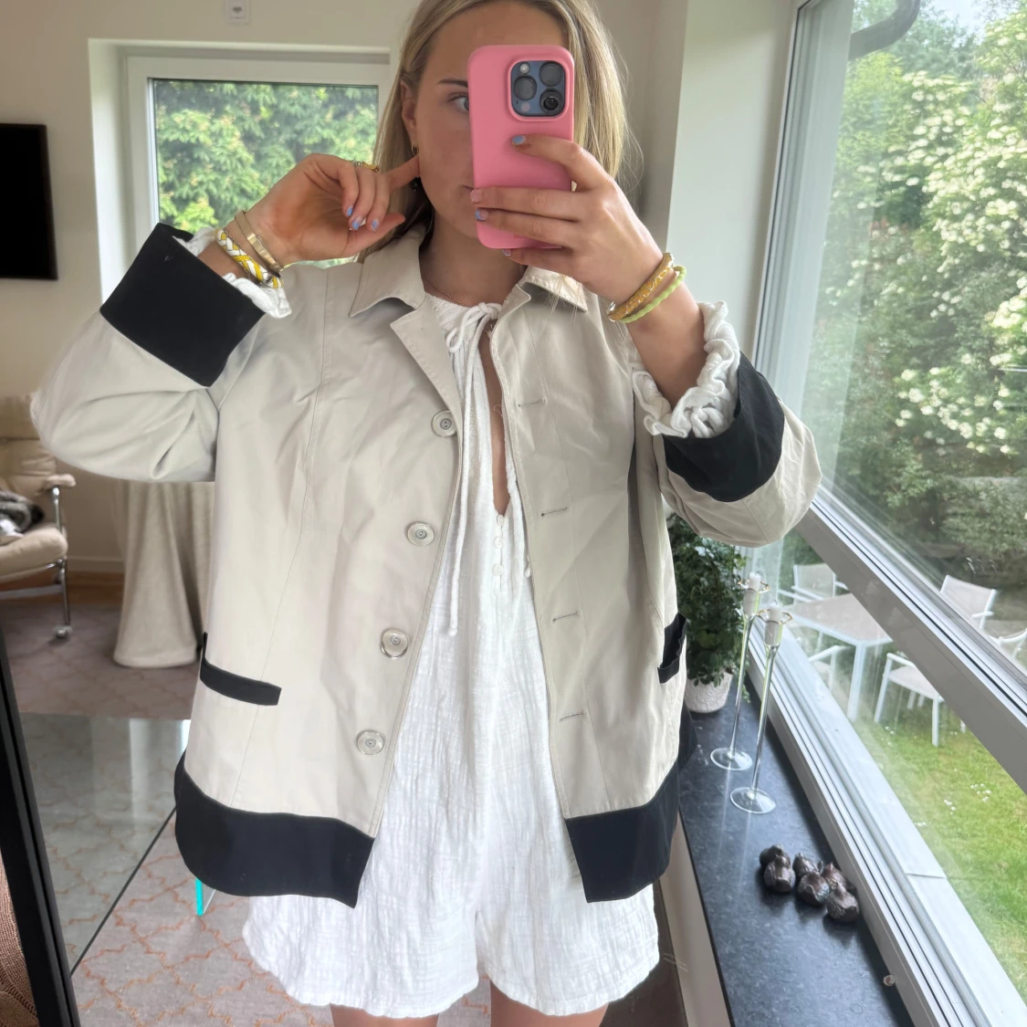 Säljer en beige rock med svarta detaljer på ärmslut, fickor och nederkant. Jackan har klassisk krage, knäppning framtill med knappar och två fickor. Modellen är rak och lite loose, perfekt för dig som gillar stilren och enkel design.