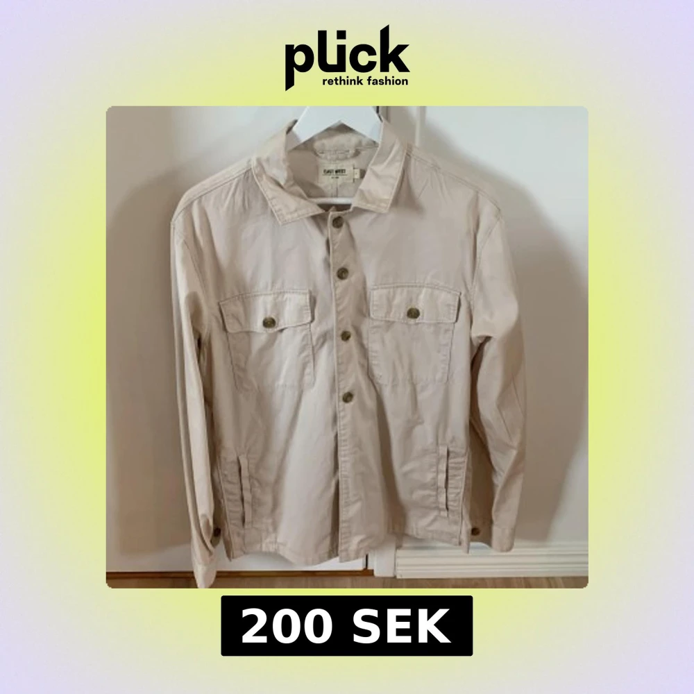 Säljer en stilren beige overshirt från East West. Jackan är i 100% bomull, har två bröstfickor med knappar och klassisk krage. Perfekt lager-på-lager-plagg med snygga detaljer som knappar framtill och vid ärmslut.