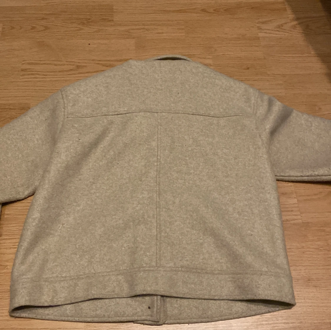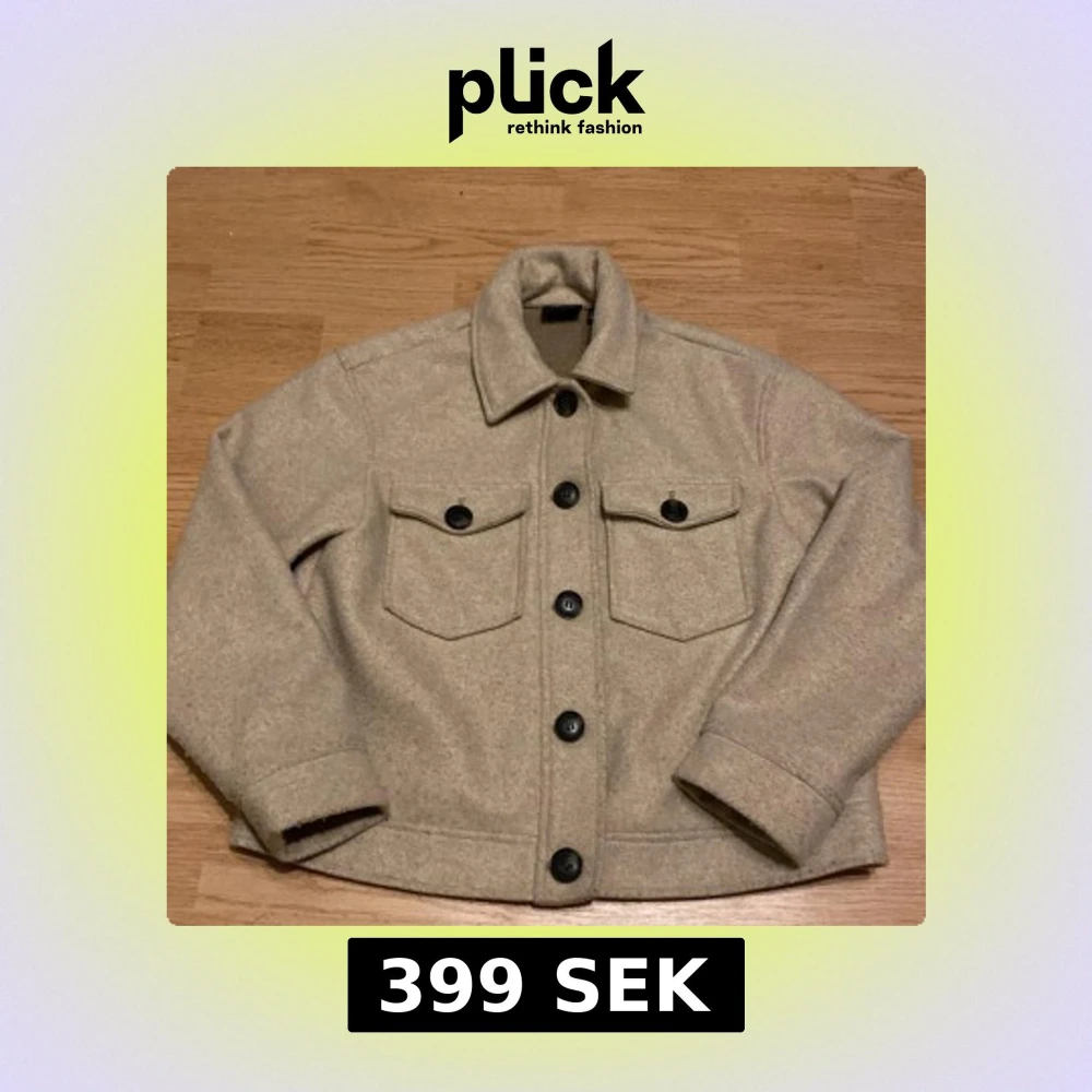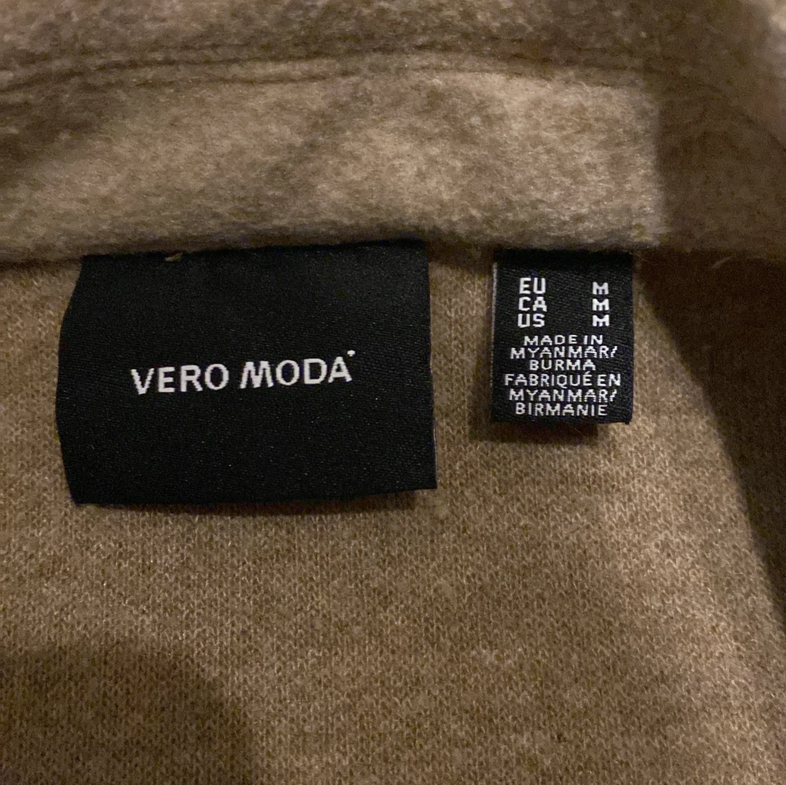 Säljer en beige overshirt från Vero Moda med klassisk krage och fyra stora svarta knappar framtill. Jackan har två bröstfickor med lock och knappar samt långa ärmar. Perfekt för lager-på-lager-stil under höst och vår.