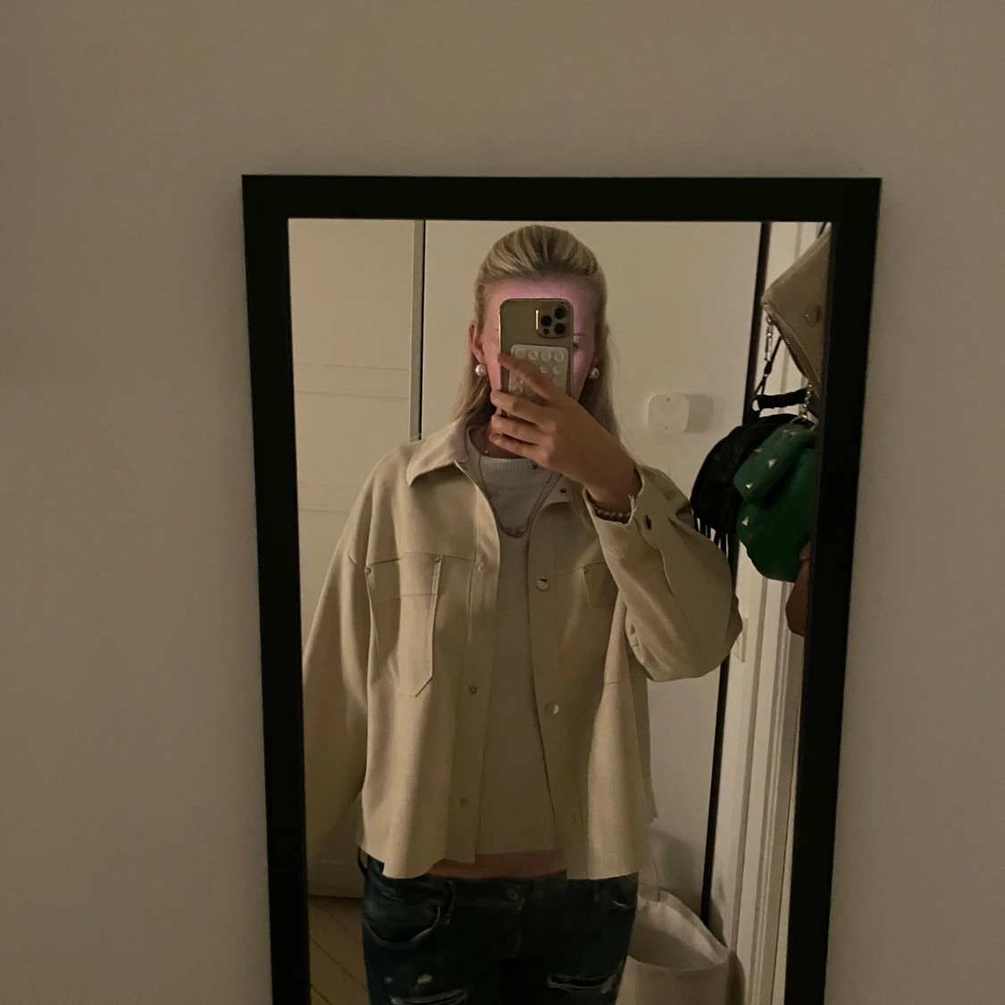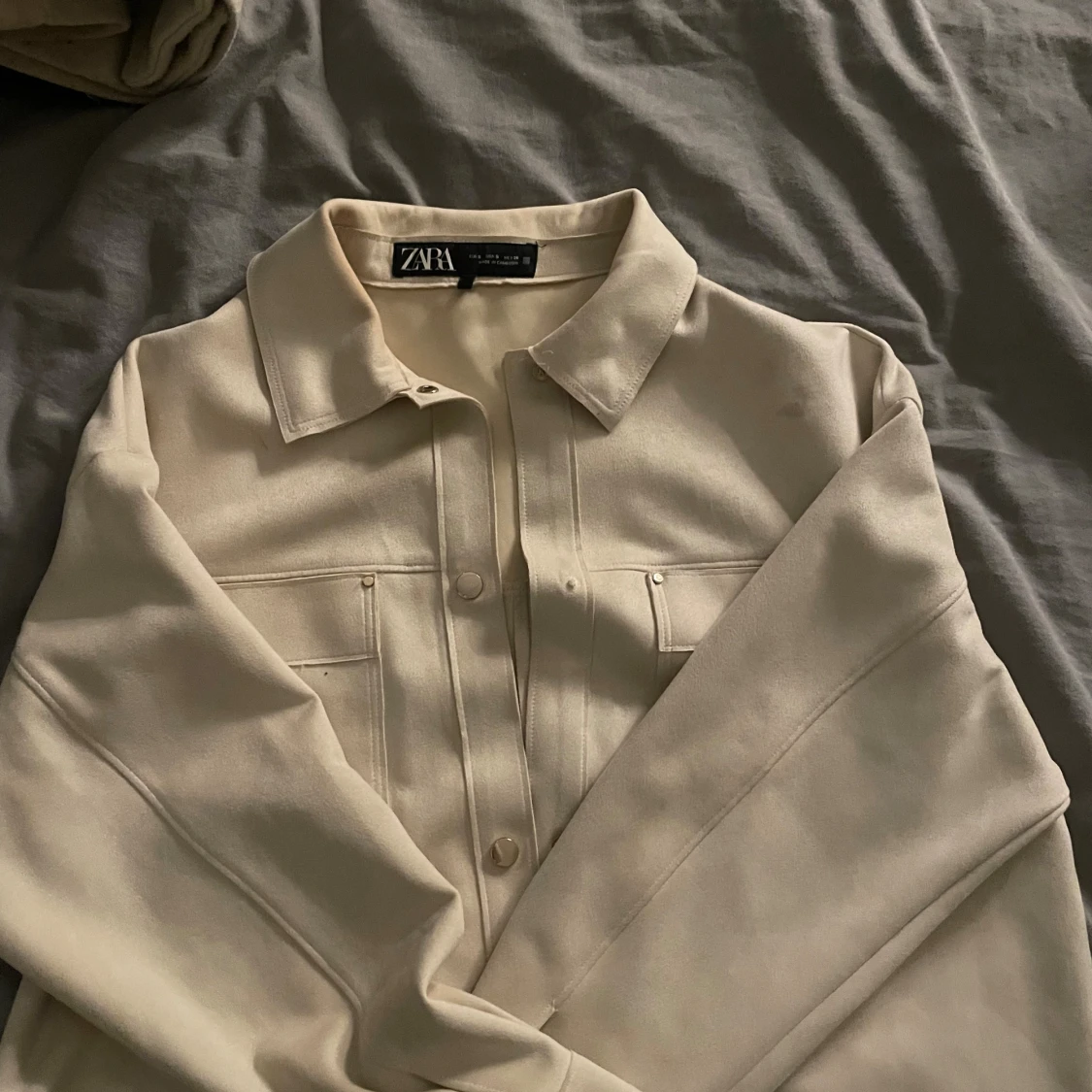 Snygg beige overshirt från Zara med klassisk krage och två bröstfickor. Jackan har knappar framtill och är i ett mjukt material som känns skönt mot huden. Perfekt att slänga över en hoodie eller t-shirt. Säljer pga den inte används längre, skriv vid frågor eller intresse 🥰