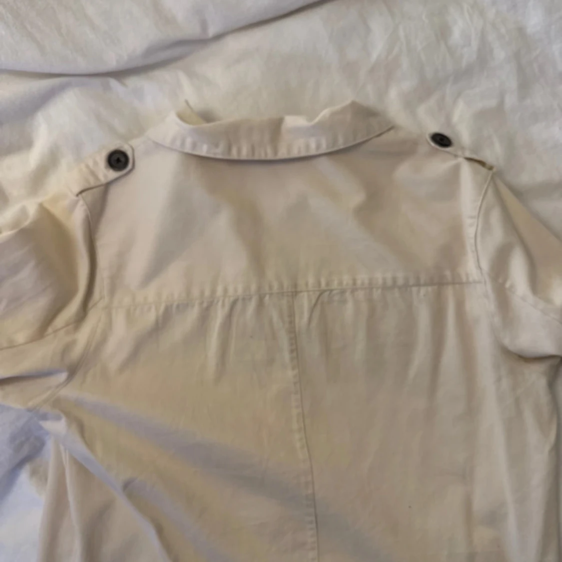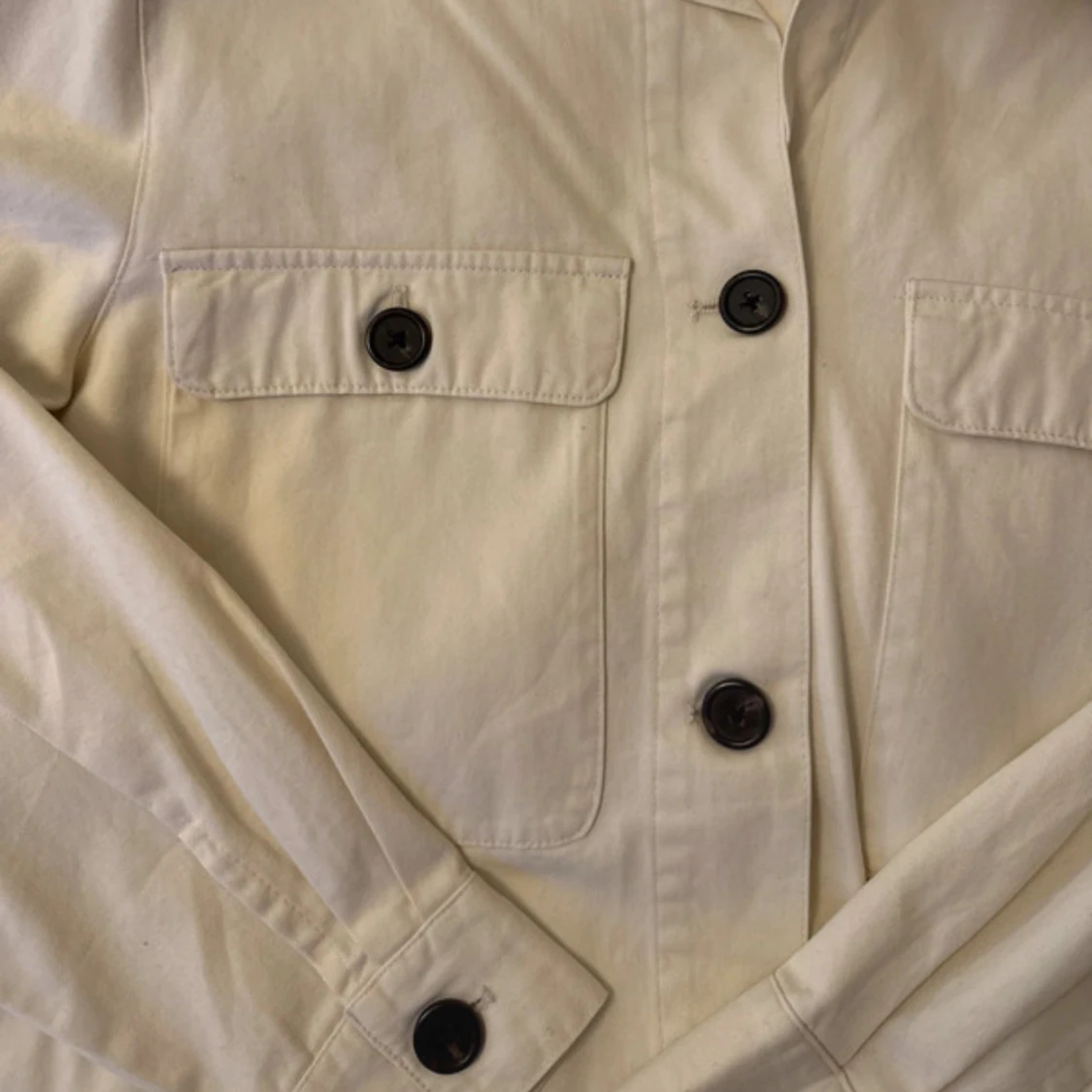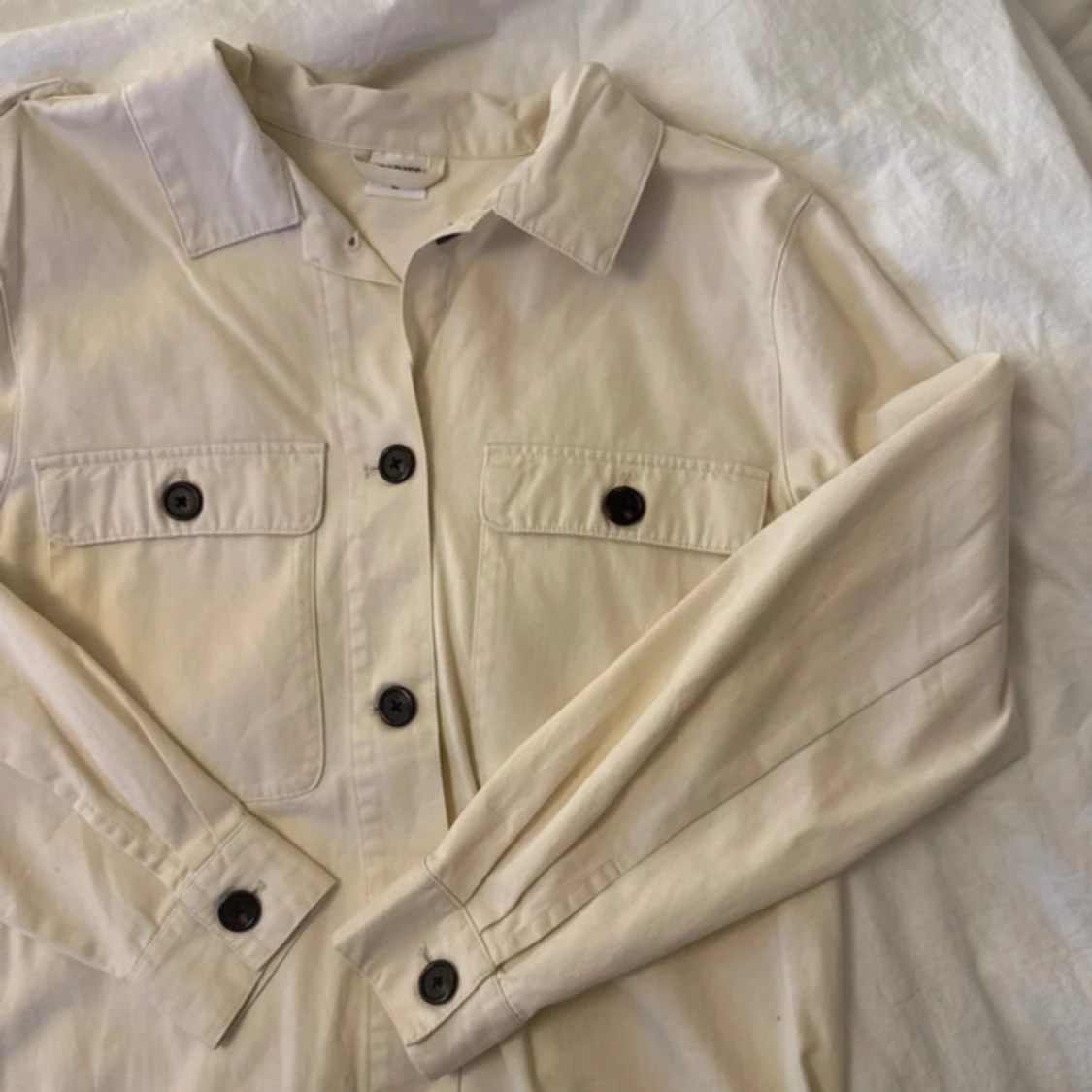 Snygg beige overshirt med klassisk krage och svarta knappar framtill. Jackan har två bröstfickor med lock och knapp, samt knappar vid ärmslut och axlar. Tillverkad i bomull, perfekt för lager-på-lager och chill stil. Sitter mer som en M