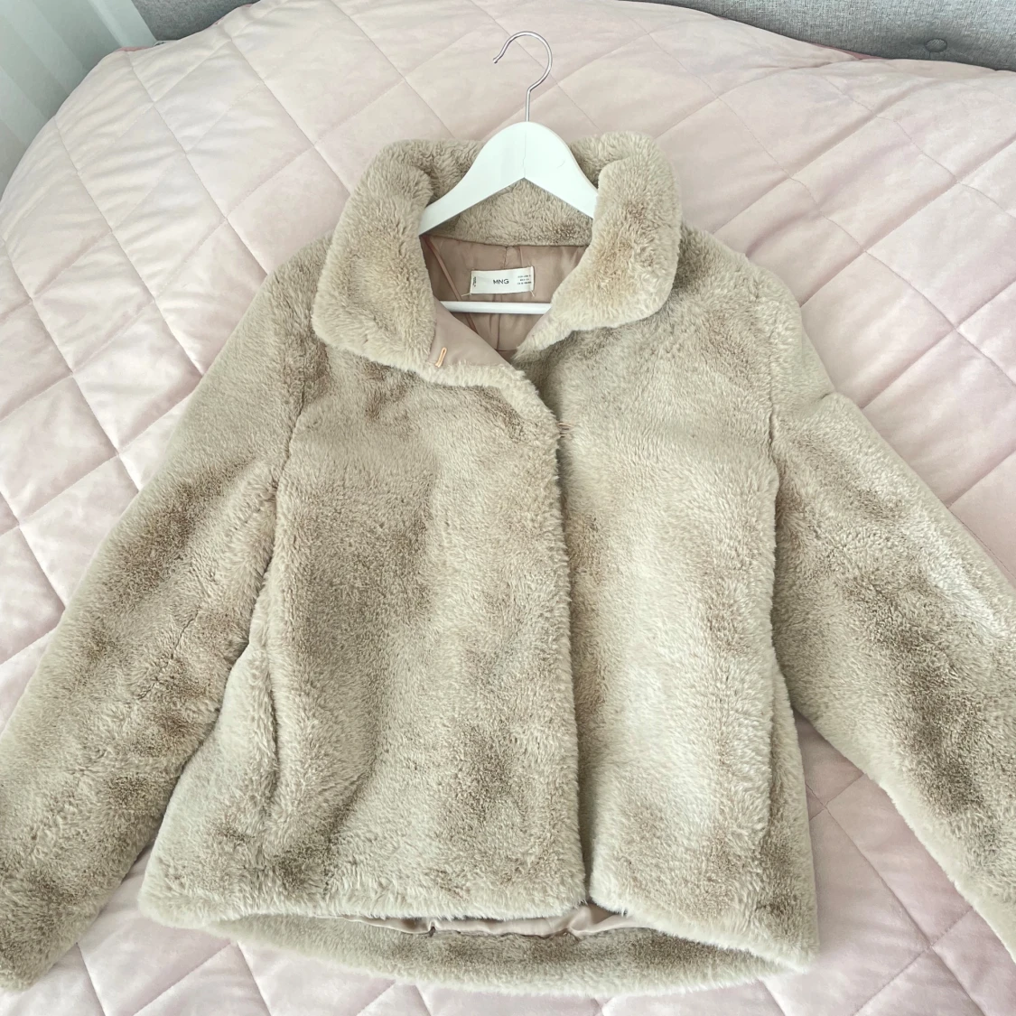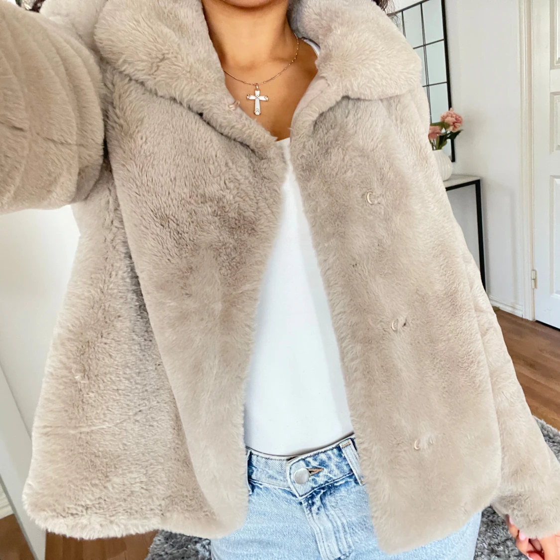 Skön och fin beige pälsjacka perfekt för lite kyliga dagar! Säljer den på grund av att den inte har varit till användning.
