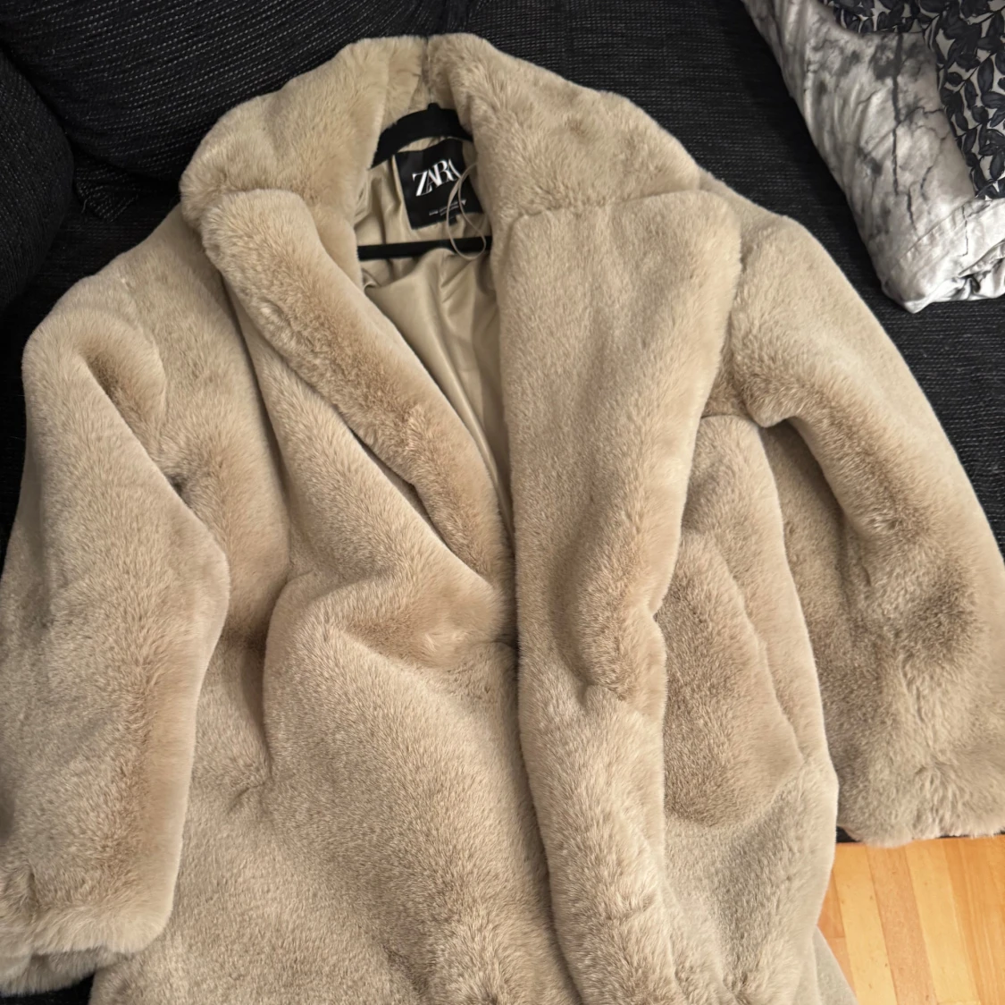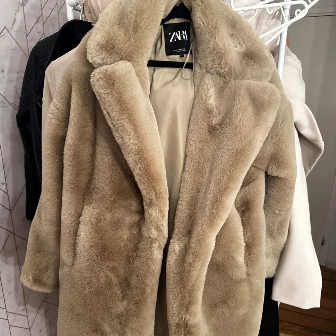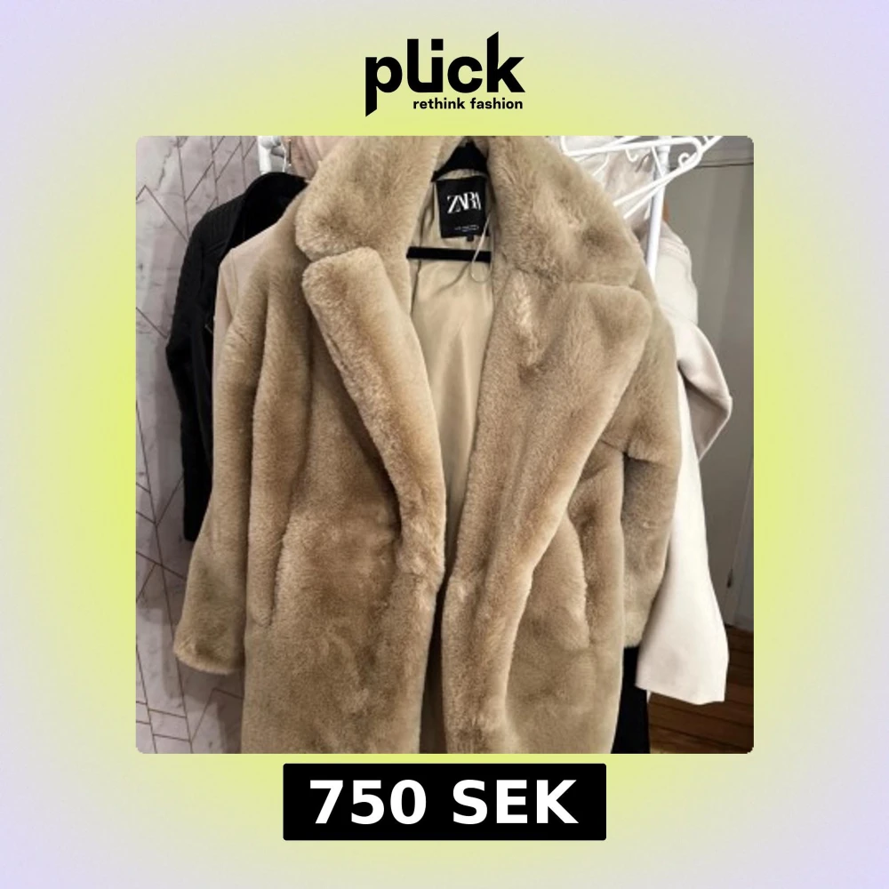 Supermjuk och fluffig beige pälsjacka från Zara med bred krage och helfodrad insida.