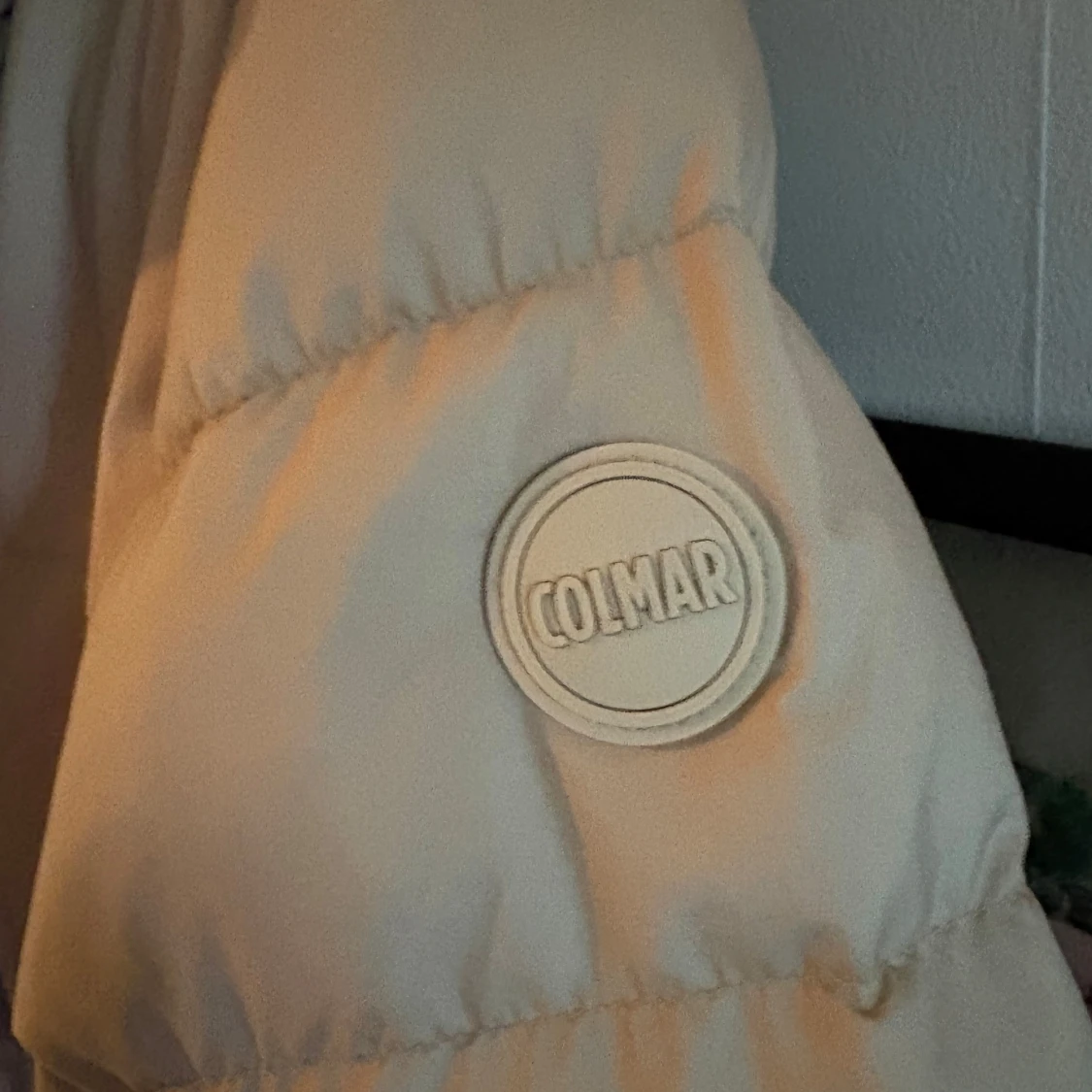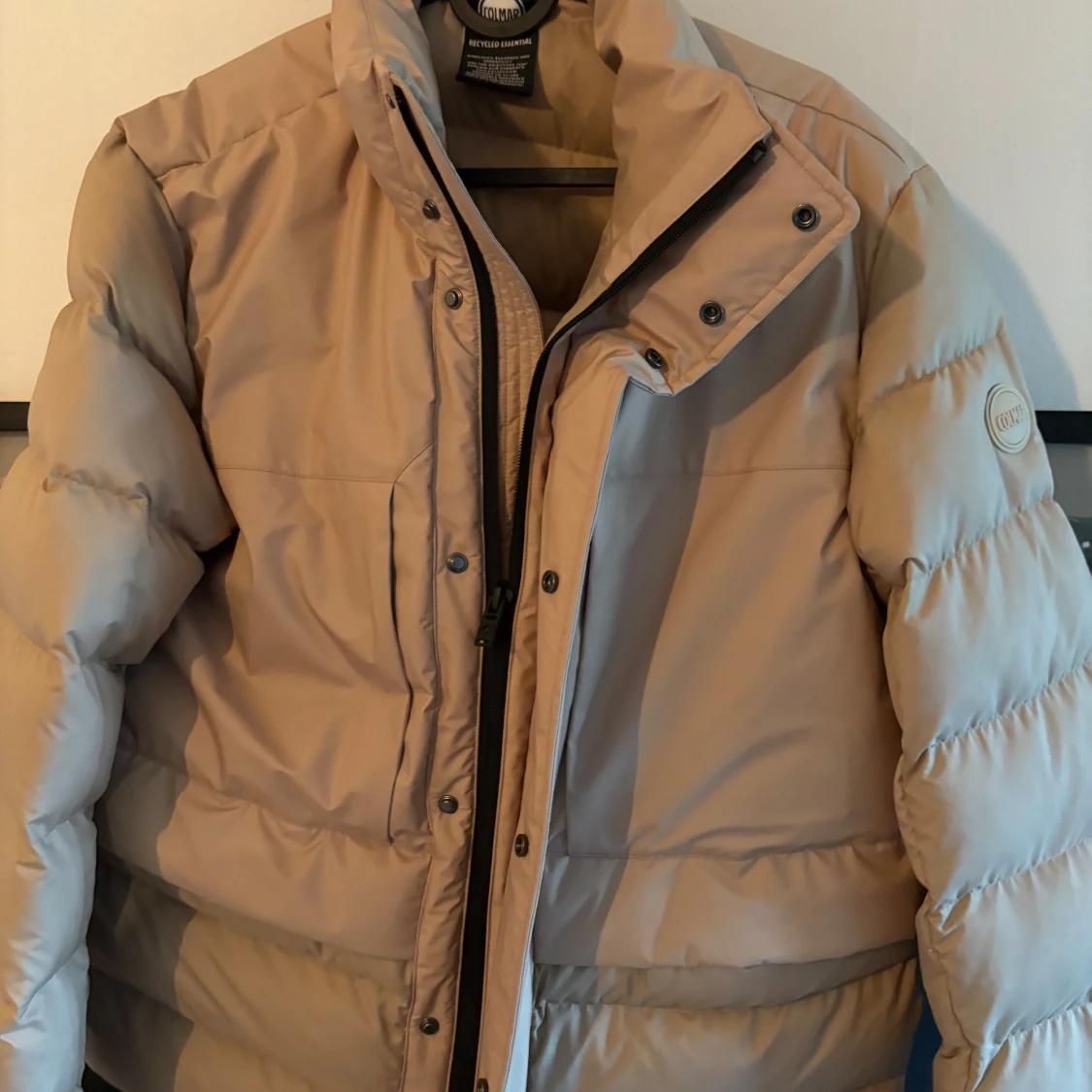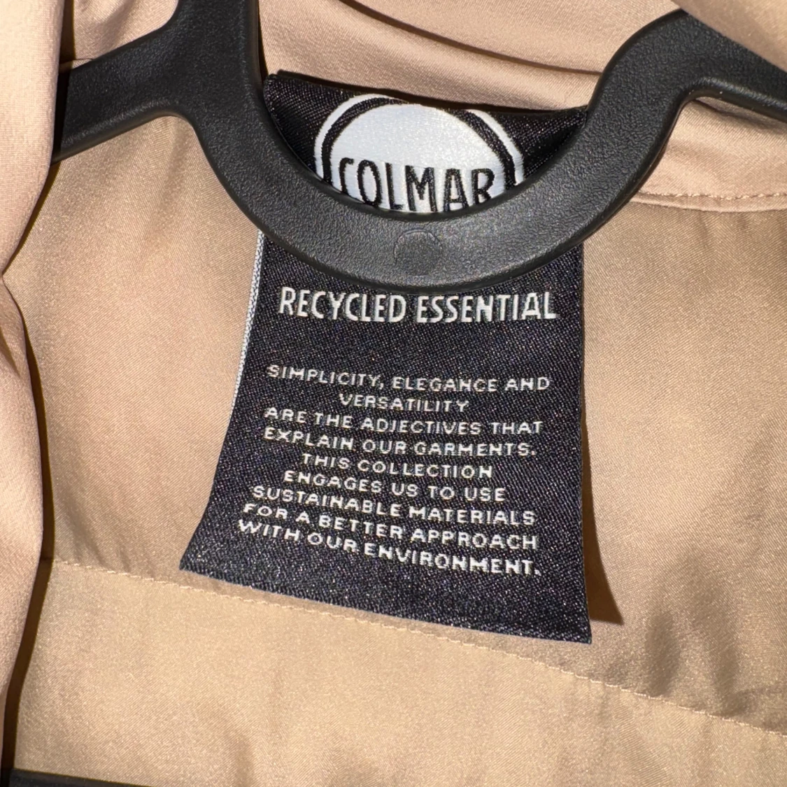 Snygg beige pufferjacka från Colmar med hög krage och diskret logga på ärmen. Jackan har dragkedja och tryckknappar framtill, samt två stora fickor. Tillverkad i polyester från Recycled Essential-kollektionen. Perfekt för kalla dagar och riktigt trendig stil. Ny pris ca 6 tusen
