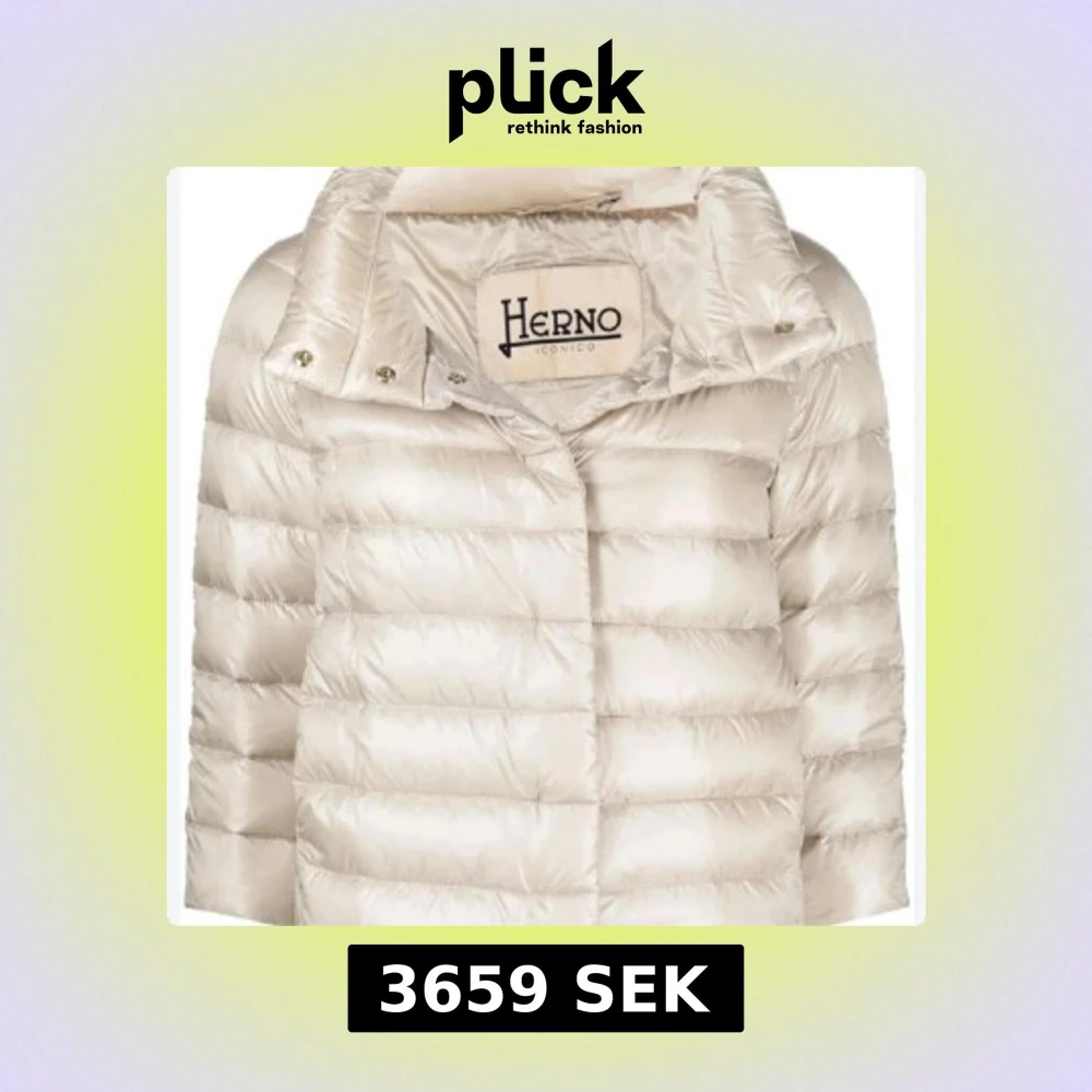Snygg beige pufferjacka från Herno Iconico med glansig finish och bred krage. Jackan har horisontella sömmar, trekvartsärmar och dold knäppning framtill. Perfekt för dig som vill ha en lätt och trendig jacka med exklusiv känsla.storlek 40IT vilket motsvarar typ S lappen medkommer använd en gång