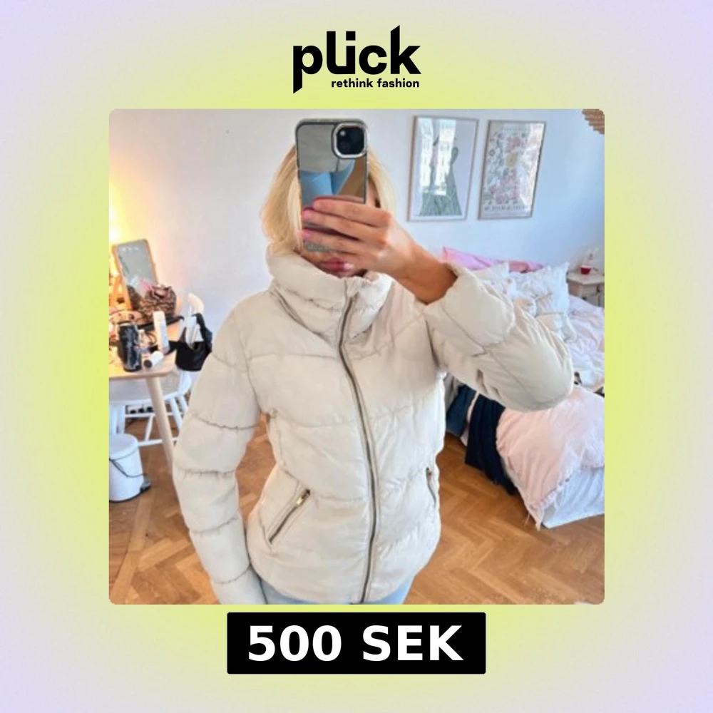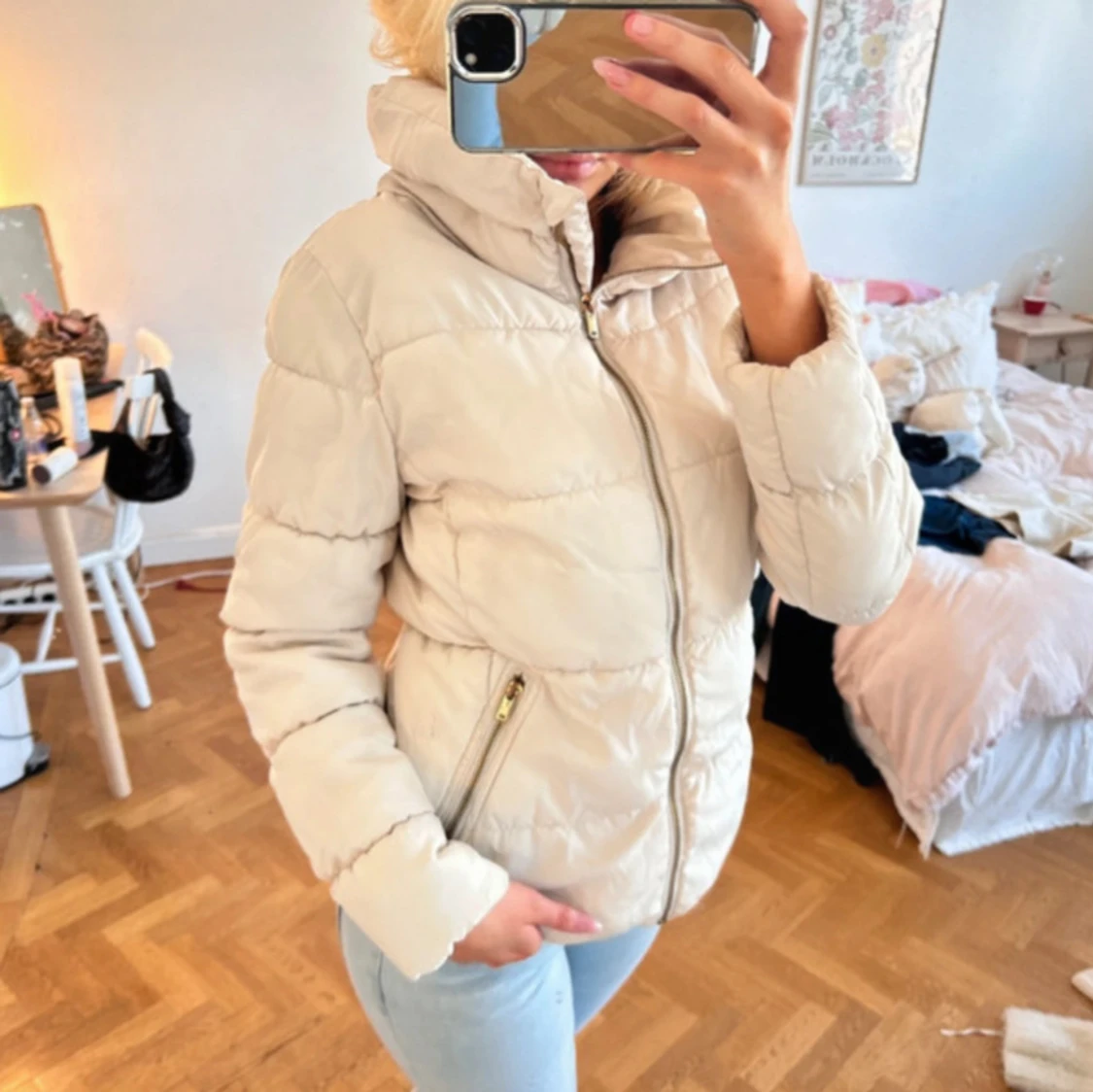 Snygg beige pufferjacka med hög krage och guldiga dragkedjor på fickorna. Perfekt jacka för höst och vinter💕💕