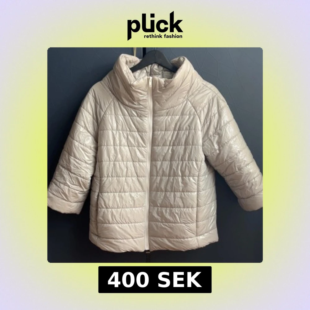 Säljer en grå pufferjacka med hög krage och dragkedja framtill. Jackan har quiltad design och trekvartsärm, vilket ger en modern look. Perfekt för kyliga dagar när du vill vara både varm och snygg.