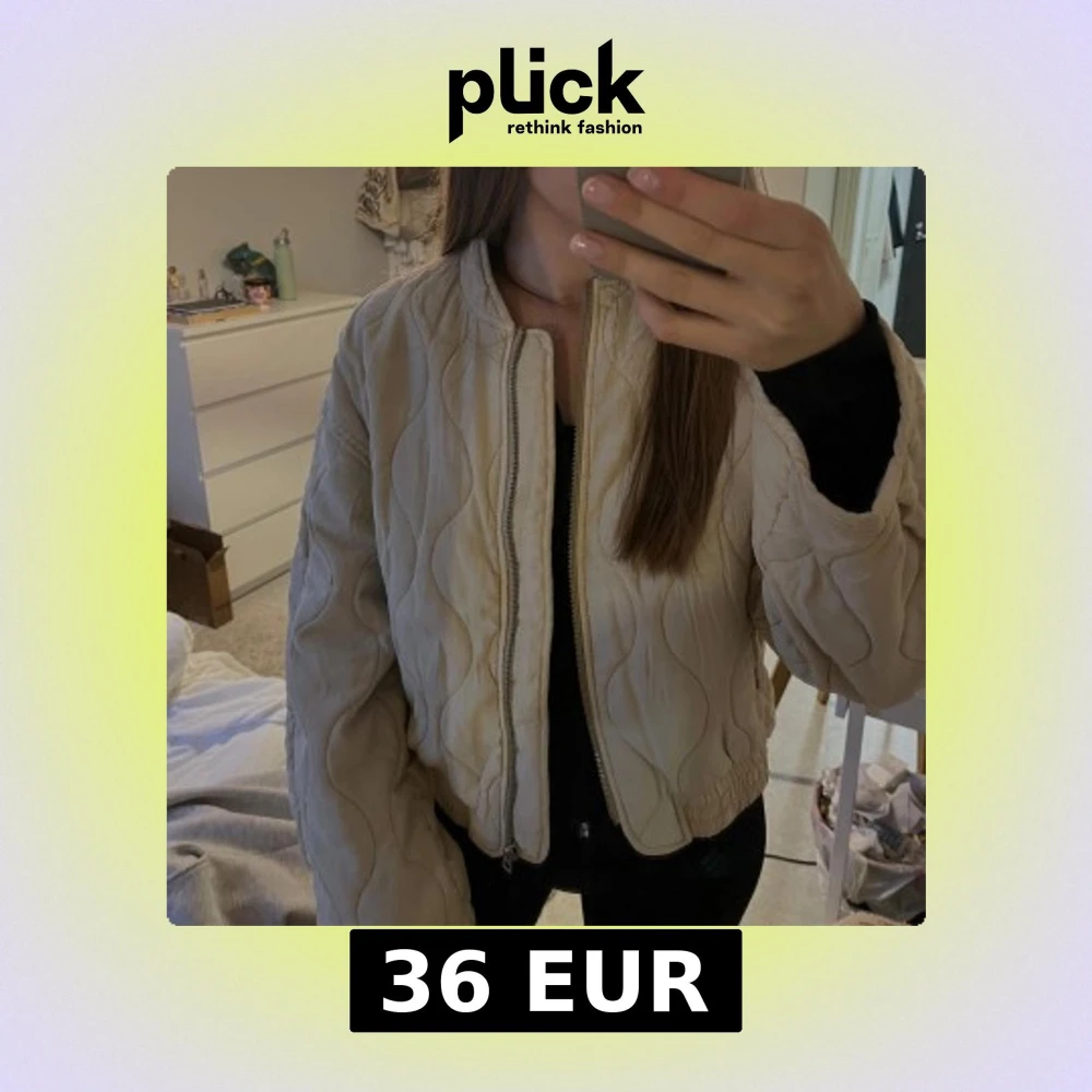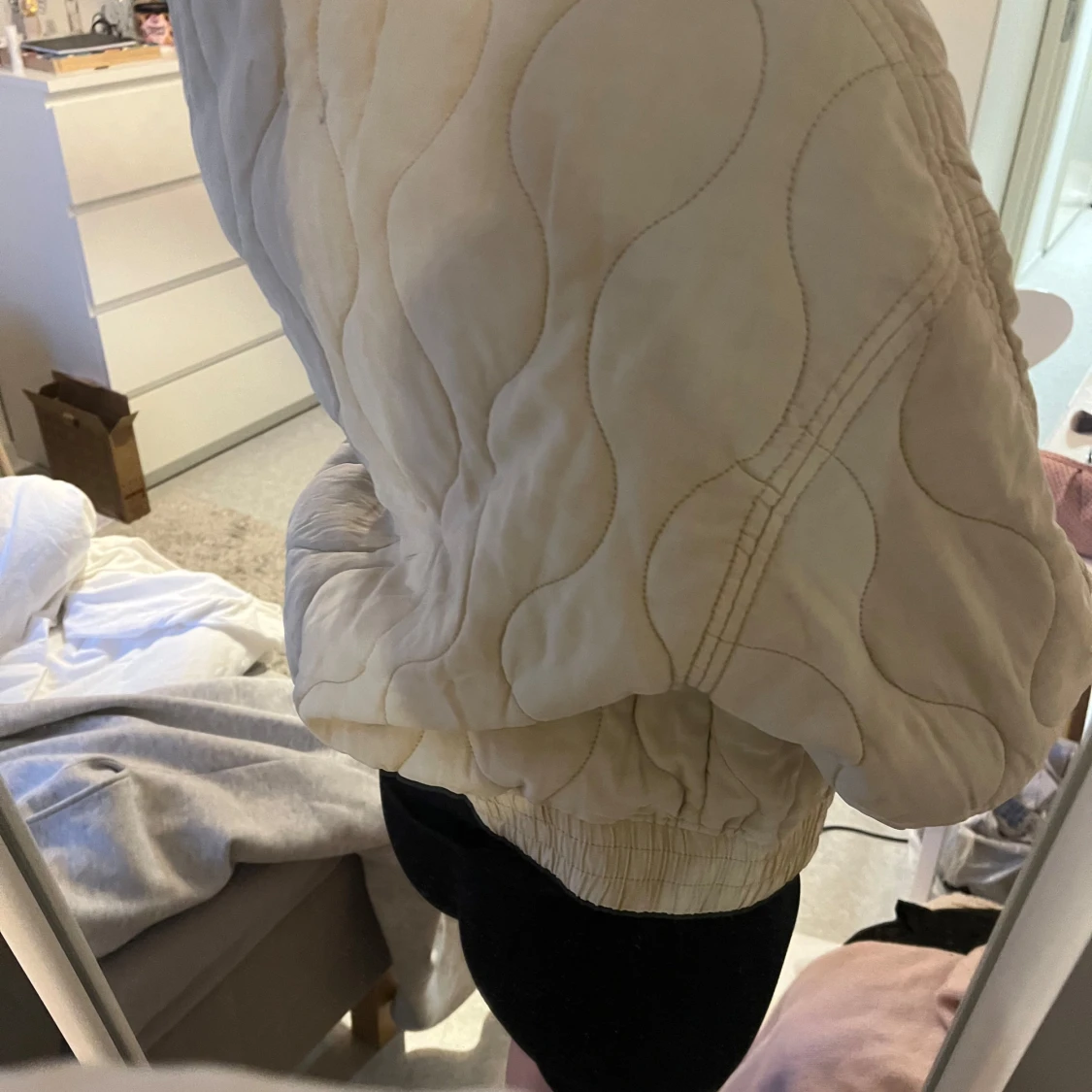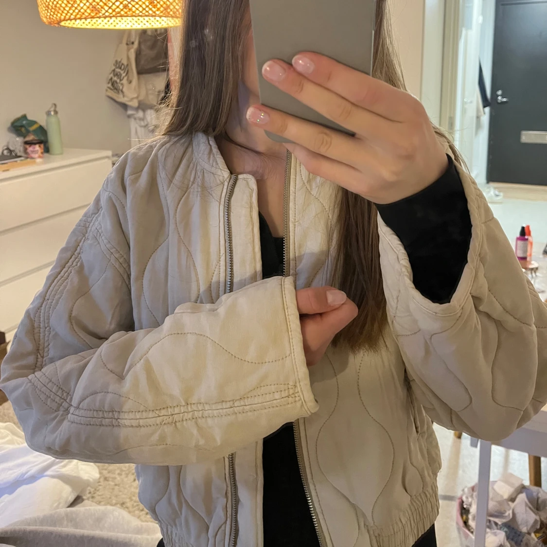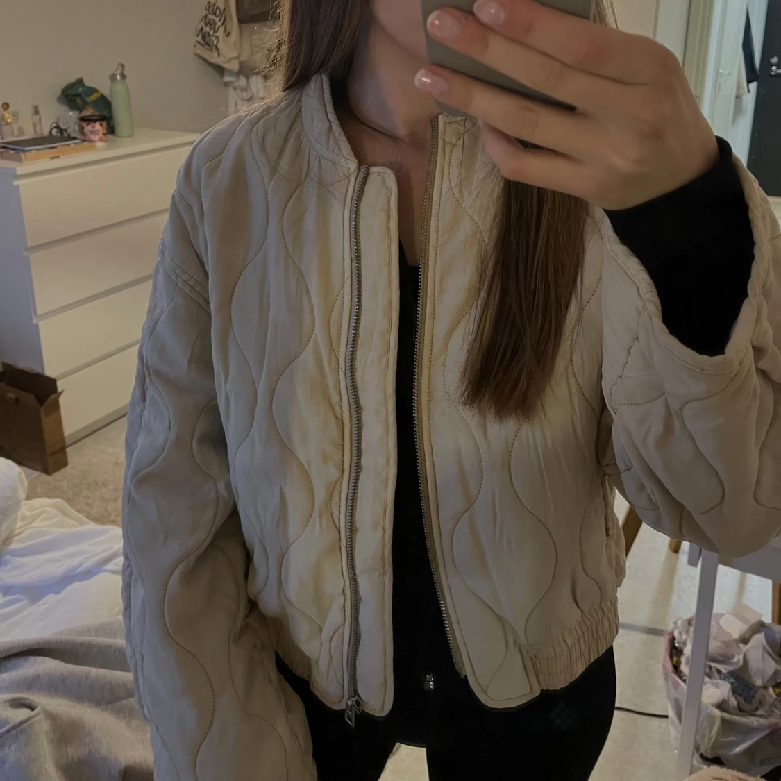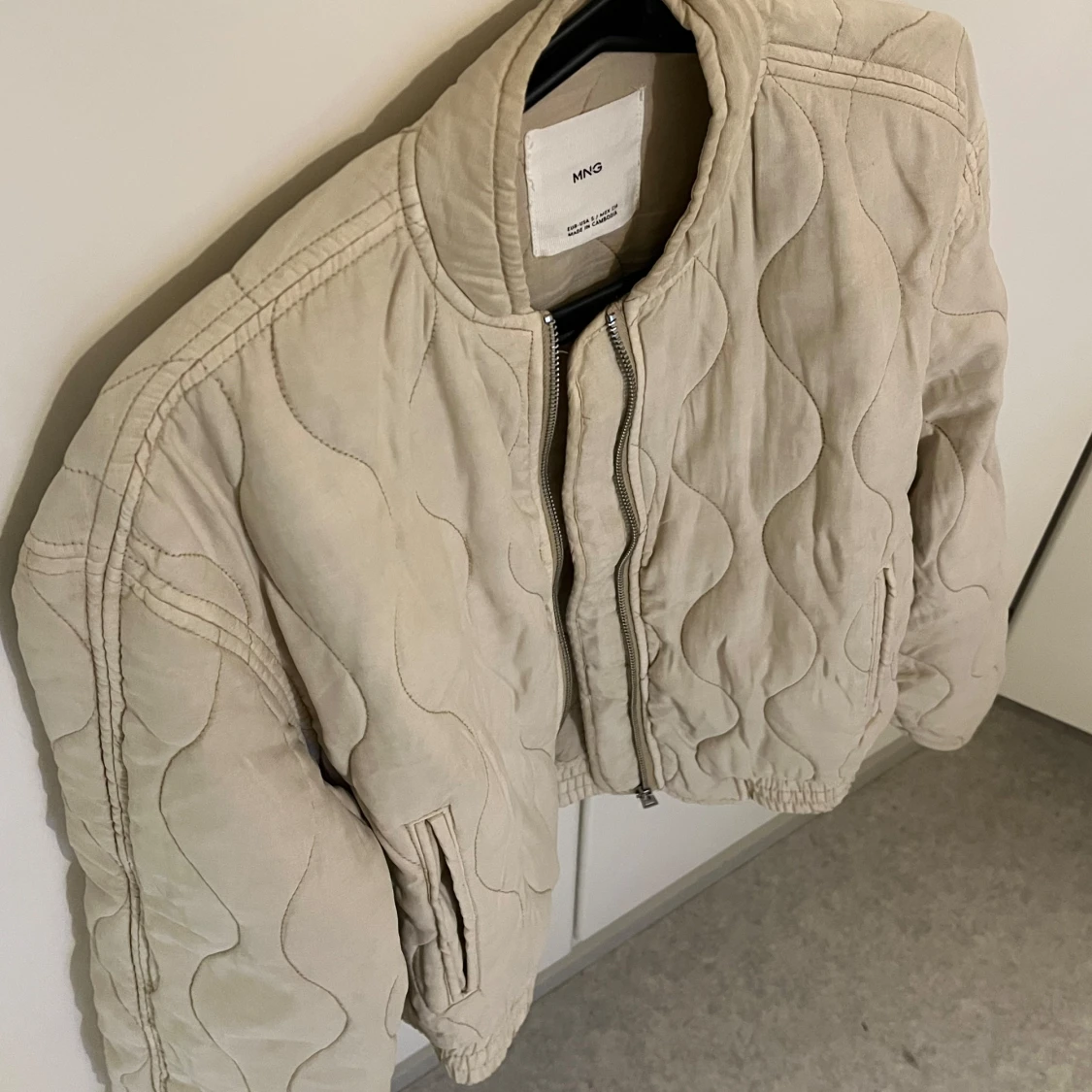 Quiltad beige bomberjacka från Mango med vågigt mönster i sömmarna. Jackan har dragkedja framtill, elastiskt band fram och baktill, även framfickor. Felfri och i gott skick! Köpt härifrån, passade inte mig helt så därför jag säljer 💕