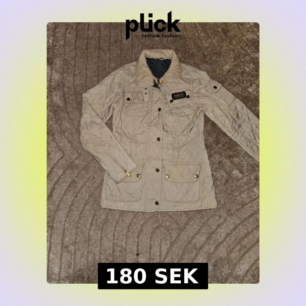 Snygg beige quiltad jacka från Barbour International med klassisk krage, guldfärgade knappar och dragkedja. Jackan har flera fickor med lock och Barbour-logga på bröstet. Perfekt för dig som gillar stilren och tidlös design. Lite trådar på sista bild vid ficka annars väldigt fin
