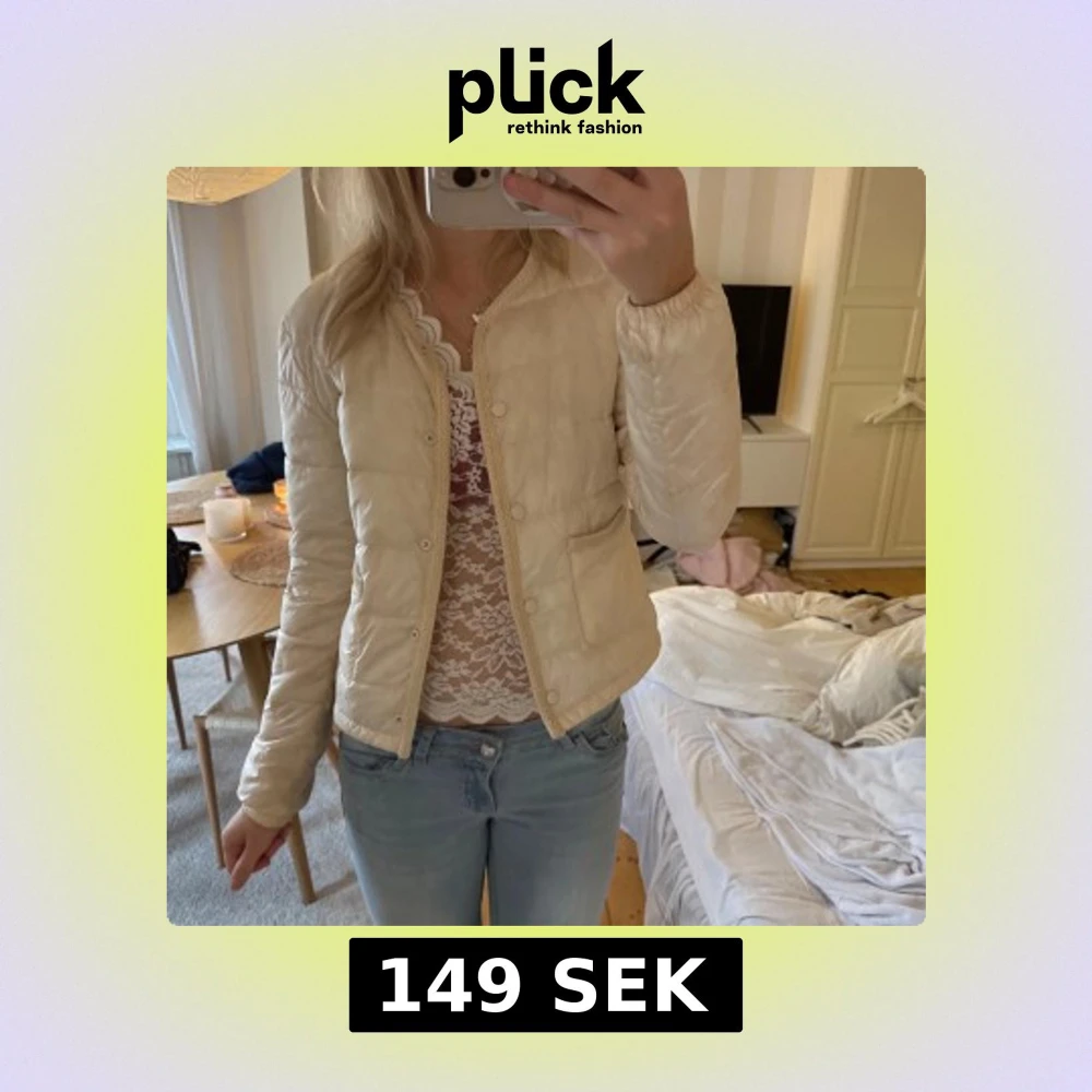 Säljer en beige pufferjacka med quiltad design och rund hals. Jackan har tryckknappar framtill och två fickor med snygga kantdetaljer. Lätt vadderad och perfekt för dig som gillar en clean och chill look. Passar till jeans och layering. Jag är en s men passar säker xs också