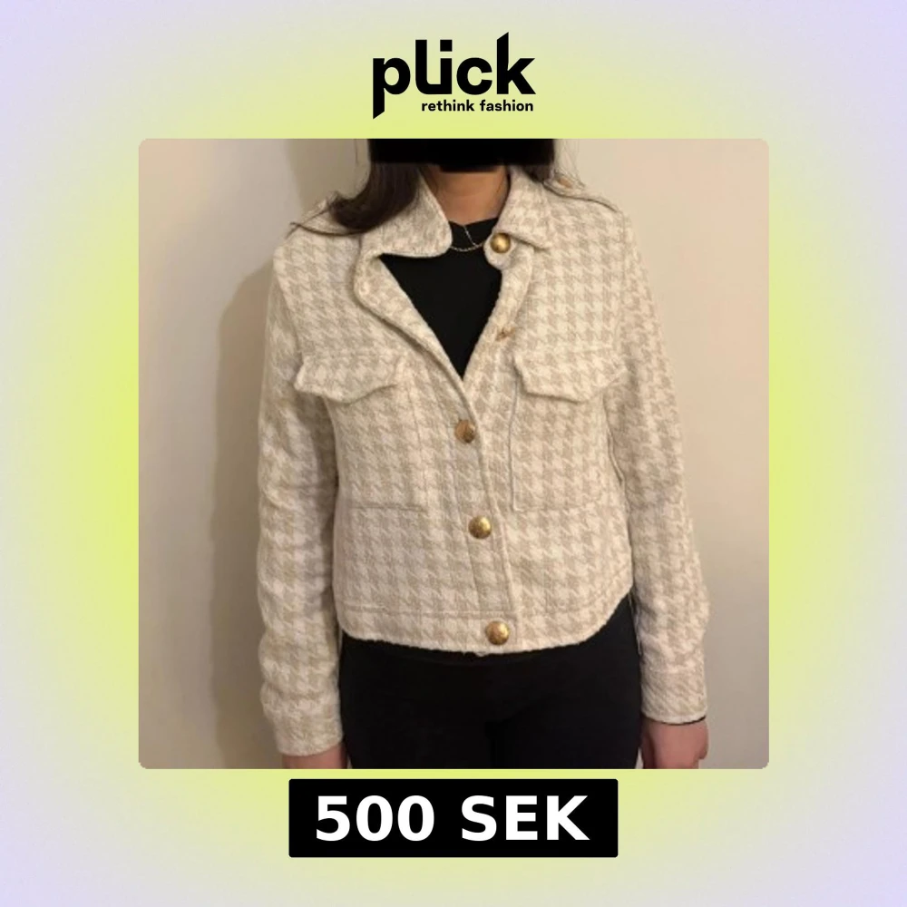 Snygg beige jacka med rutigt mönster och stiliga guldknappar. Jackan har en klassisk krage och två bröstfickor med lock. Perfekt för att ge en elegant touch till din outfit. Köpt från Zara