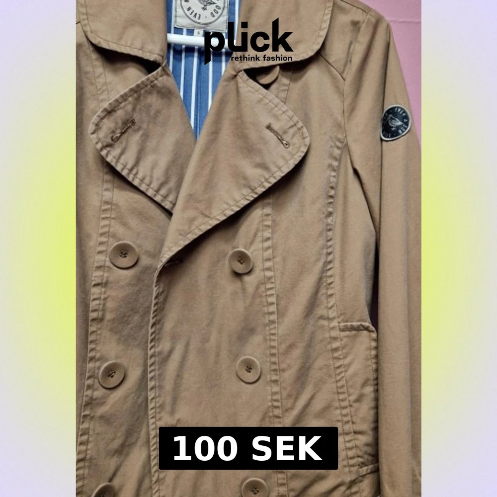Snygg beige skepparkavaj från Even & Odd med klassisk dubbelknäppning och bred krage. Jackan har ett coolt tygmärke på ärmen och är tillverkad i bomull. Insidan har blåvita ränder som ger extra stilpoäng. Perfekt för dig som gillar tidlös look.